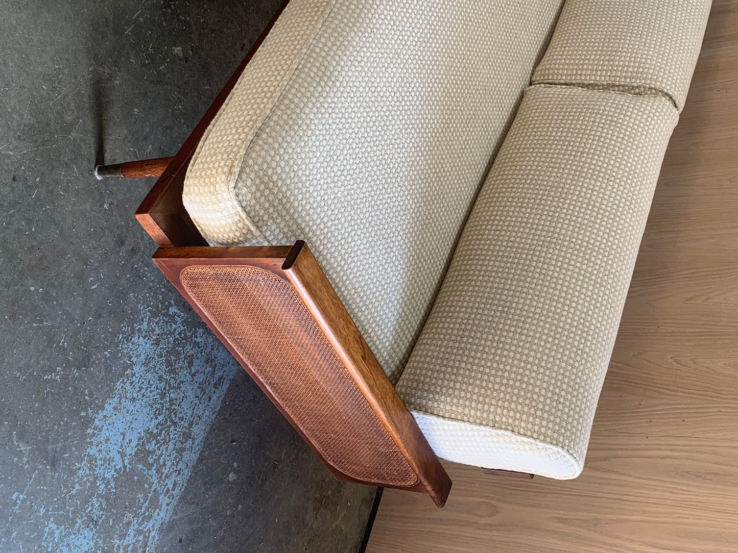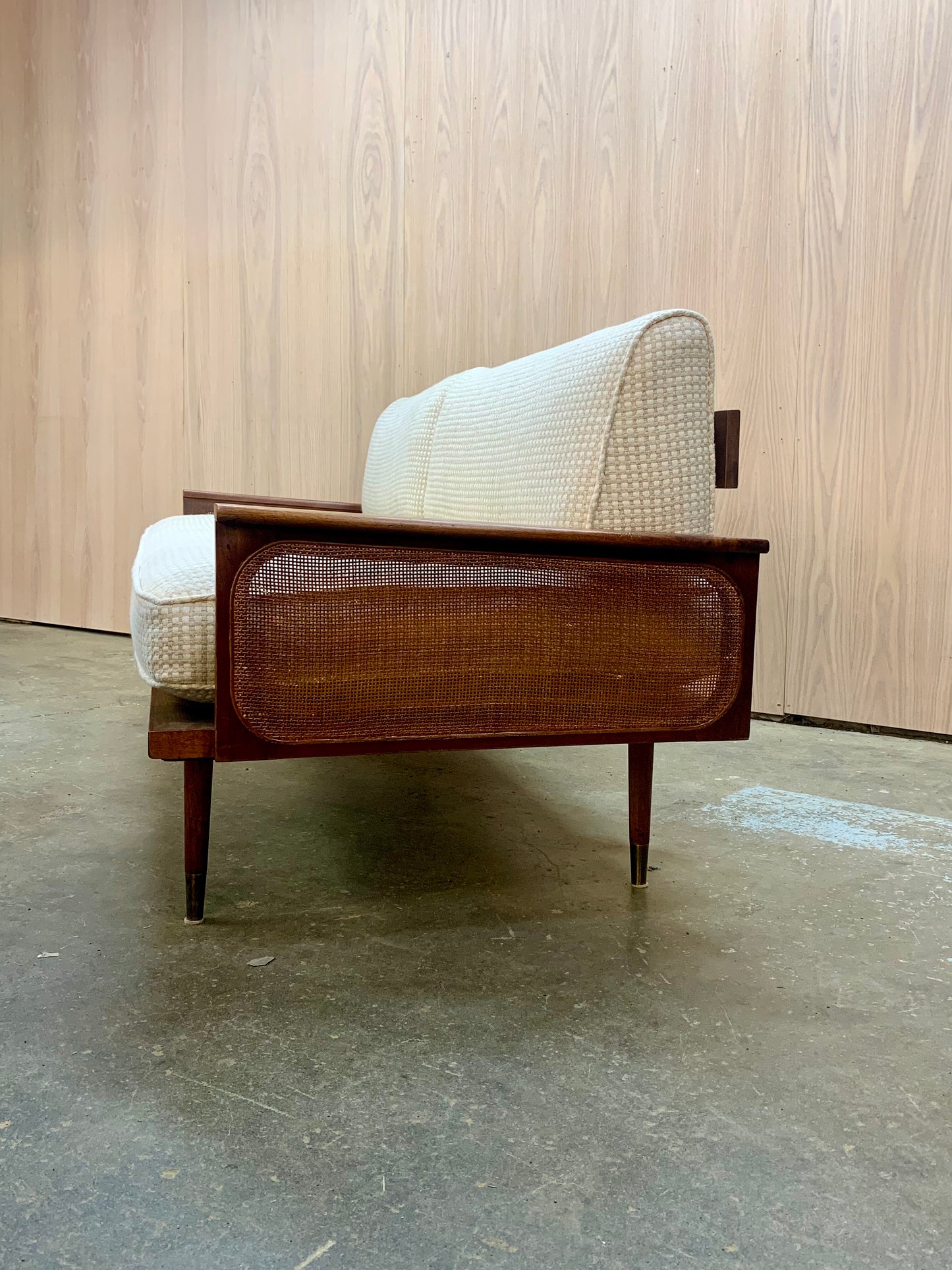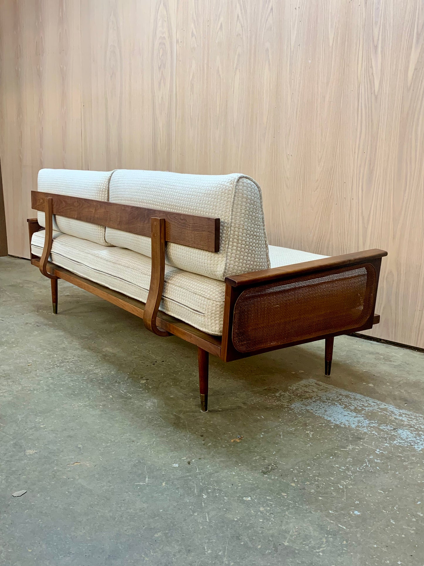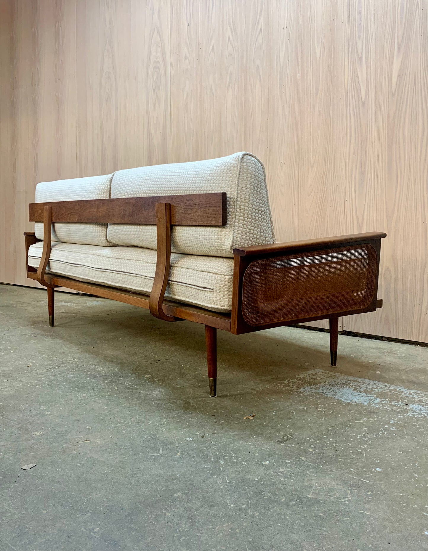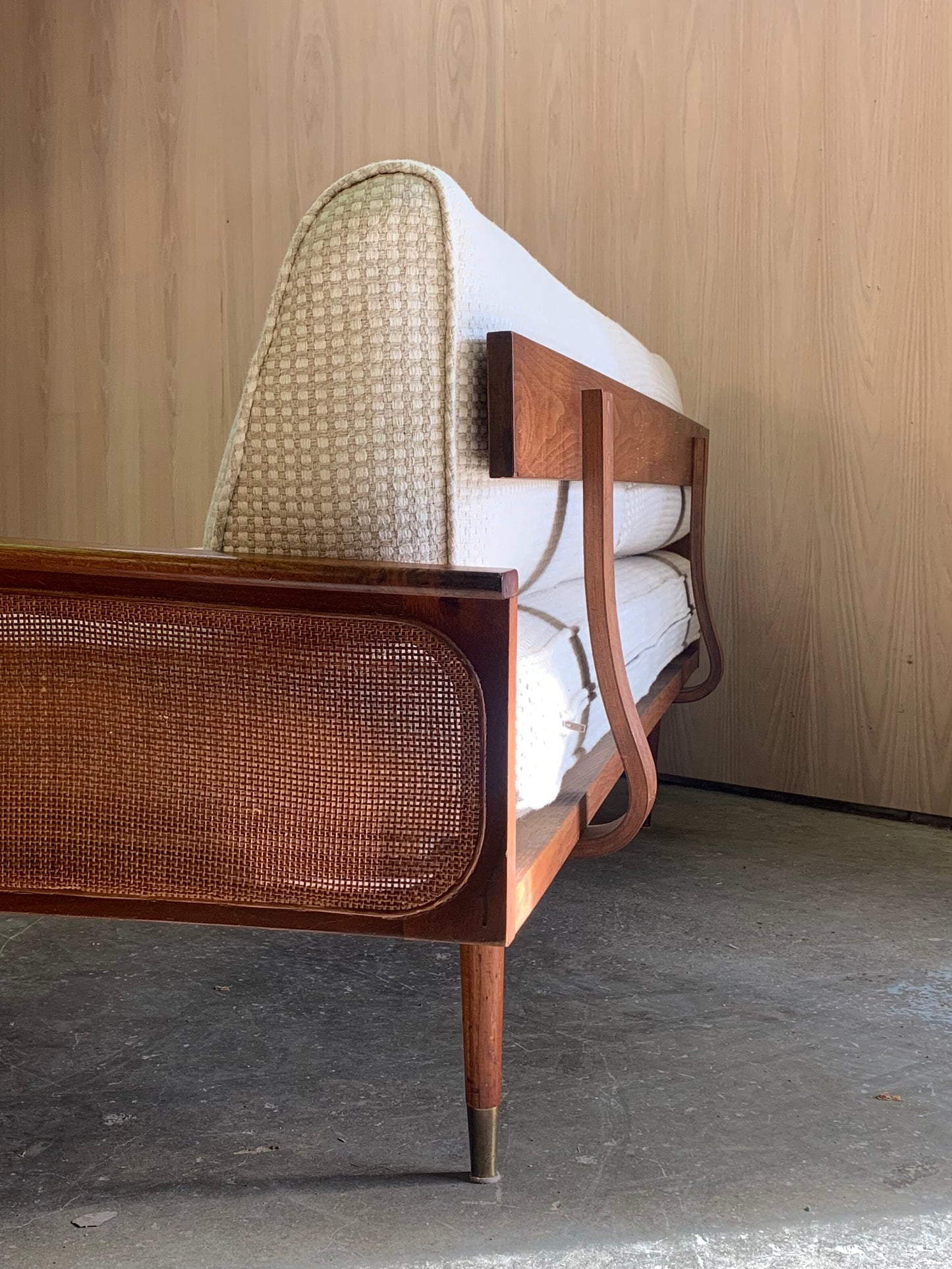 A beautiful blend of form and function, this 1950s American walnut sofa is a sculptural standout with its sweeping lines, solid wood frame, and rattan-paneled sides. Slim tapered legs with brass-capped feet add an elegant touch, while the curved support details give it a sense of movement from every angle.
