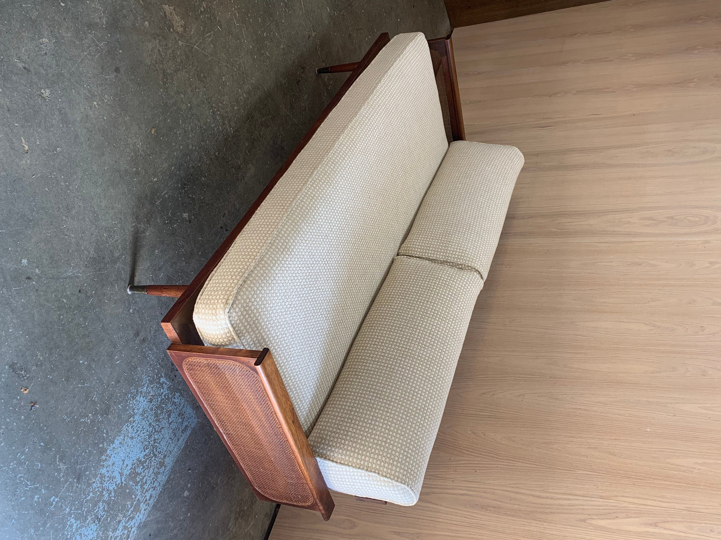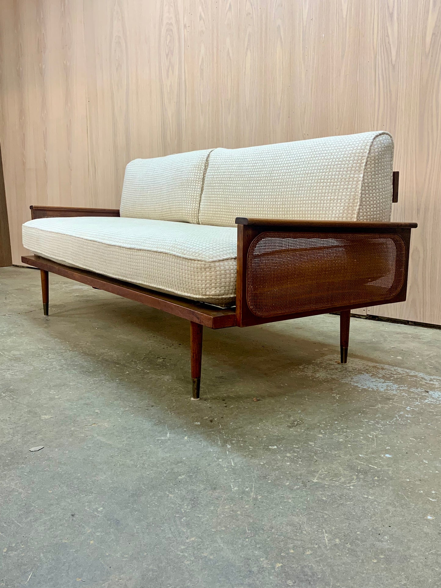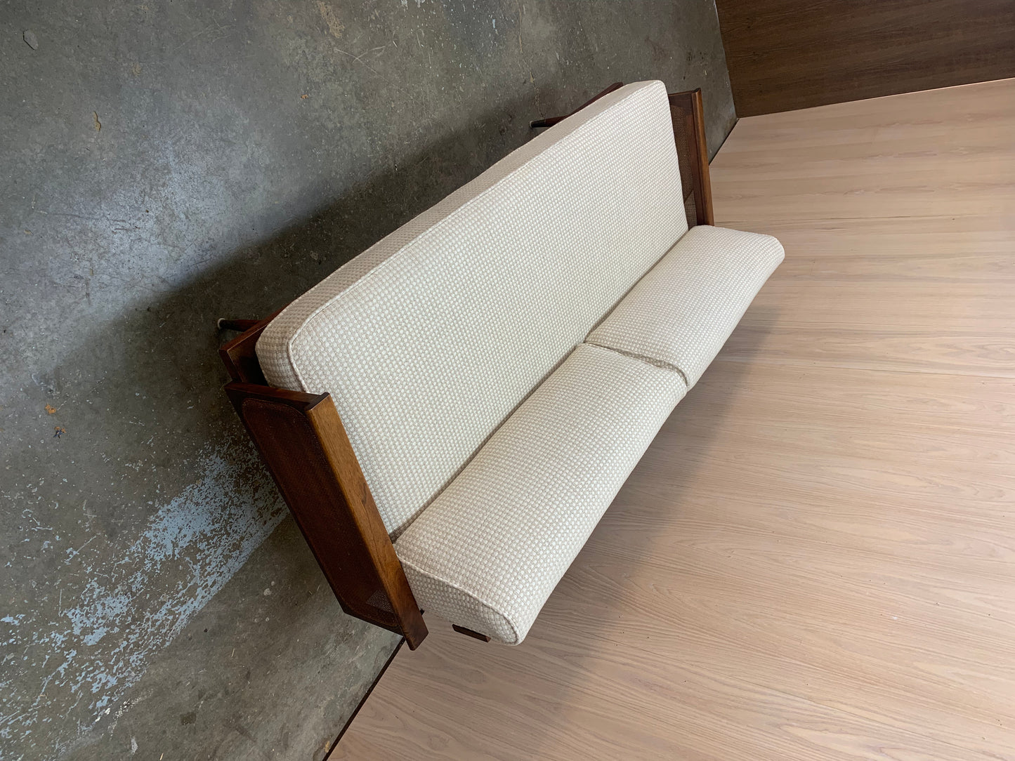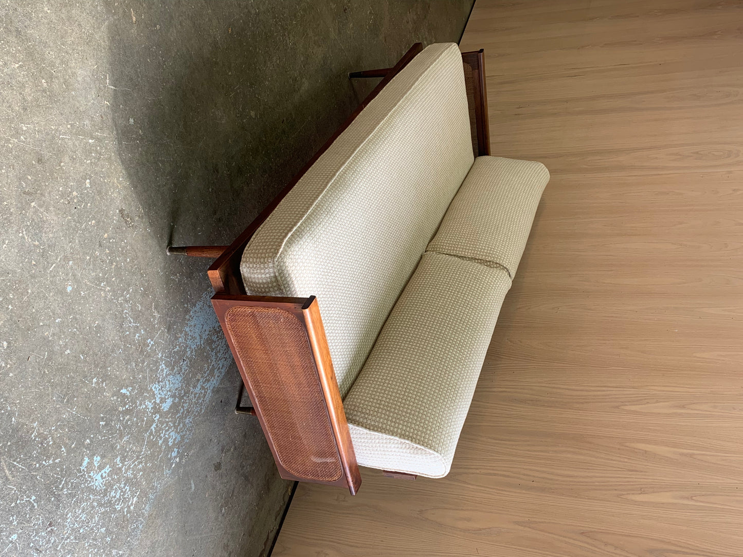 A beautiful blend of form and function, this 1950s American walnut sofa is a sculptural standout with its sweeping lines, solid wood frame, and rattan-paneled sides. Slim tapered legs with brass-capped feet add an elegant touch, while the curved support details give it a sense of movement from every angle.