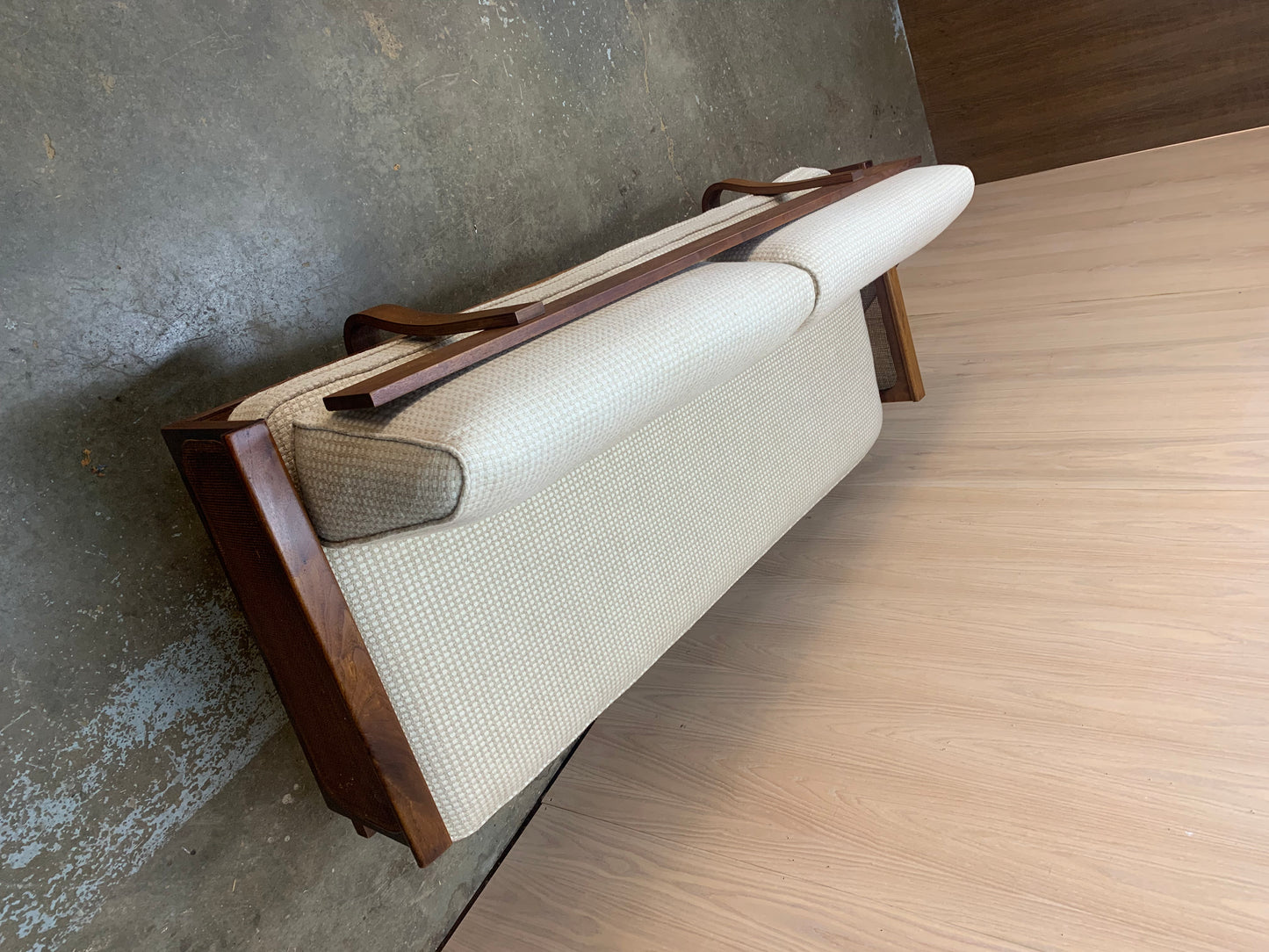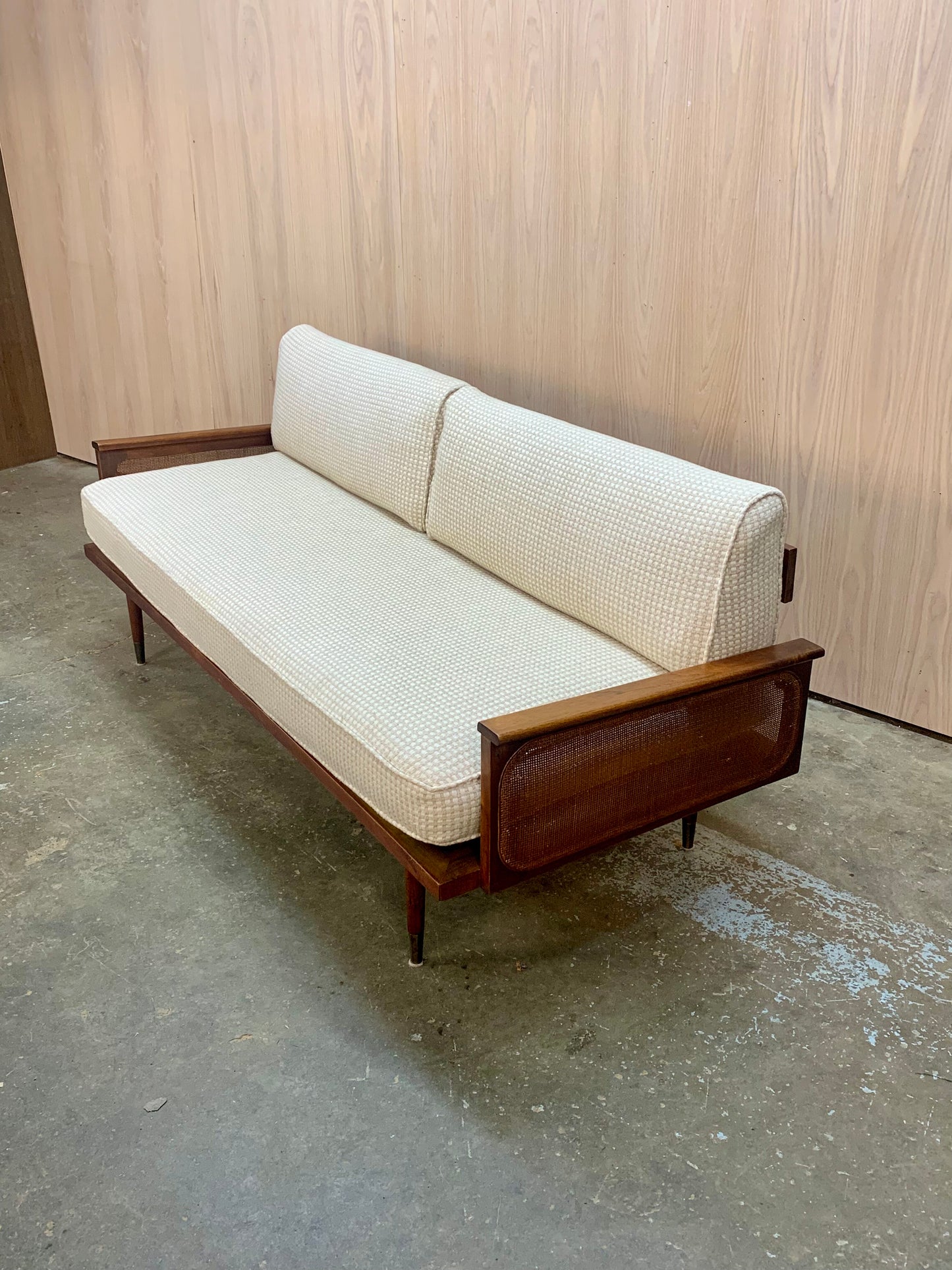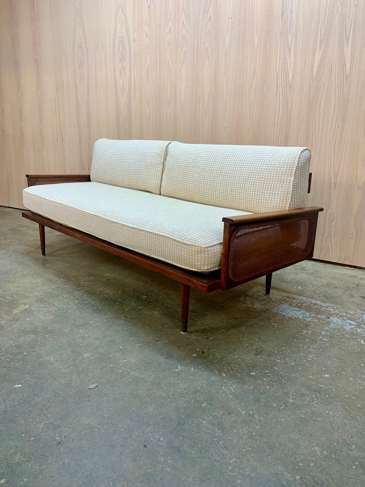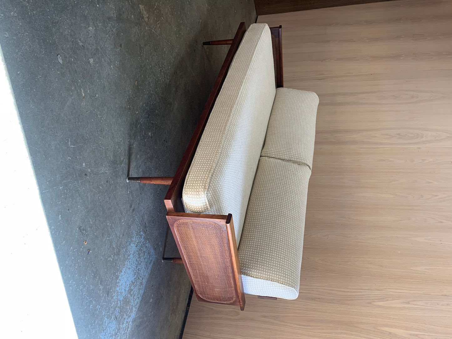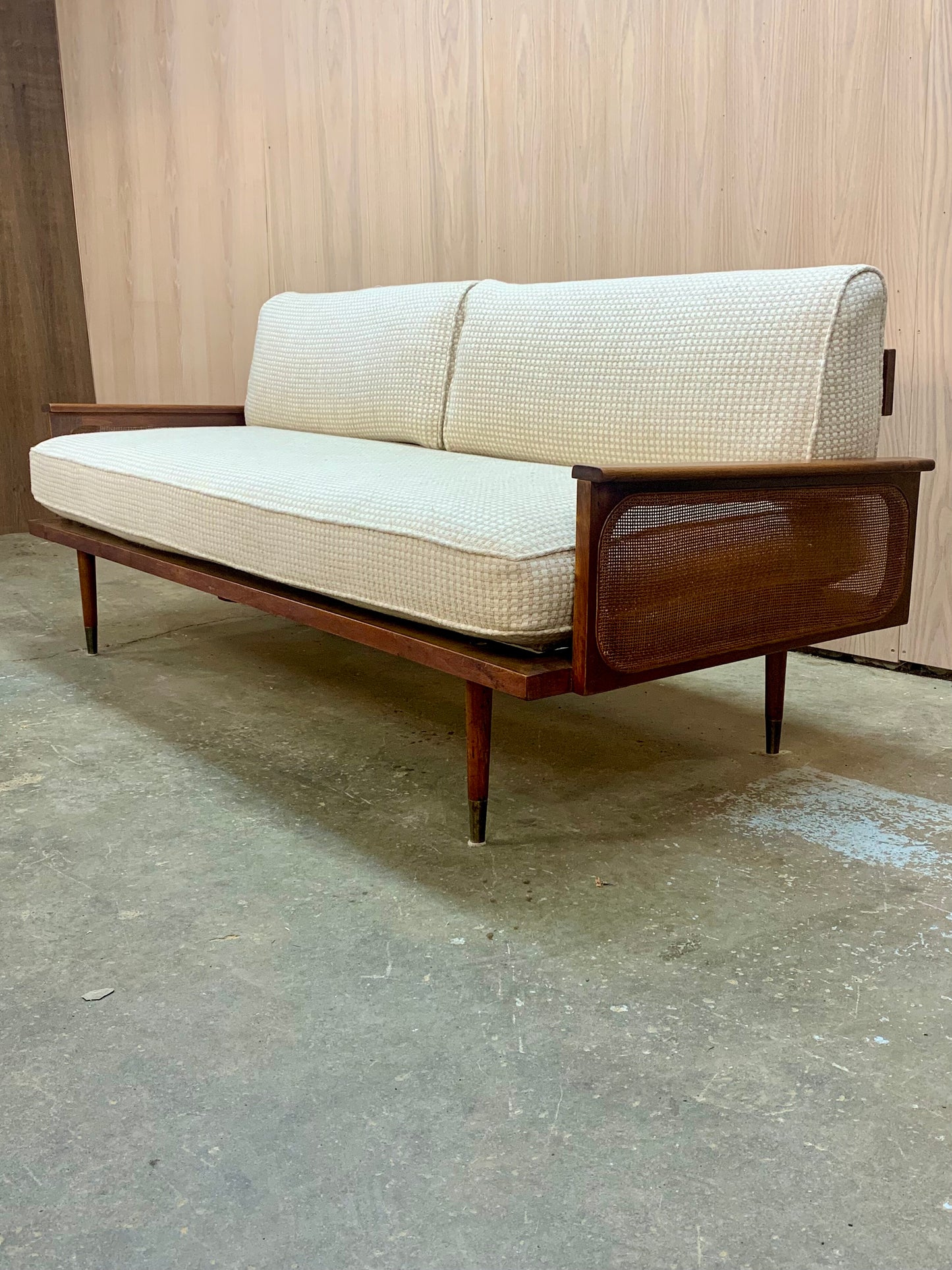 A beautiful blend of form and function, this 1950s American walnut sofa is a sculptural standout with its sweeping lines, solid wood frame, and rattan-paneled sides. Slim tapered legs with brass-capped feet add an elegant touch, while the curved support details give it a sense of movement from every angle.