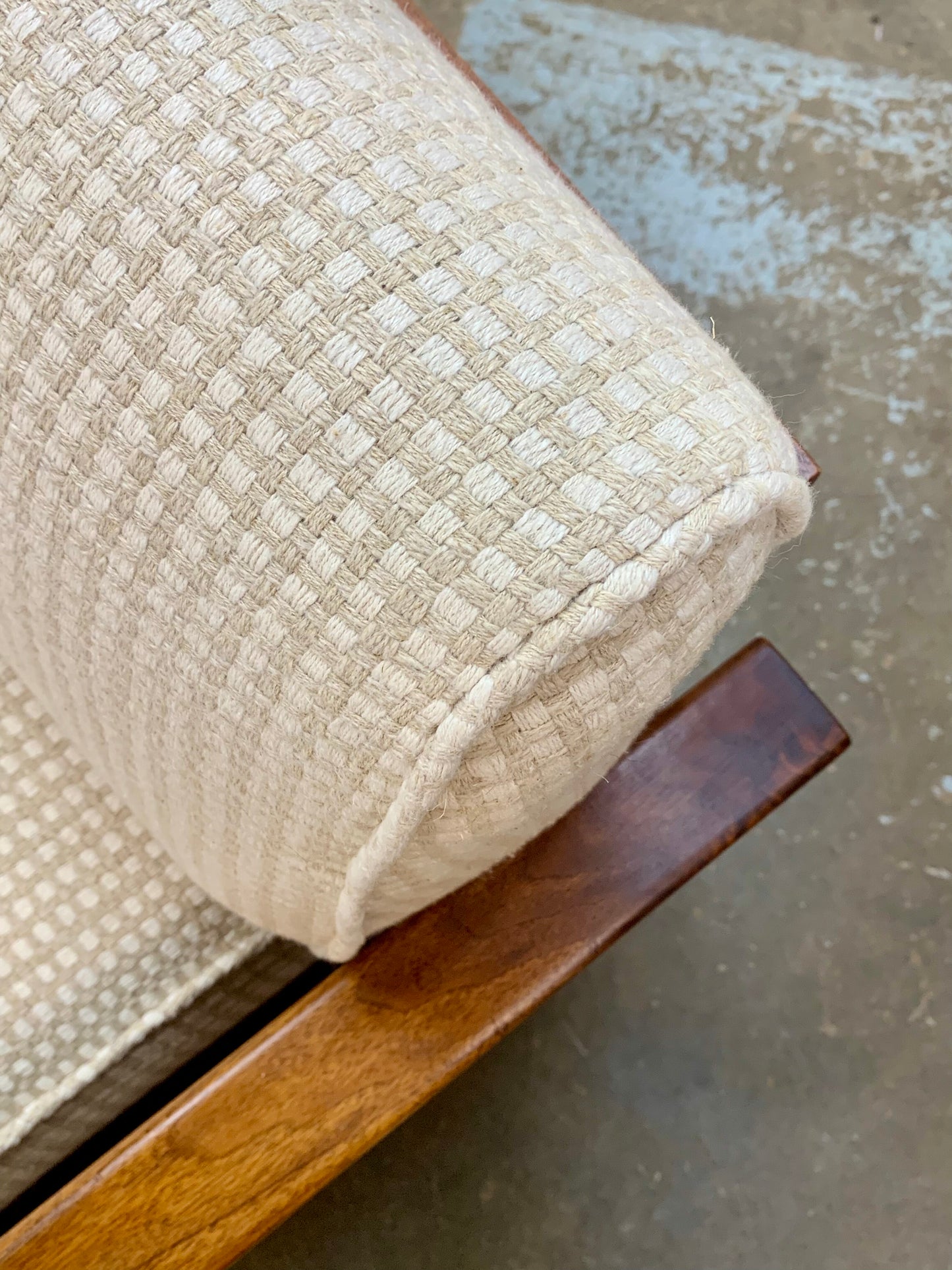 Recently restored with all-new high-density foam and top-quality upholstery materials, this piece has also been freshly cleaned and polished, making it move-in ready and in excellent condition.