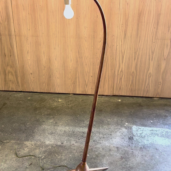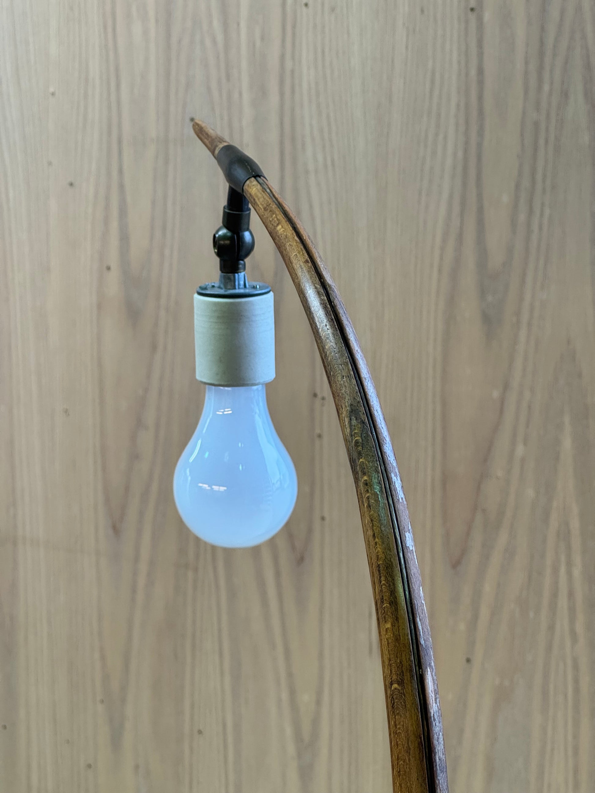 This “Bridge” floor lamp was designed by Severin Hansen Jr and produced by Haslev Mobelsnedkeri in Denmark during the 1950s. The design is defined by its continuous curved arm, which extends outward in a controlled arc, creating a clear directional gesture.