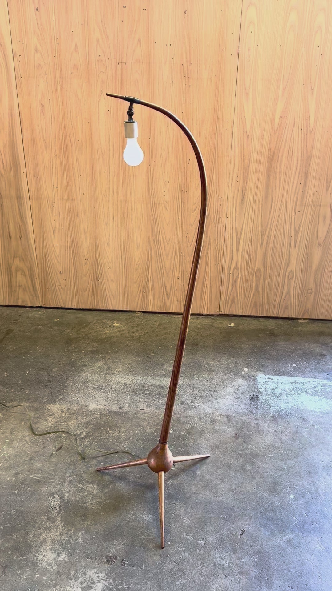 The form is both functional and deliberate. The extended arm positions the light source away from the base, making it suitable for reading or focused illumination. The geometry remains balanced, with the weight distributed through the tripod base and central column.