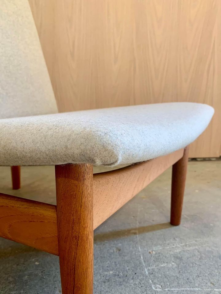 We are thrilled to introduce a highly coveted and iconic collectible chair designed by Finn Juhl for France & Daverkosen. The Model FD137, also known as the “Japan” chair, was inspired by Finn Juhl's visit to Japan in the early 1950s, where he was captivated by the simple beauty of a Japanese temple door. This particular example is a first production and has been scarcely used, remaining in exceptional condition. Gently restored by our team, it is now freshly covered in Kvadrat “Divina” fabric, staying true to the period and style. This incredible piece is in showroom condition and ready to be added to your collection, to be enjoyed for another generation.