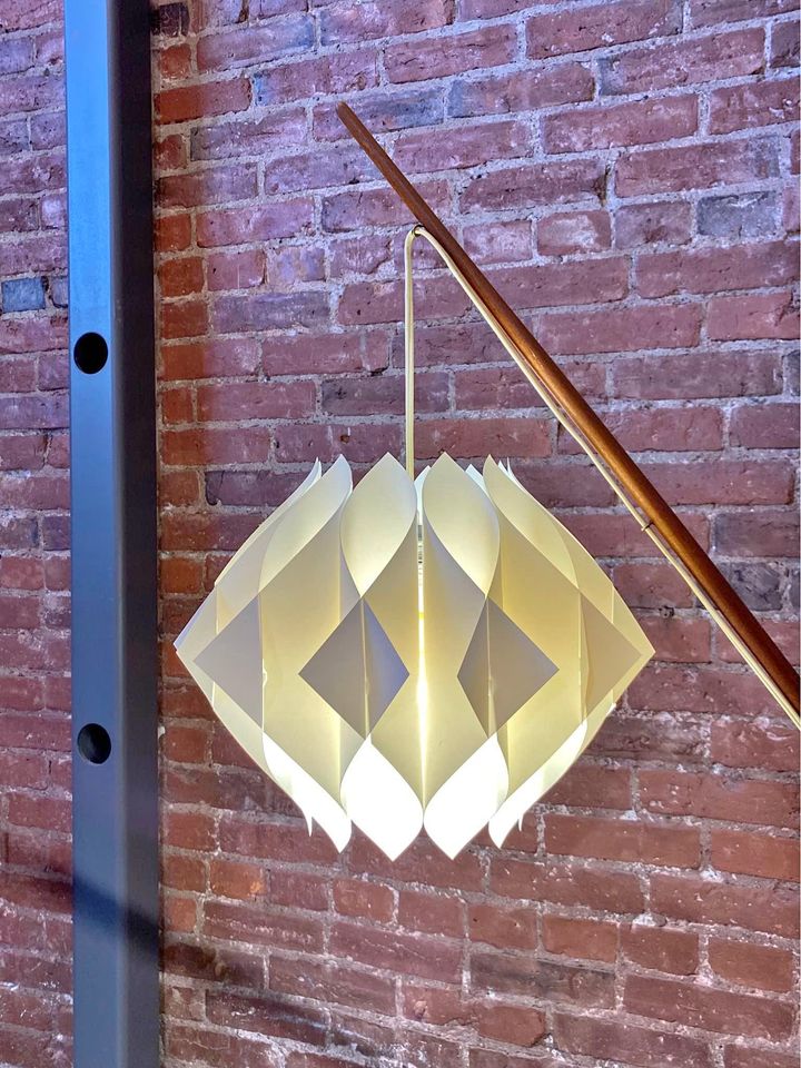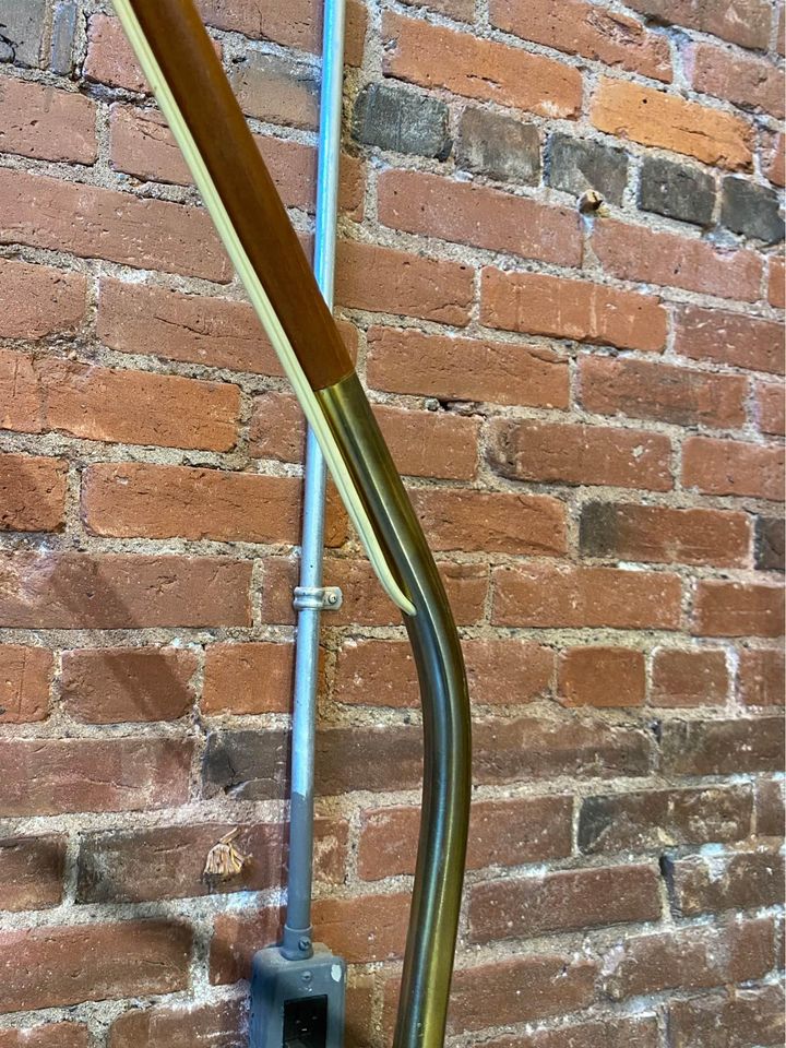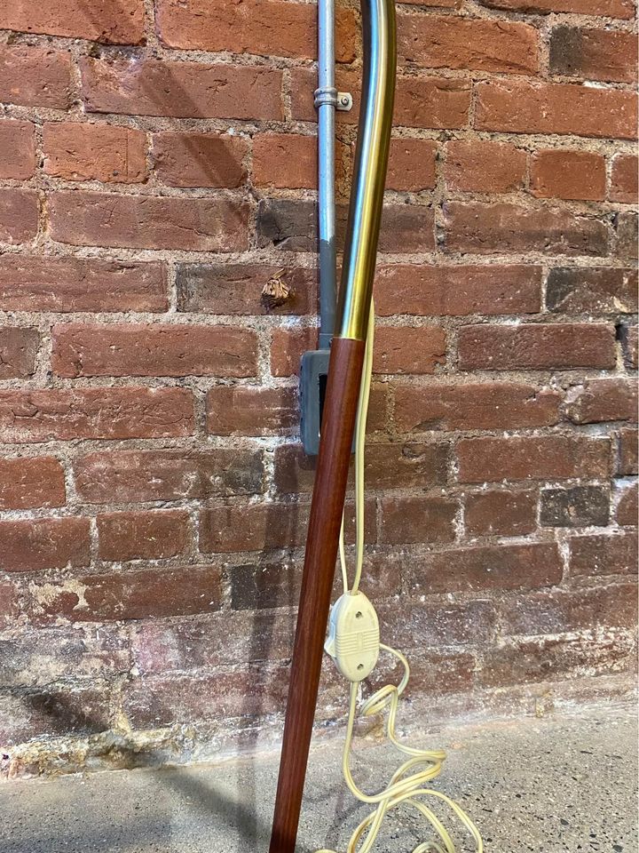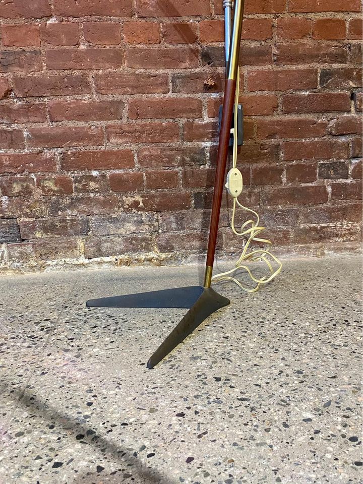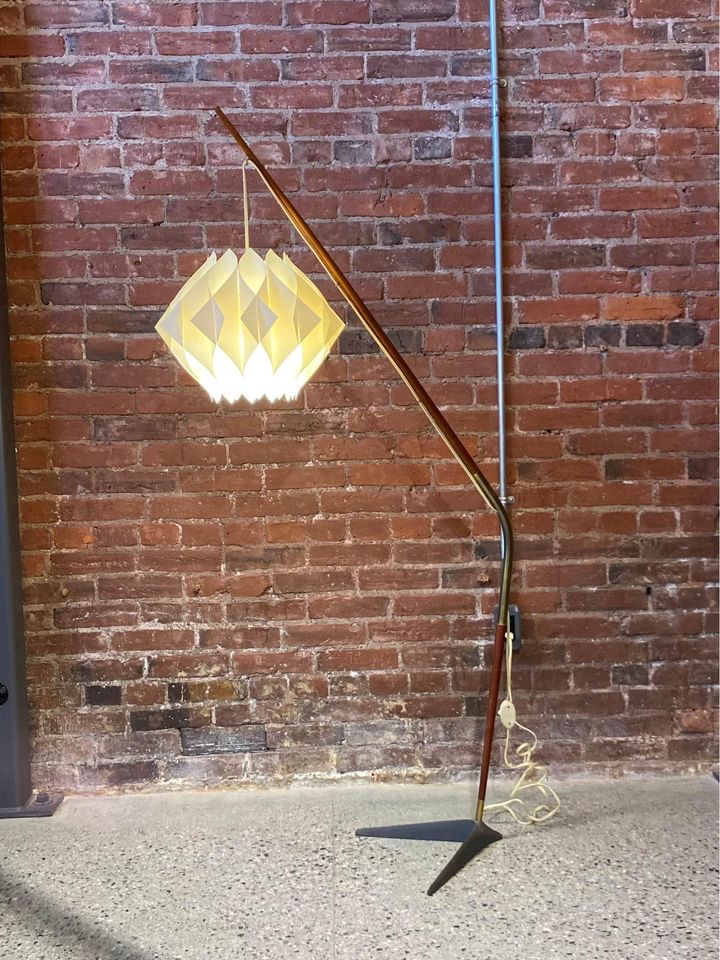 The 1950s Danish "fishing pole" floor lamp designed by Svend Aage Holm Sørensen is a stunning mid-century lighting piece that exudes both elegance and functionality. With an iron base, it provides stability and durability while maintaining a sleek aesthetic. The teak body of the lamp adds warmth and organic beauty to the design, evoking a sense of nature indoors. Brass accents tastefully highlight the lamp's structure, offering a touch of sophistication and visual contrast. This floor lamp is a true embodiment of Danish design principles, showcasing the marriage of form and function in an exquisite and timeless piece.