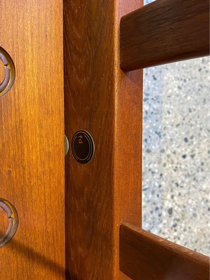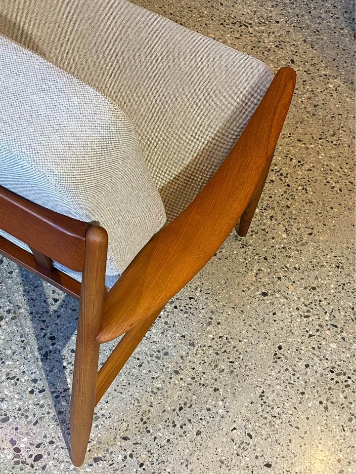 Grete Jalk's Model 118 swiftly captured the hearts of design enthusiasts, emerging as an enduring emblem of Danish modern design. Elegantly adorned with impeccably crafted armrests and graceful angles, it delivers exceptional comfort. This exquisite example represents the inaugural production, boasting resplendent old-growth teak wood, its original sprung cushions, and a fresh fabric update. Our dedicated team has meticulously restored this beautiful piece to pristine condition.
