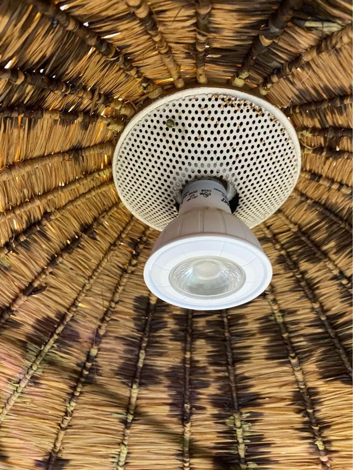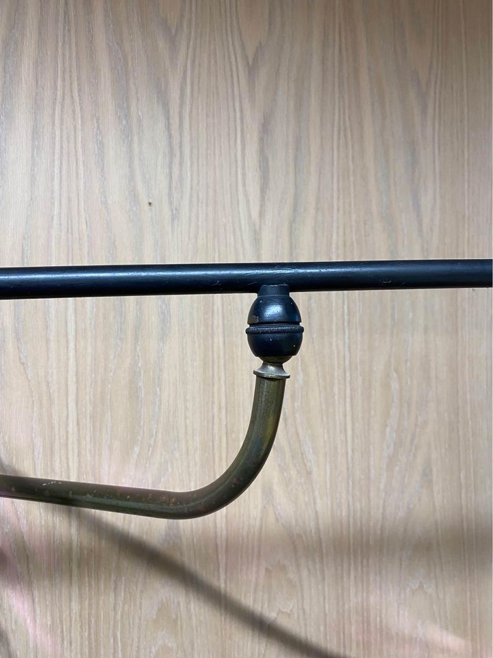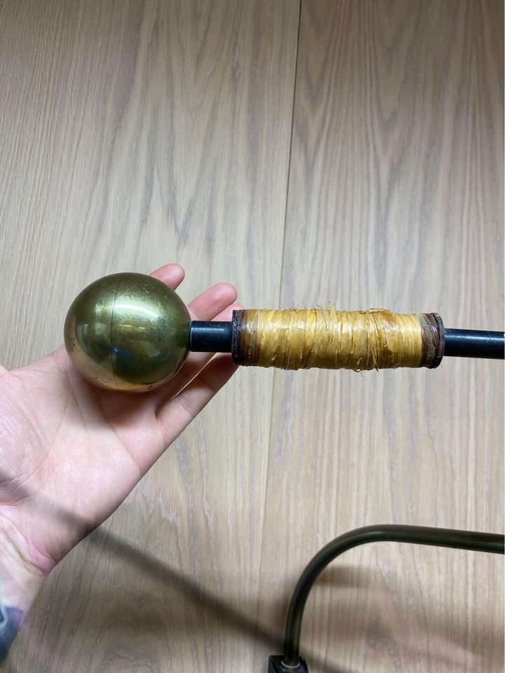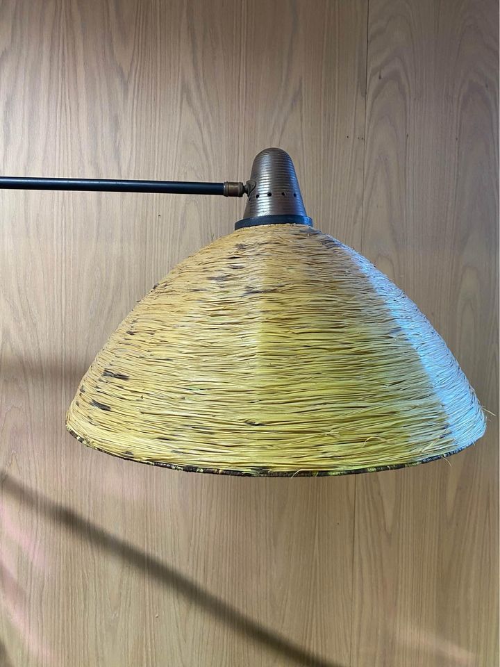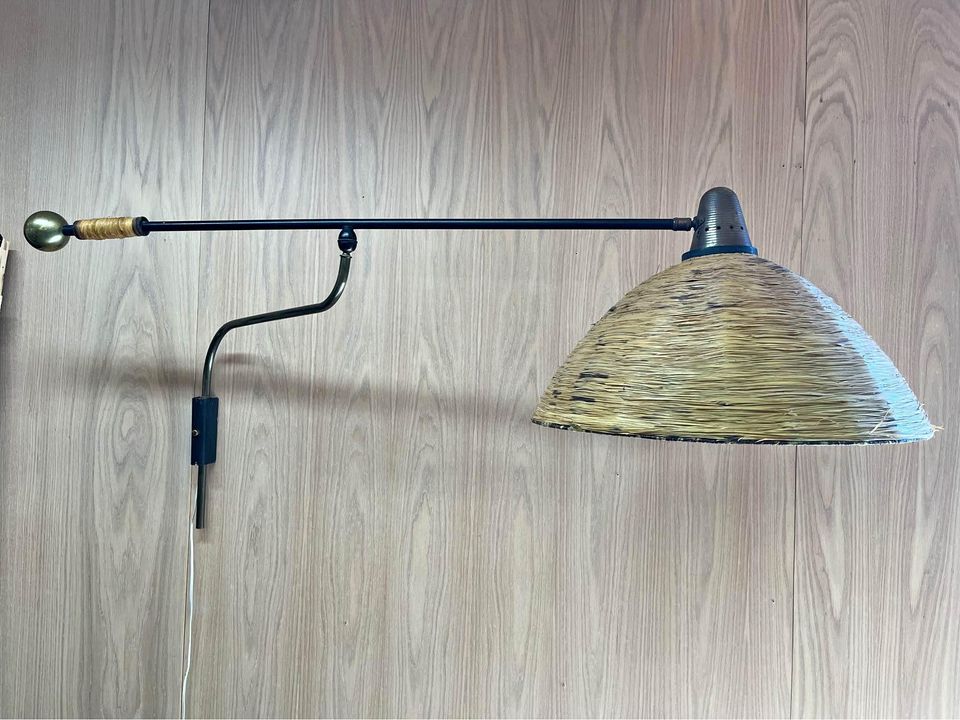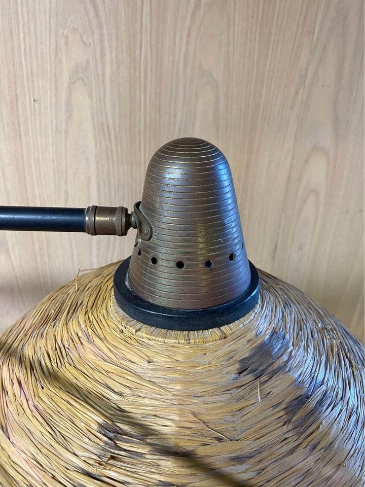 We are delighted to offer this exceptionally rare lamp by Maison Arlus, crafted in the 1950s. This stunning piece showcases a beautiful rattan shade and handle, complemented by perforated metal details and solid brass accents. Fully adjustable in both height and orientation, this lamp remains in its original condition and functions perfectly.