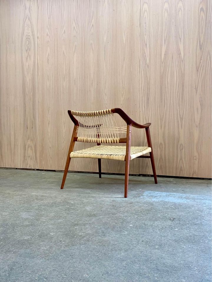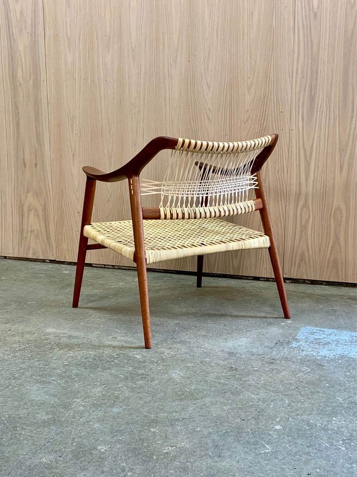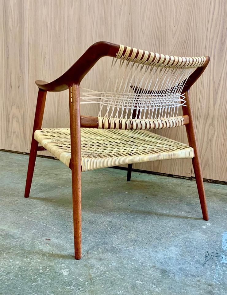 Freshly restored and ready to impress, we’re delighted to present a Norwegian masterpiece by Rolf Rastad & Adolf Relling, crafted for Gustav Bahus in the 1950s. This striking design showcases swooping angles and a beautifully sculpted solid teak frame, complemented by a hand-caned seat and back that lend an airy, elegant presence. Meticulously restored and freshly caned, this timeless piece is destined to captivate hearts for generations to come.