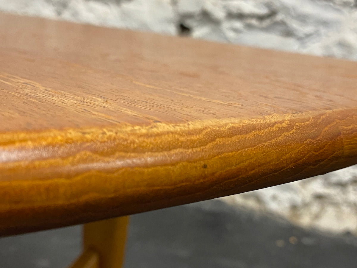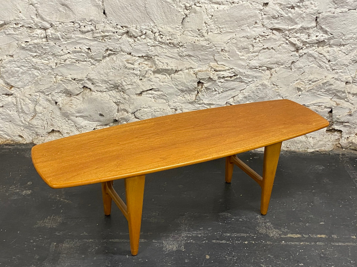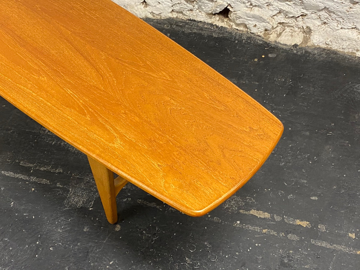 This incredibly unique was brought over from Denmark in the early 1950s. It features a gently curved solid teak top, and solid oak V shaped legs that add an interesting contrast. The entire piece is freshly restored and in fantastic condition.