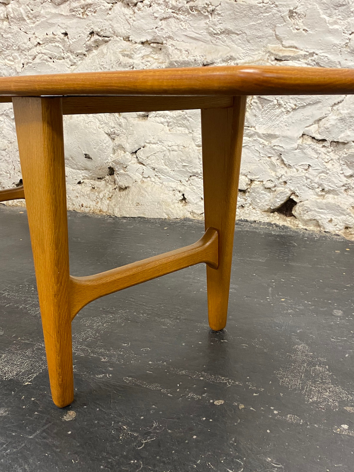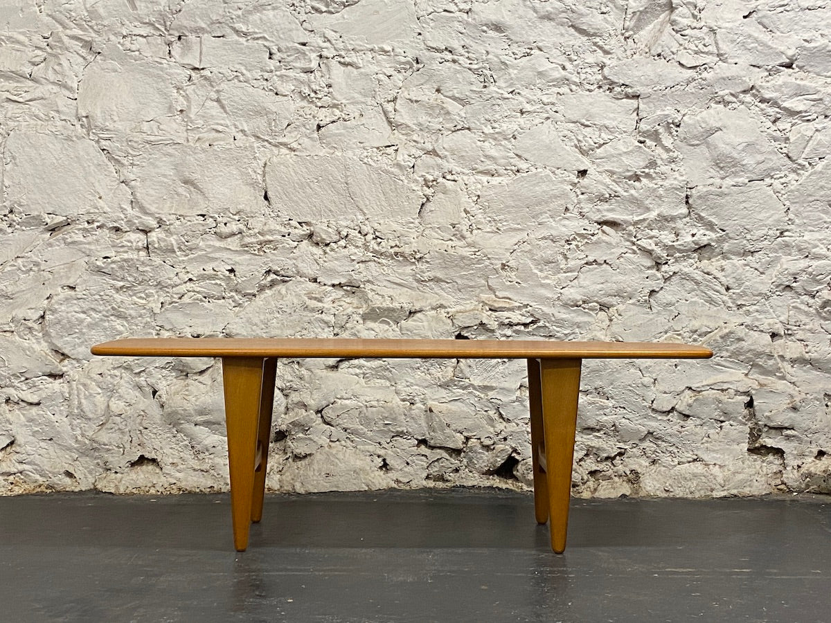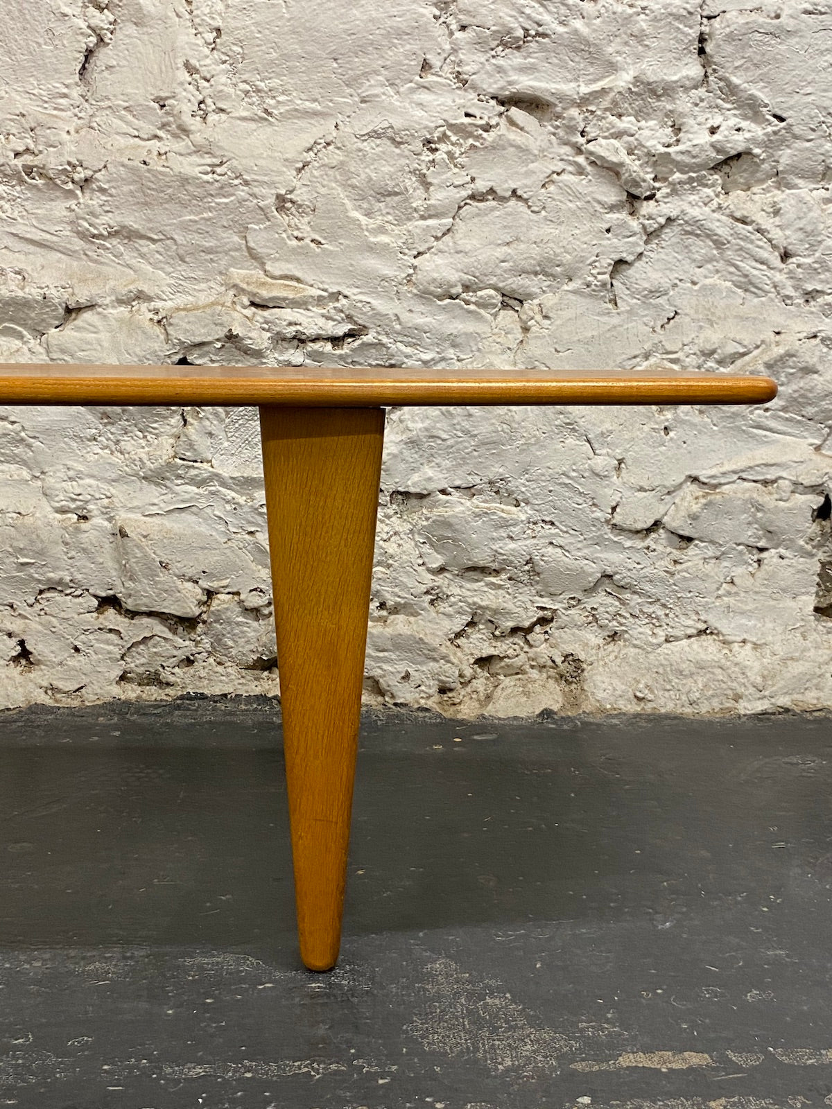 This incredibly unique was brought over from Denmark in the early 1950s. It features a gently curved solid teak top, and solid oak V shaped legs that add an interesting contrast. The entire piece is freshly restored and in fantastic condition.