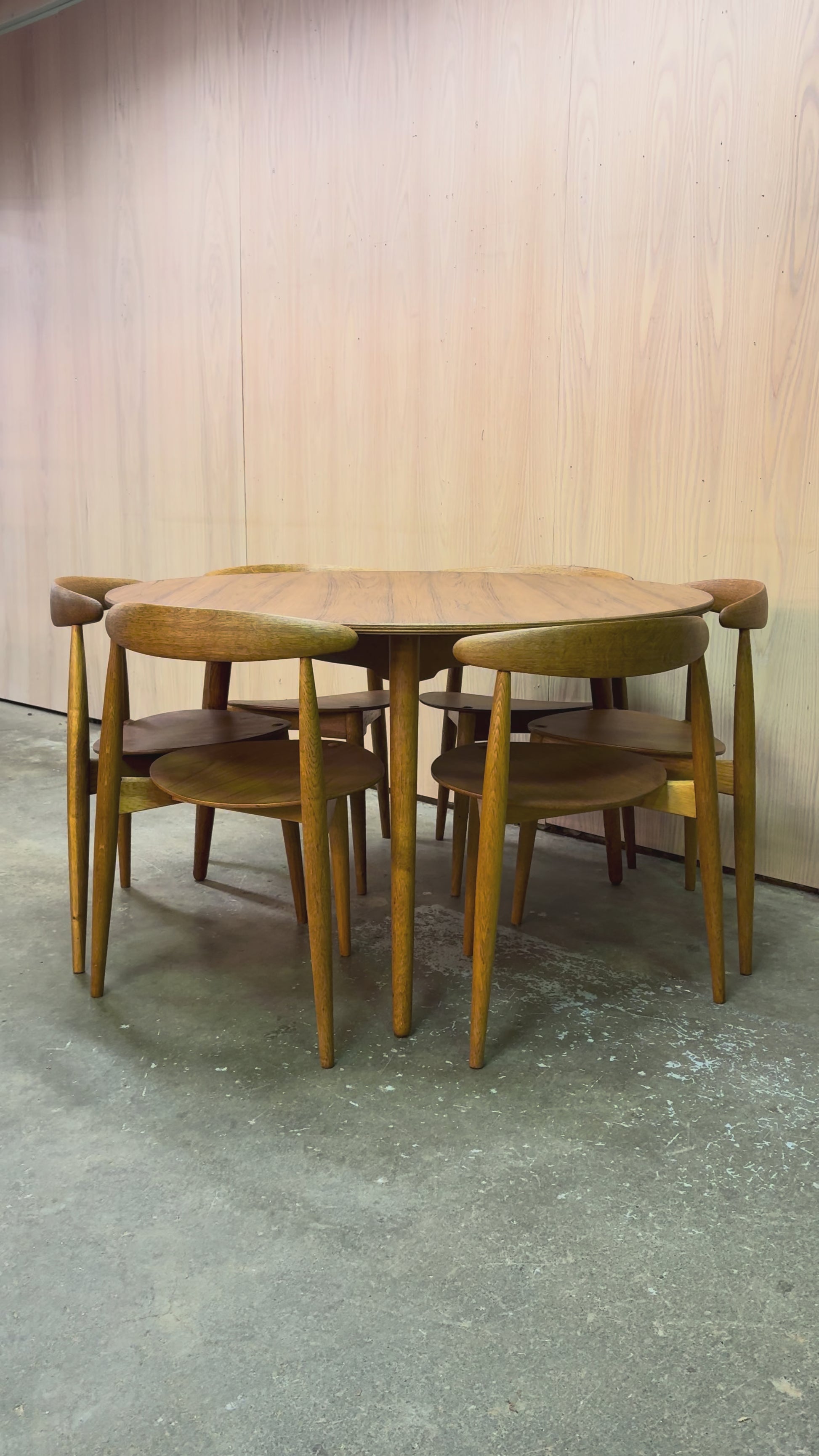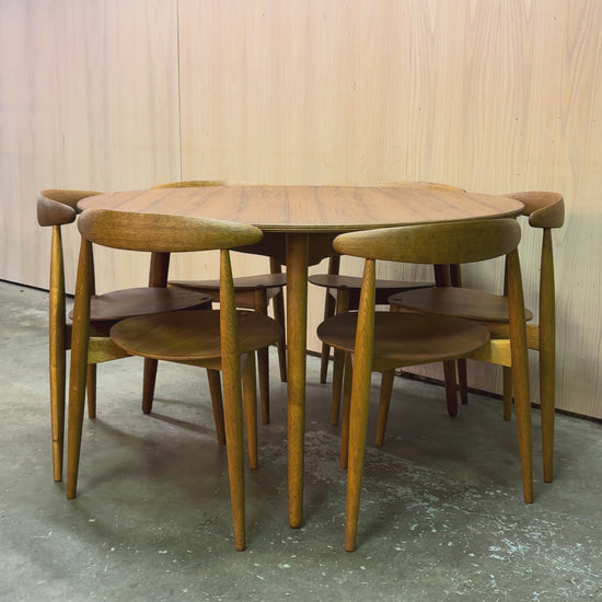 An iconic 1950s dining set by Hans Wegner, featuring the sculptural “Heart” chairs paired with a matching round dining table.