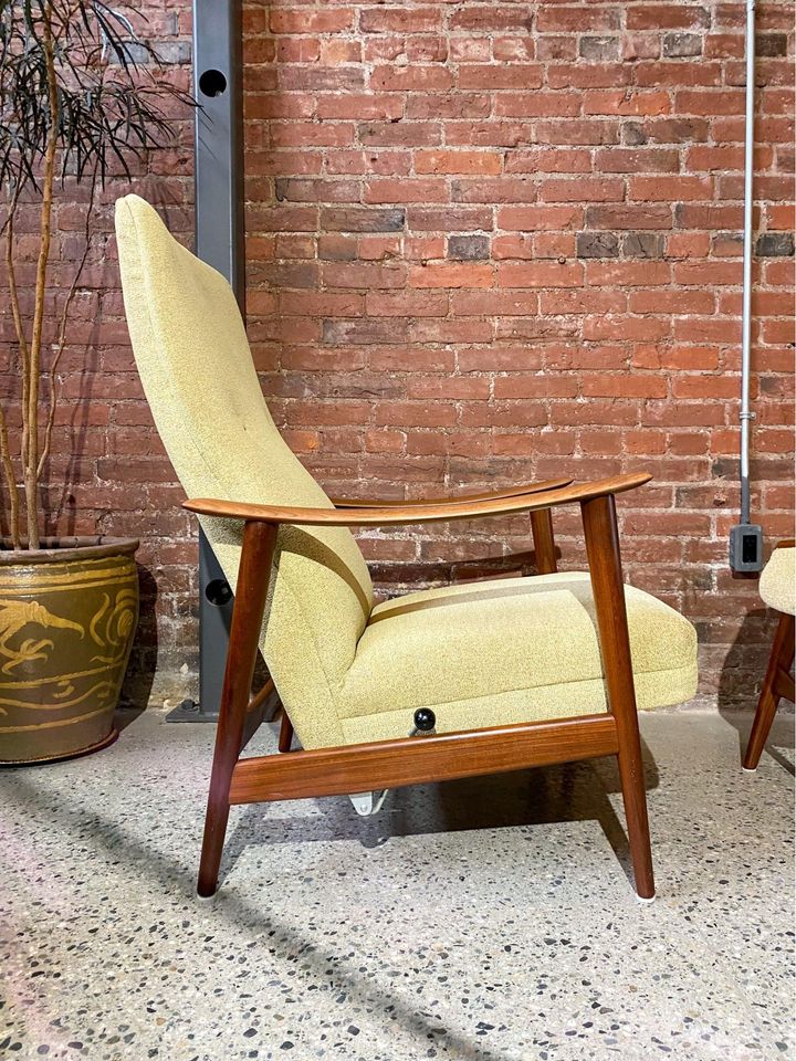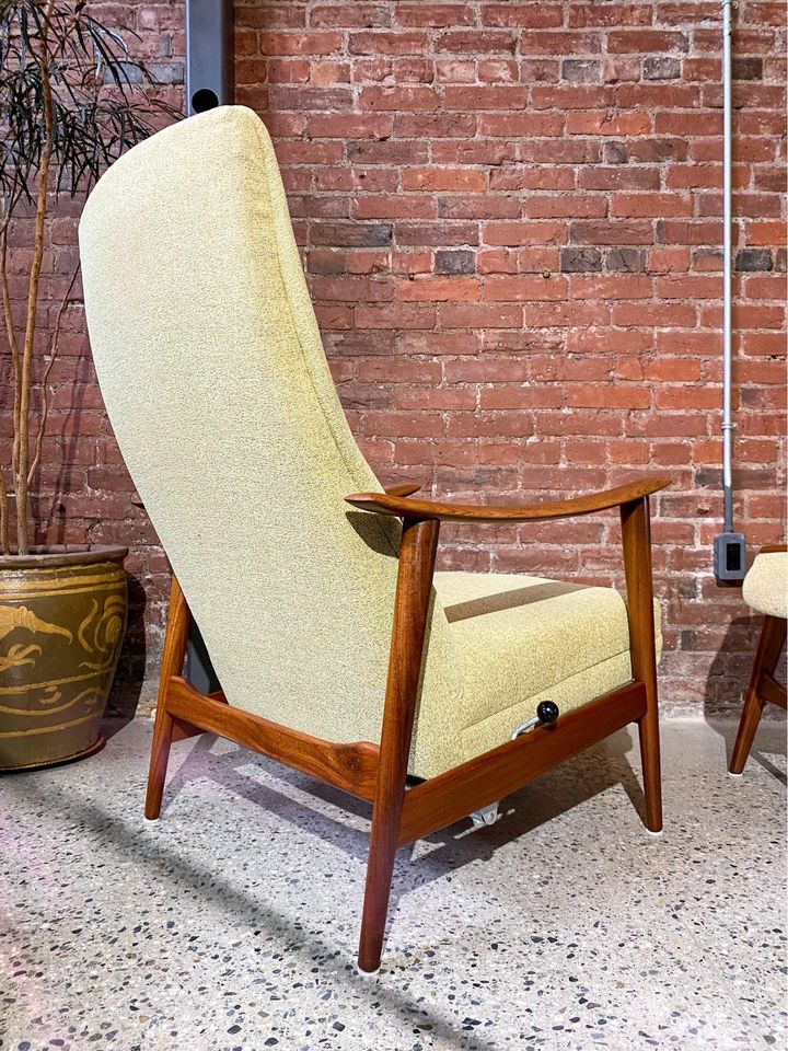 Fantastic 1960s high back reclining lounge chair and matching stool by Arnt Lande for Stokke Fabrikker, Norway. This beautiful is exceptionally comfortable. Freshly restored wood frame - everything’s in excellent condition.