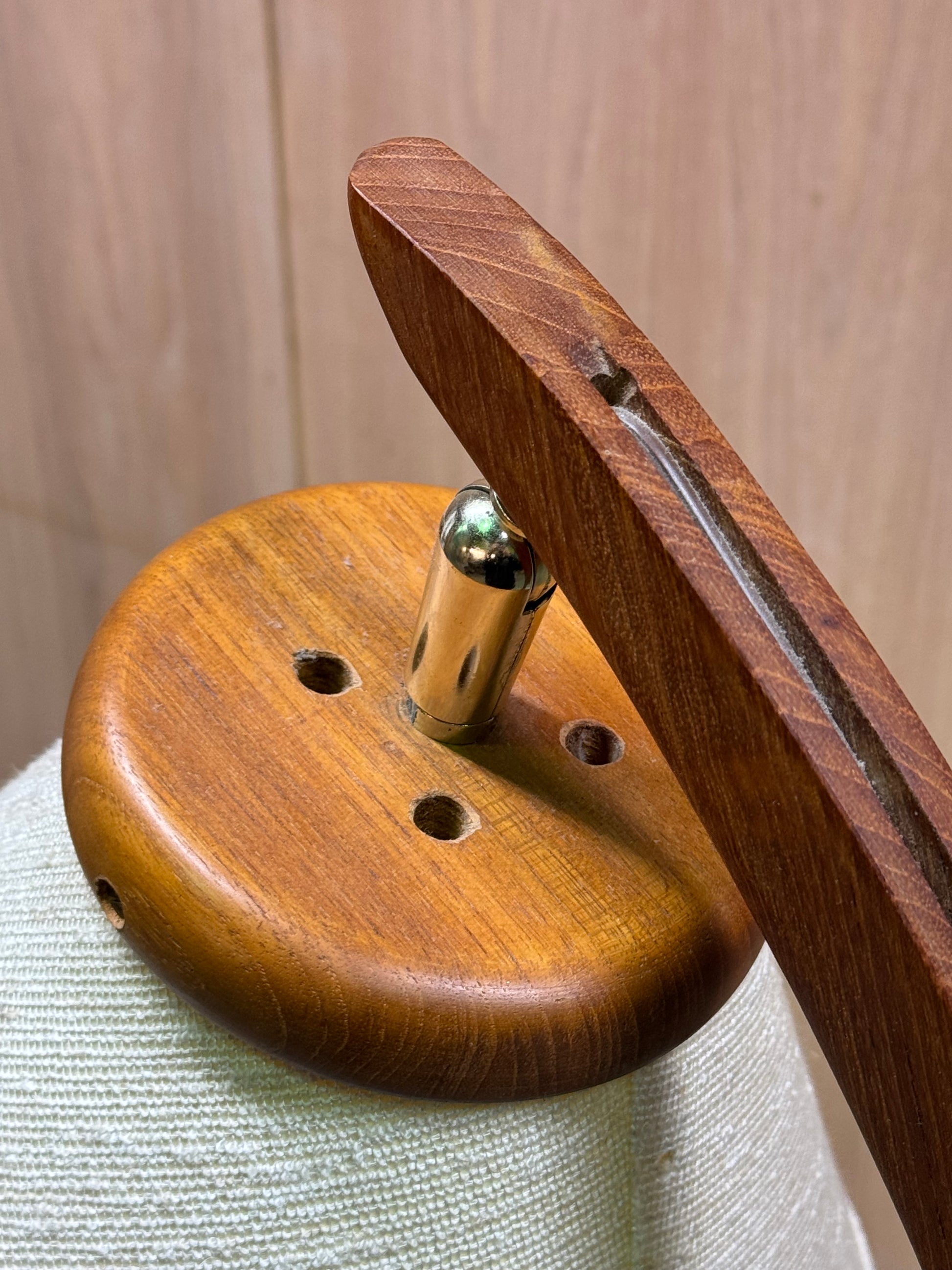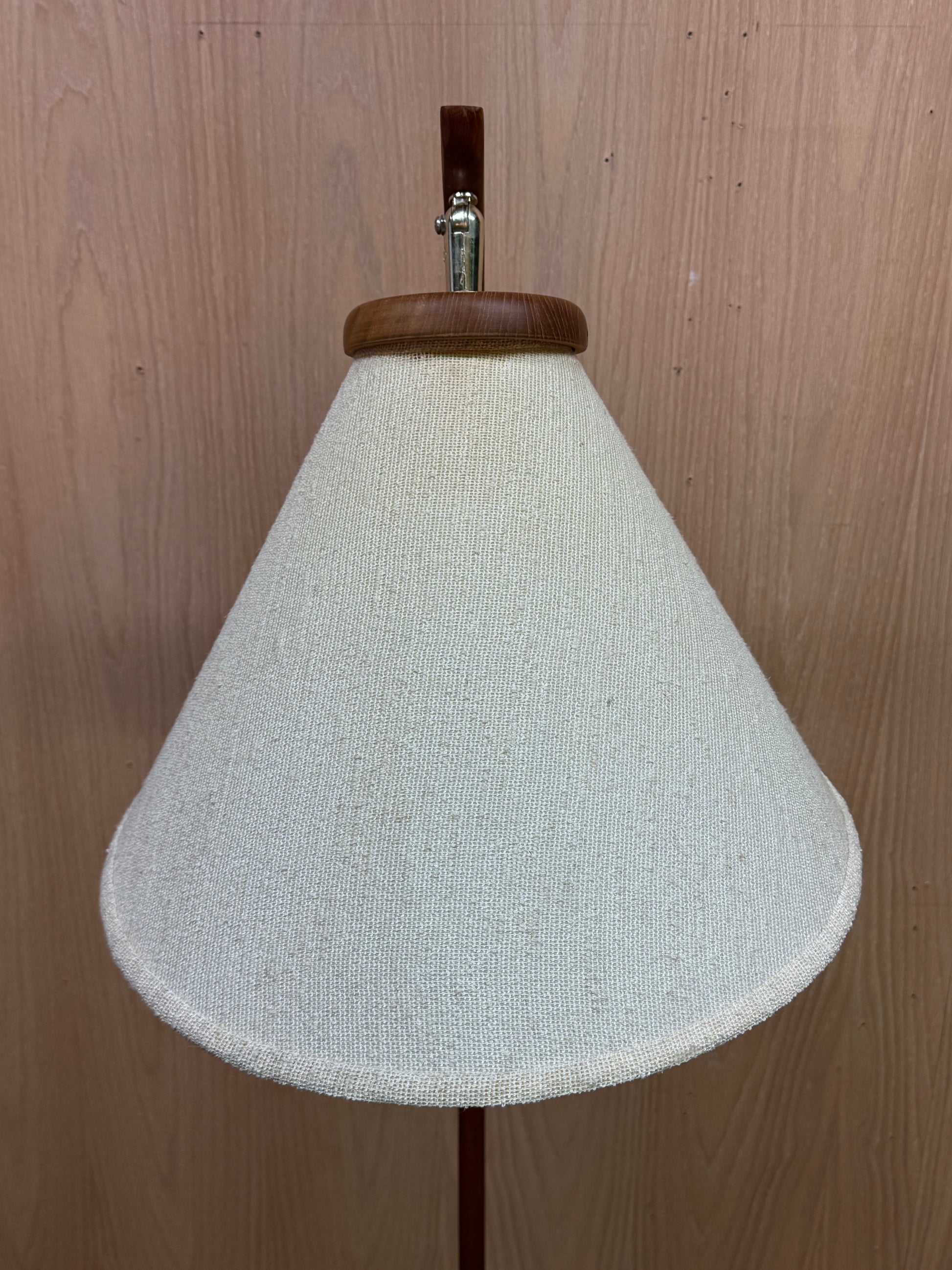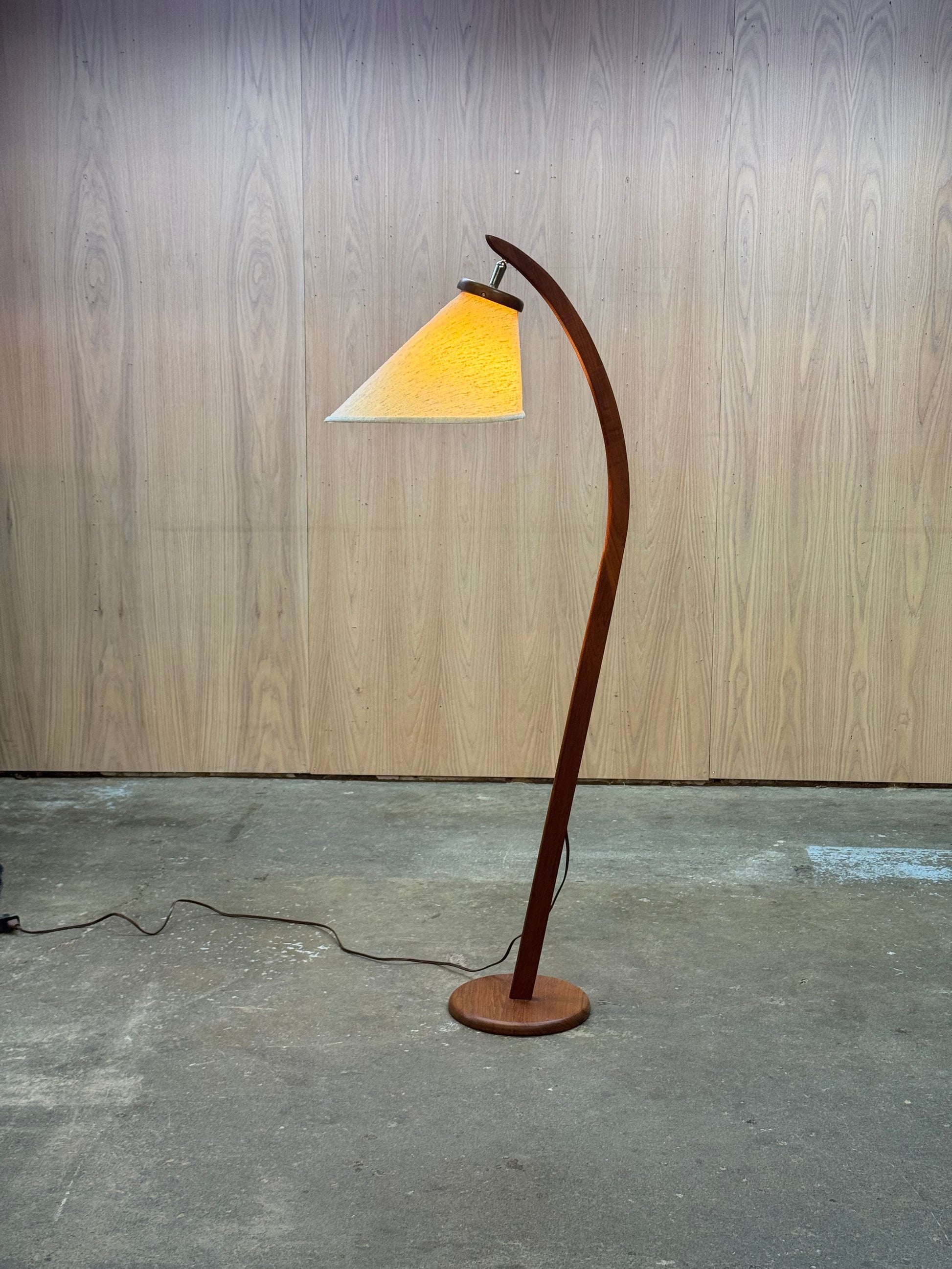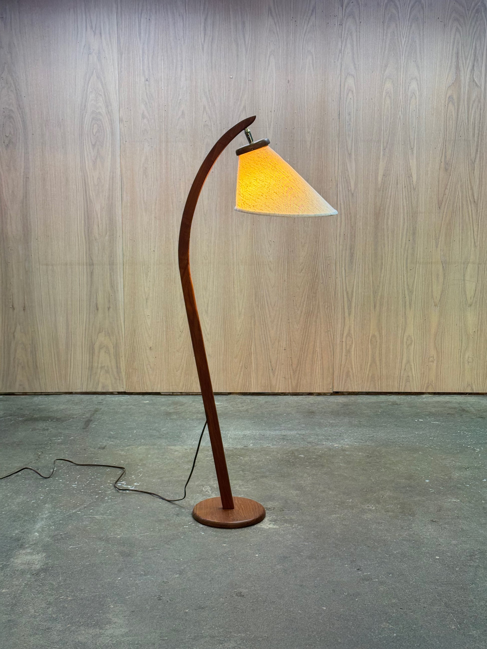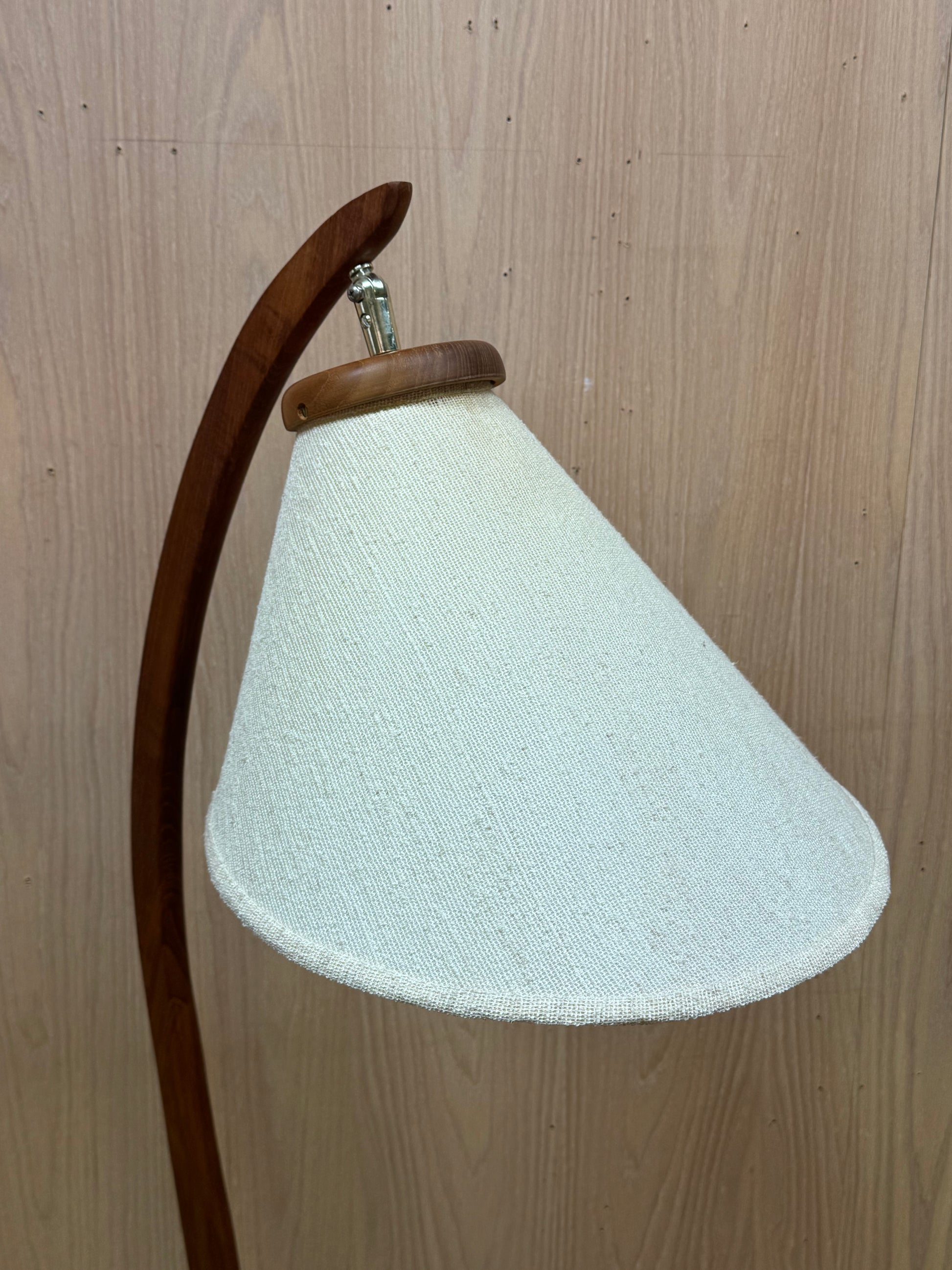 The construction highlights careful woodworking, with the teak shaped into a smooth and continuous curve. The contrast between the warm wood and the textured fabric shade creates a balanced and understated presence. The shade diffuses light softly while still allowing directional control.