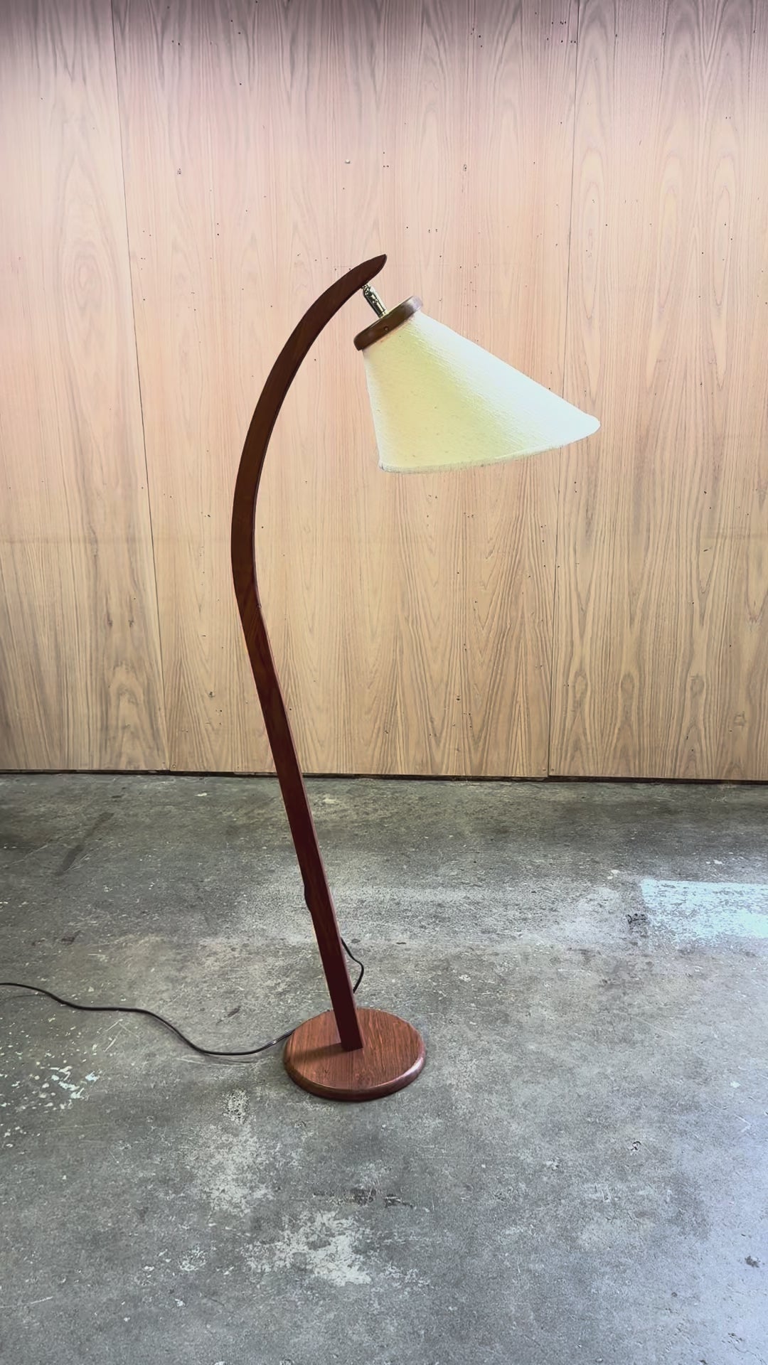 This arc floor lamp was produced in Canada during the 1960s–1970s, reflecting the strong influence of Scandinavian design in North American furniture and lighting of the period. The piece is constructed in solid teak, shaped into a continuous curved arm that defines its overall structure.