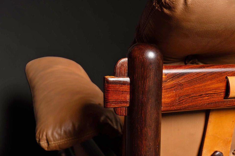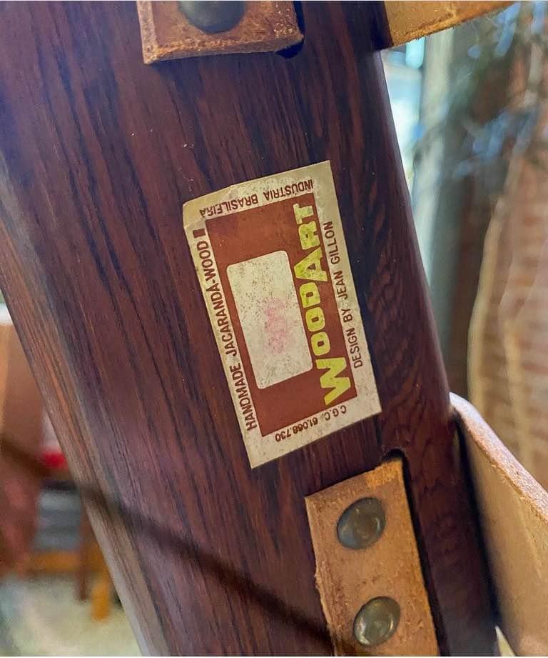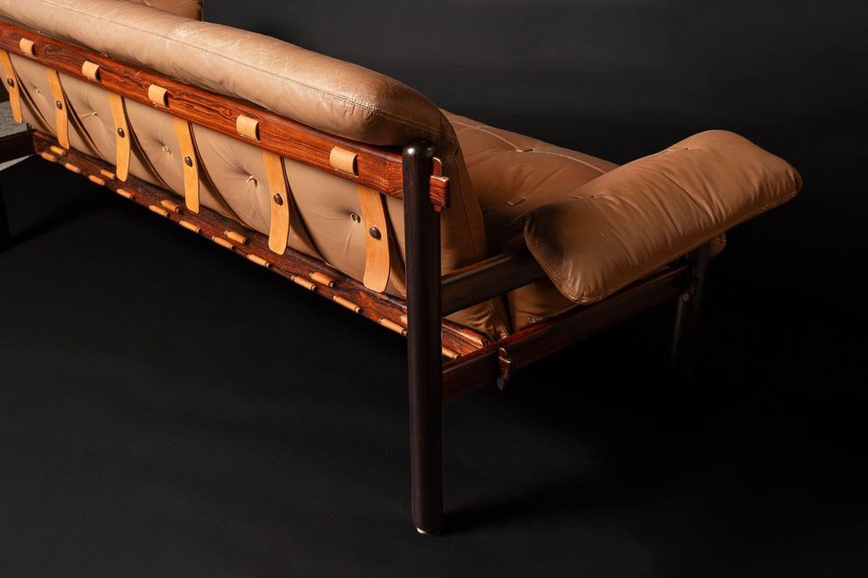 At last, we are pleased to announce the readiness of a most cherished sofa discovery. This exquisitely crafted piece, designed by Jean Gillon for Wood Art, hails from Brazil in the 1960s. Notably, it showcases long, solid Brazilian rosewood timbers featuring through tenons that elegantly mount to the leg/arm structures using tusk wedges. Furthermore, the leather strapping is artfully embellished with delicate rosewood "buttons" which serve as securing elements.
