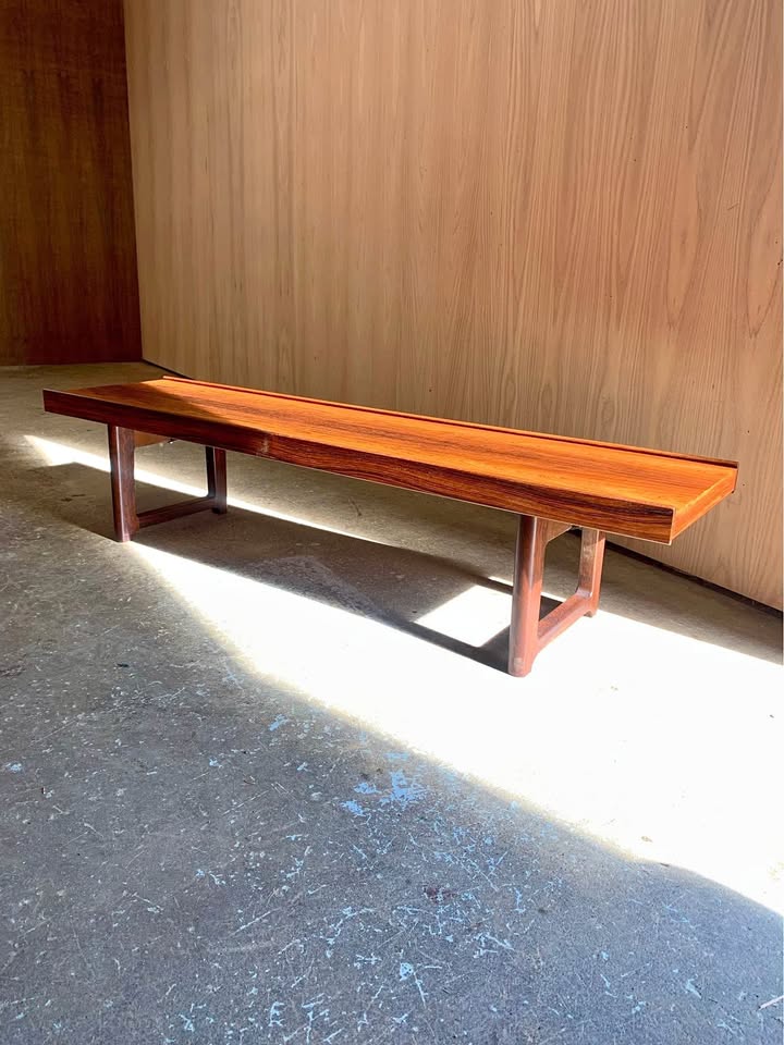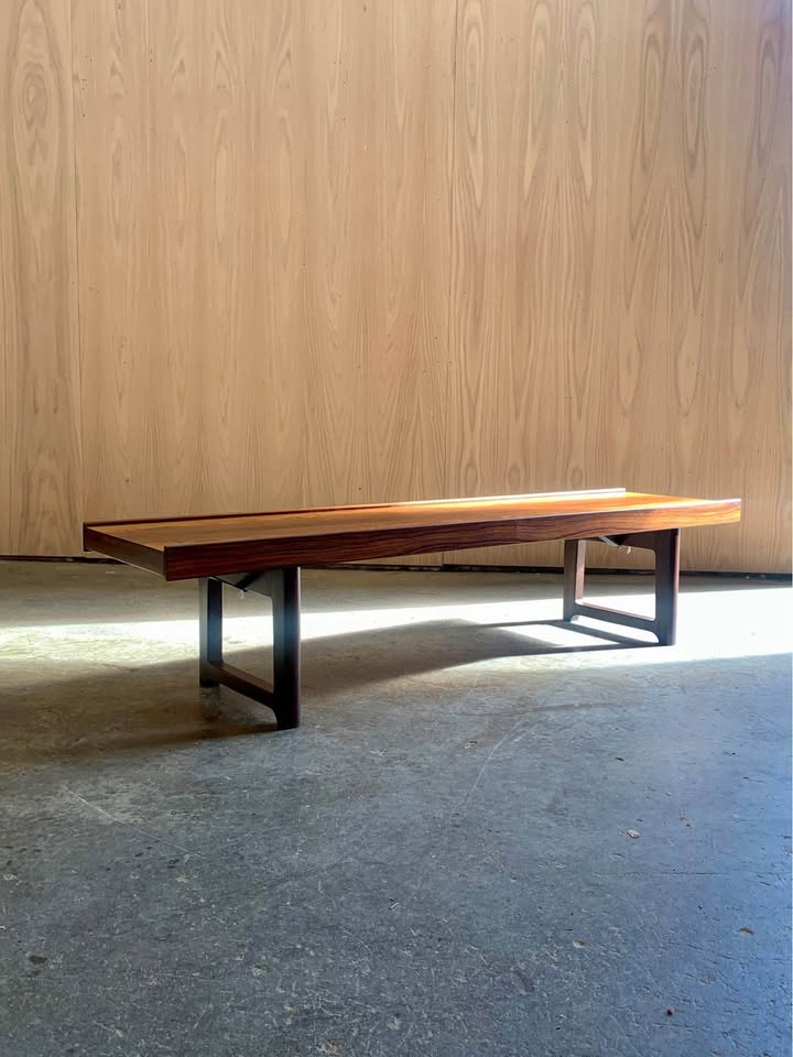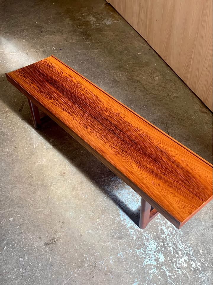 New to our collection, we’re honored to present this stunning Scandinavian modern “Krobo” bench by Torbjørn Afdal, designed in the 1960s. Celebrated for its elegant simplicity and remarkable versatility, this iconic piece functions beautifully as a bench, a low coffee table, or a striking window display. Crafted from highly figured Brazilian rosewood—one of our personal favorites—this example showcases the rich depth and character of its materials. Freshly restored to its full glory, it’s in outstanding condition and ready to elevate any space.