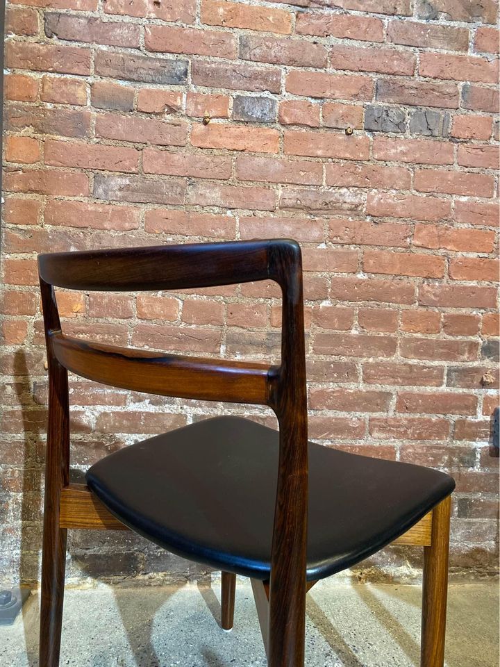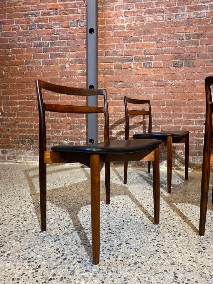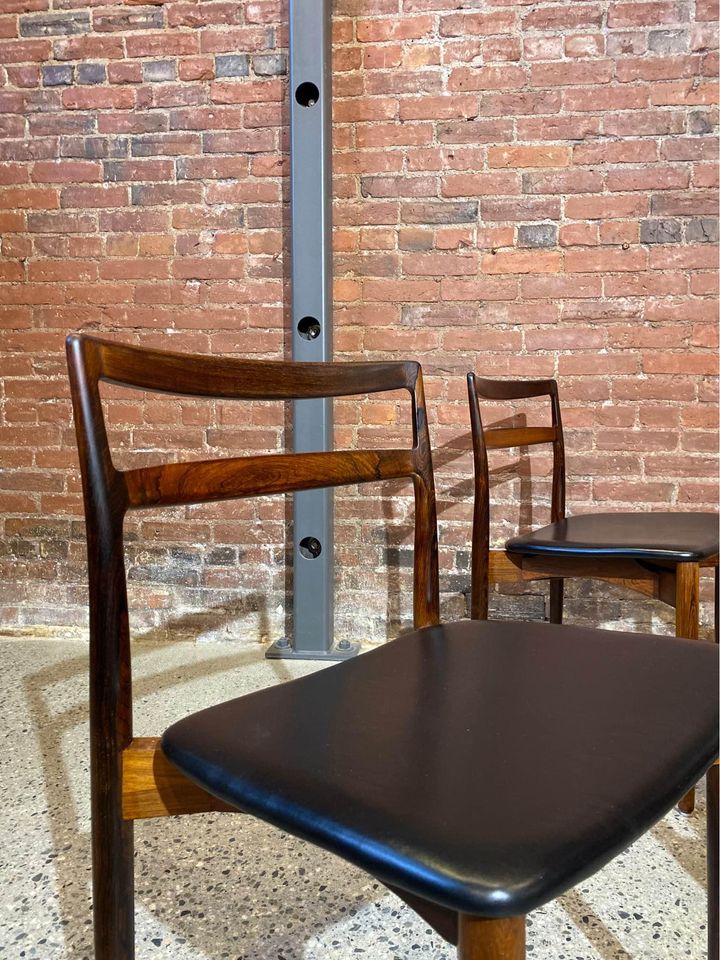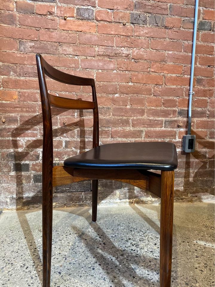 Fantastic set of Model 61 dining chairs designed by Harry Ostergaard for Randers Møbelfabrik circa 1961. These beautiful chairs are comprised of Brazilian rosewood and have unique construction that gives the seat a “floating” look. Each of these chairs has been completely restored with the utmost care and attention: joints glued, wood restored, and seats covered with new foam and the softest top grain Italian leather. The overall condition is exceptional!