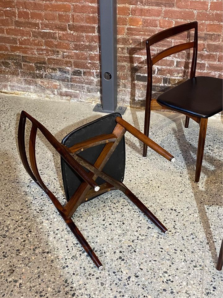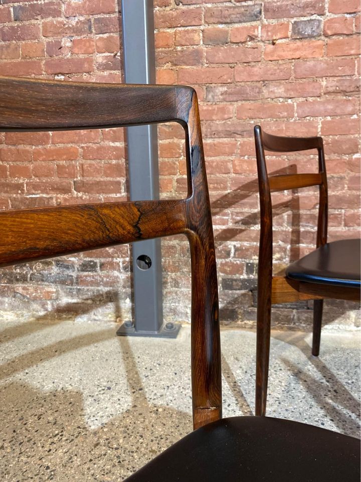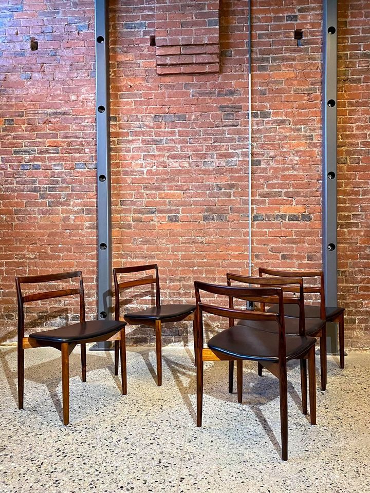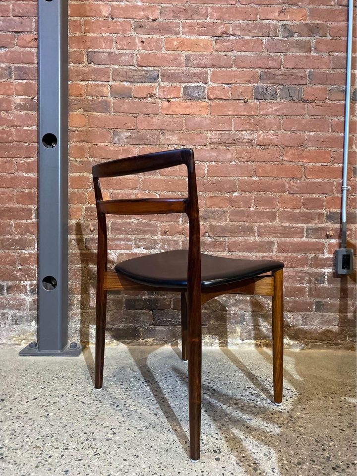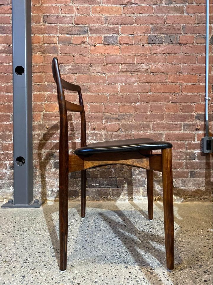 Fantastic set of Model 61 dining chairs designed by Harry Ostergaard for Randers Møbelfabrik circa 1961. These beautiful chairs are comprised of Brazilian rosewood and have unique construction that gives the seat a “floating” look. Each of these chairs has been completely restored with the utmost care and attention: joints glued, wood restored, and seats covered with new foam and the softest top grain Italian leather. The overall condition is exceptional!