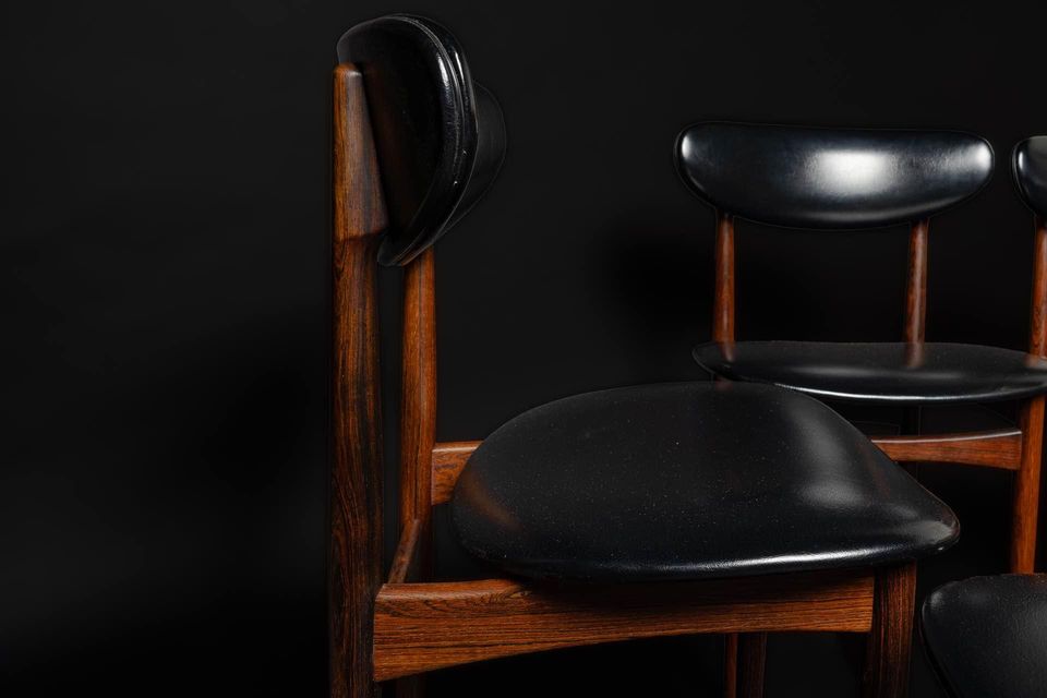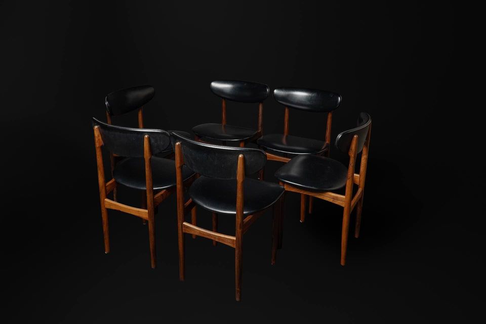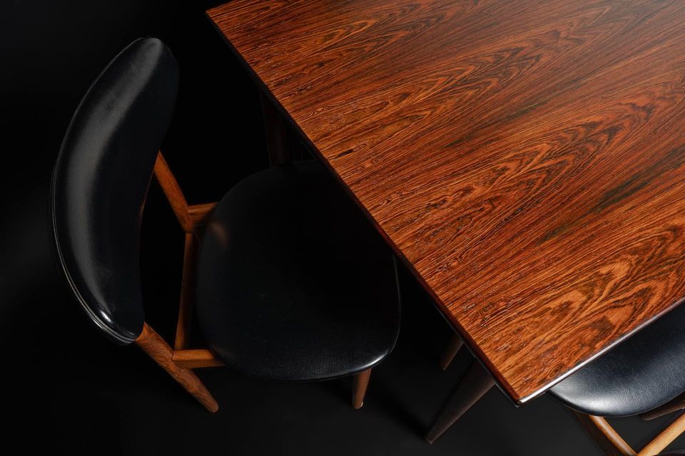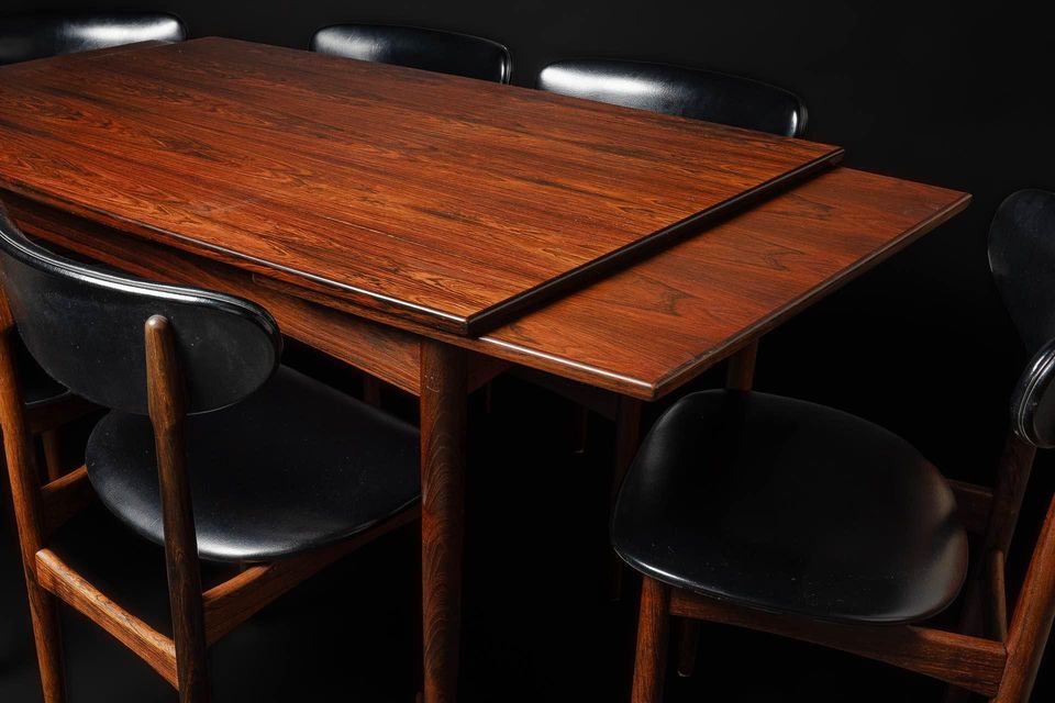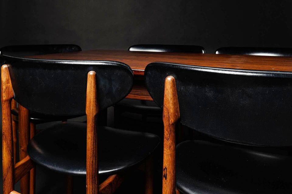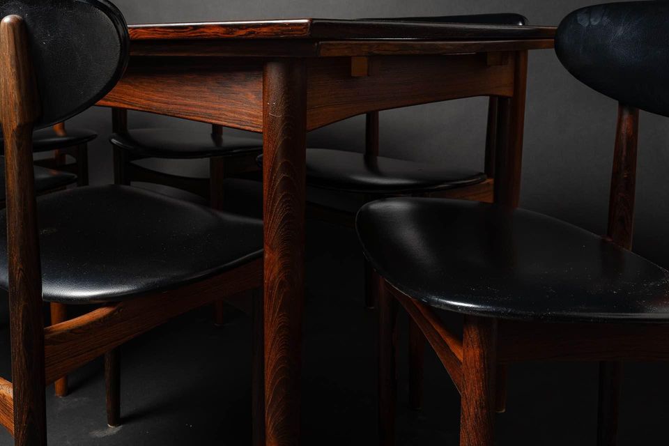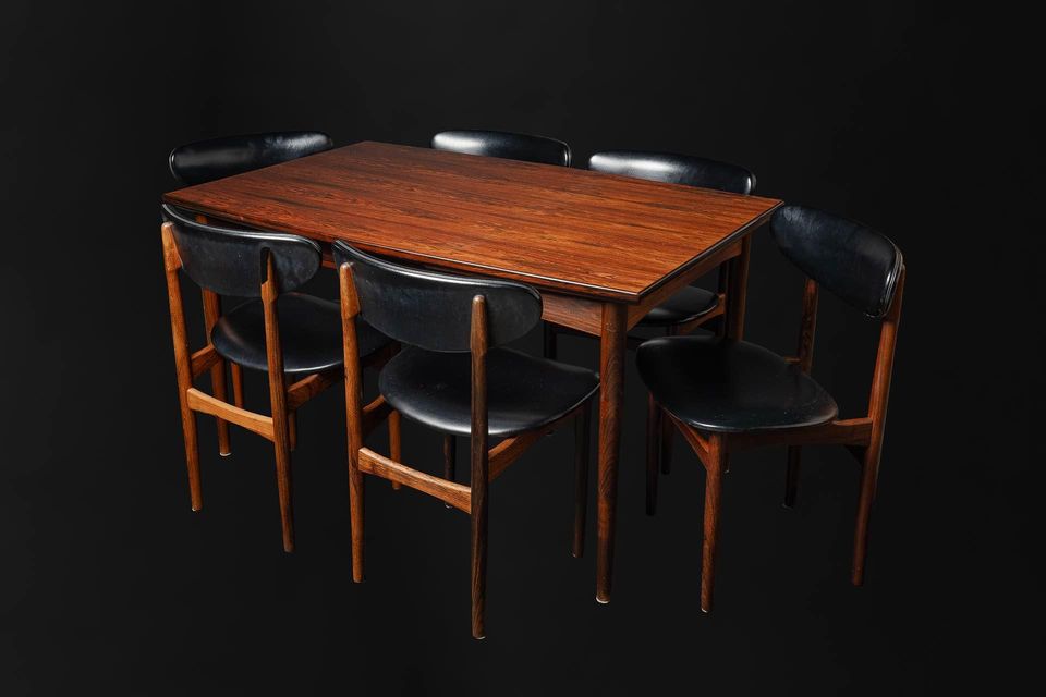 Exceptional Brazilian rosewood dining set made in Denmark in the early 1960s, this lovely seat features a draw leaf dining table and set of six chairs. The dining table is freshly restored and showcases exquisite graining of a rare wood that is no longer available. Brazilian rosewood is prized for its excellent durability but most importantly for its astounding beauty. The original matching chairs retain their original upholstery and are freshly cleaned, polished, and ready for another generation of love and use.