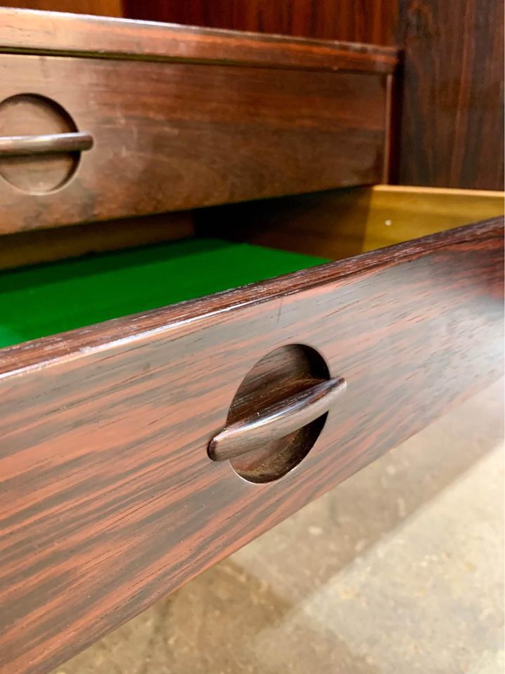 We are delighted to offer this exquisite Danish credenza by Arne Vodder, designed in the 1960s. Crafted from stunning Brazilian rosewood, it showcases remarkable craftsmanship and meticulous attention to detail. The piece offers adjustable shelving, a set of cutlery drawers, solid rosewood dovetailed larger drawers, and a fully finished back. It remains in good original condition with some minor marks, adding to its character. We are presenting it in its original state for a limited time before undergoing a full restoration.