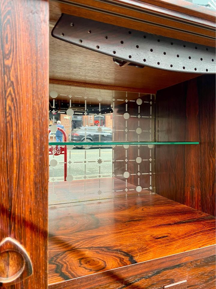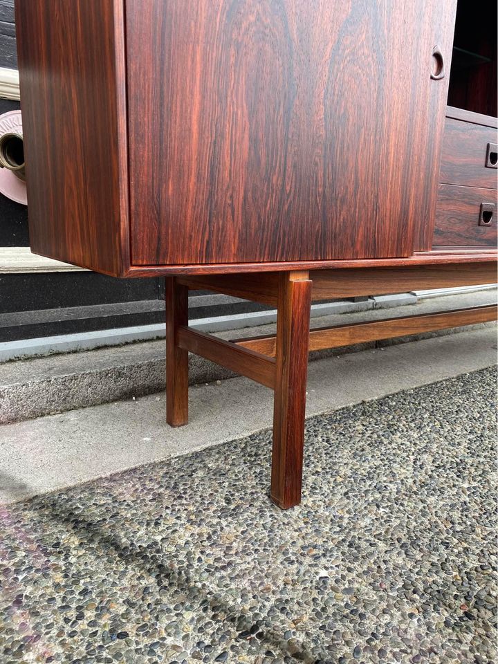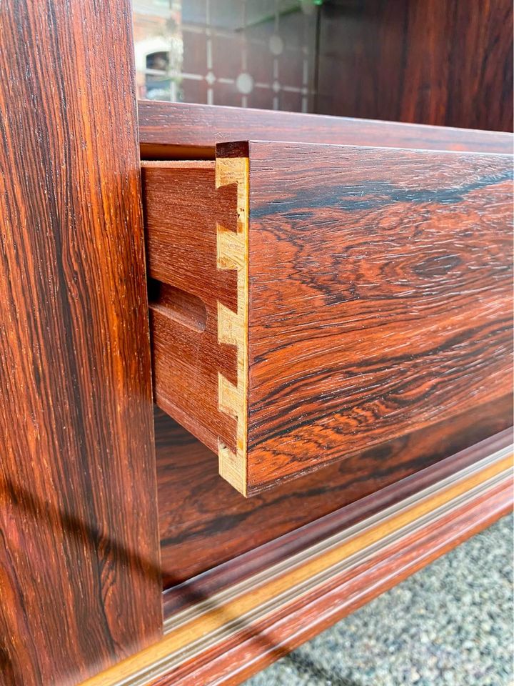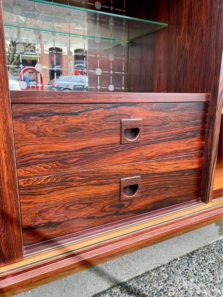 We're excited to introduce our newest addition: a stunning vintage Danish case piece, meticulously restored in our workshop. Crafted in the 1960s from exquisite Brazilian rosewood, its mesmerizing grain exudes charm. With a sturdy base, adjustable shelving on each side, two sets of drawers, and a mirrored bar in the center, this cabinet is as functional as it is elegant. Fully restored by our skilled team, it now radiates its original splendor, ready to enchant yet another generation.