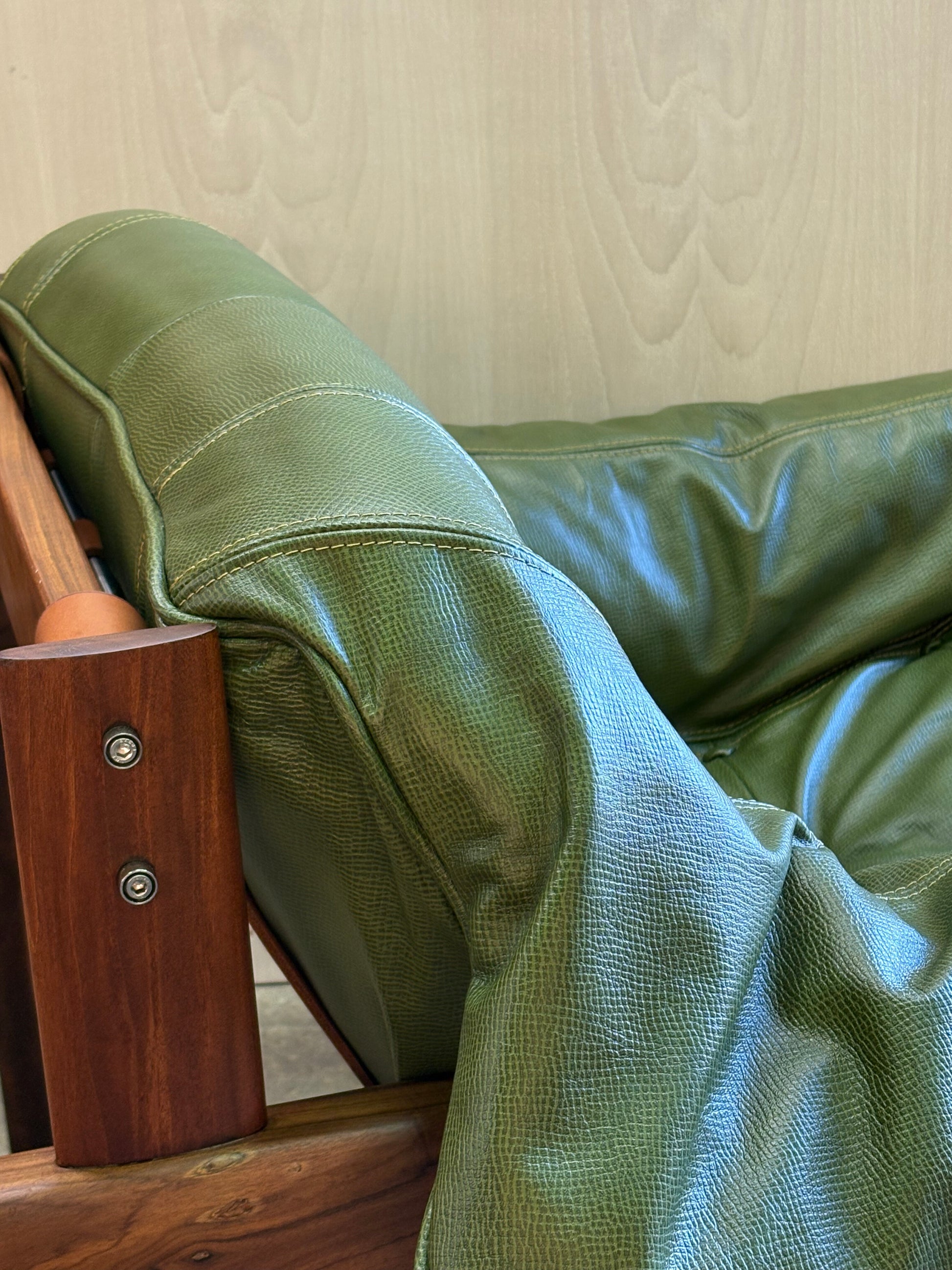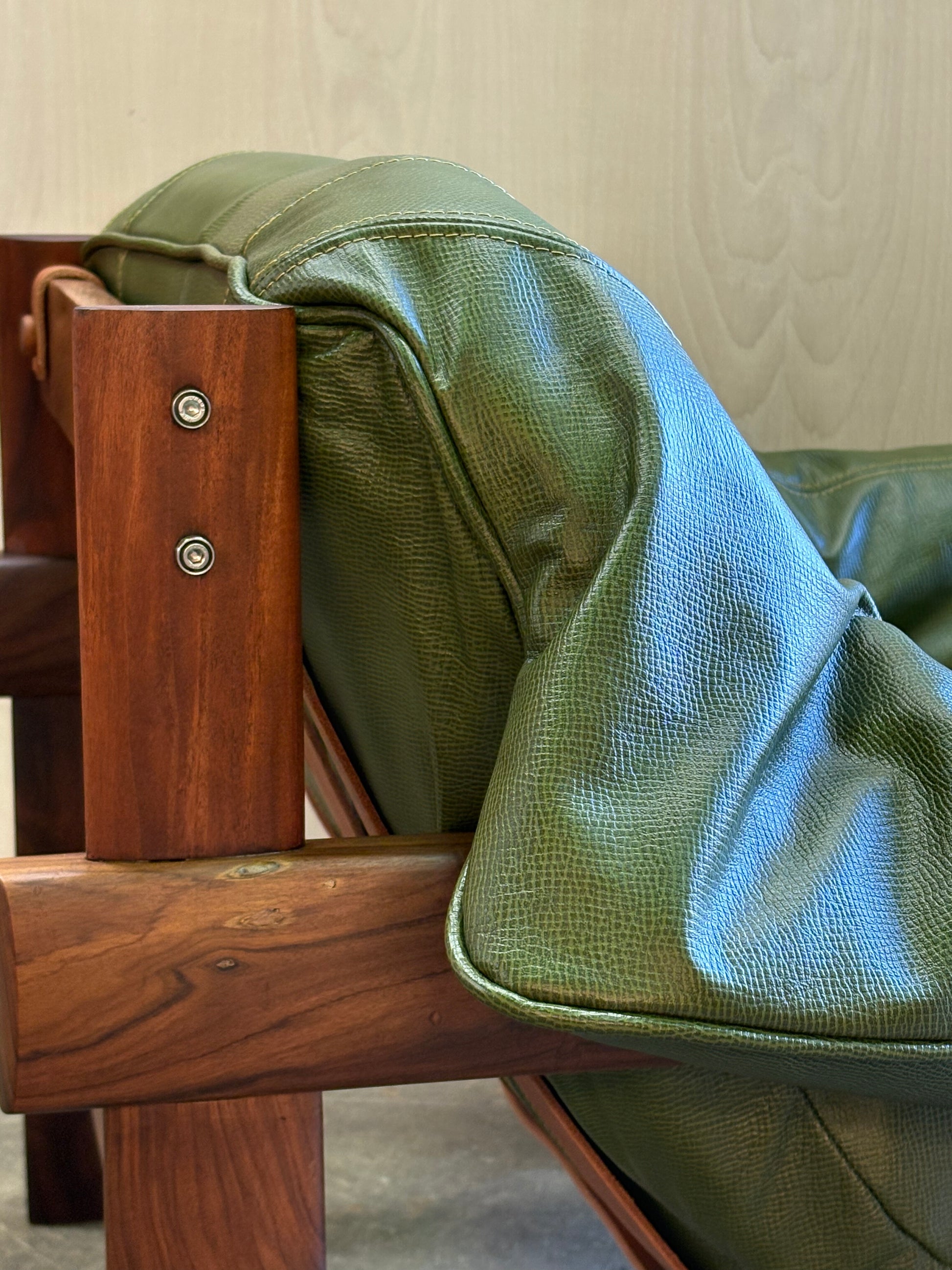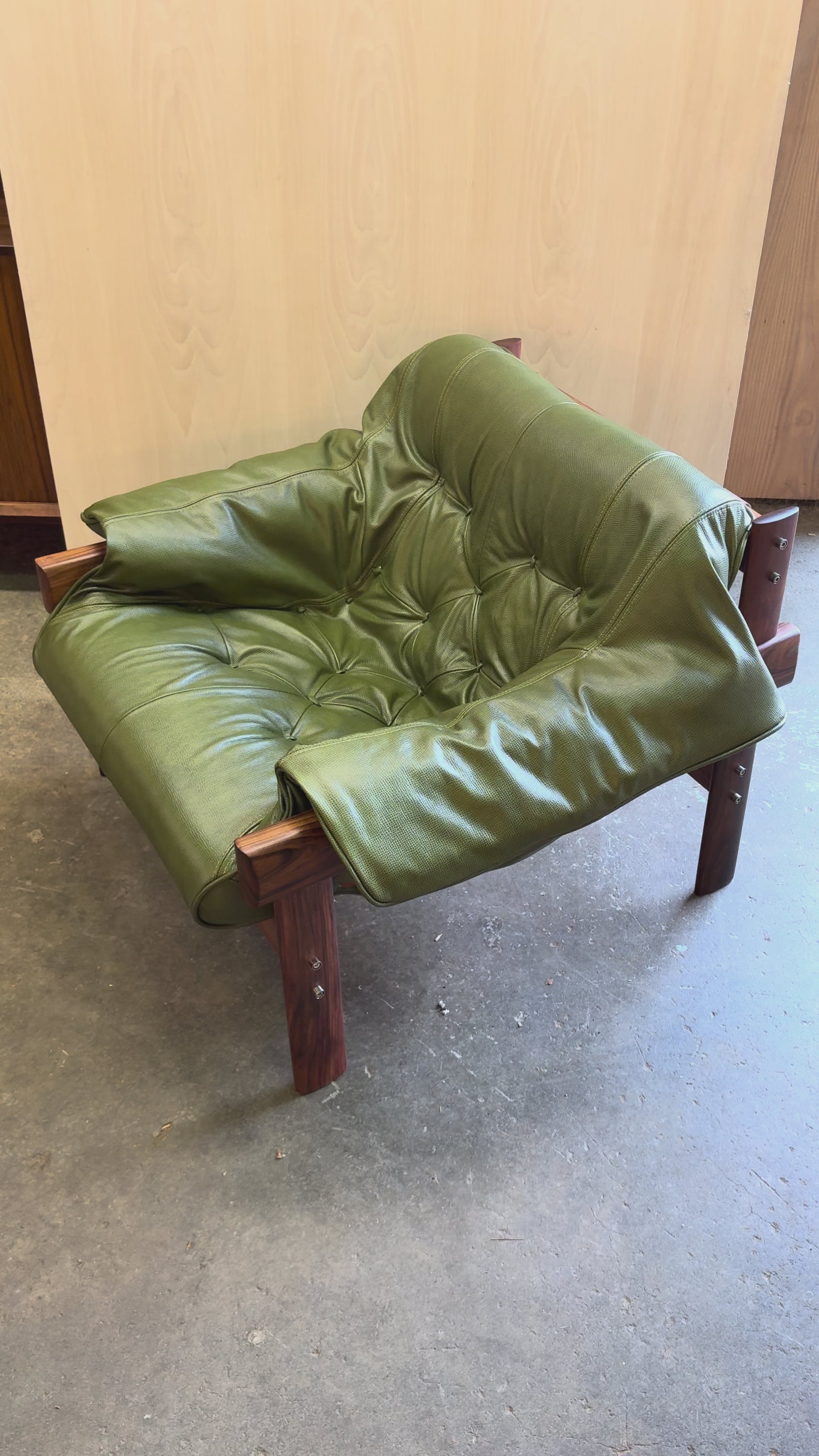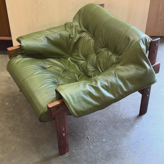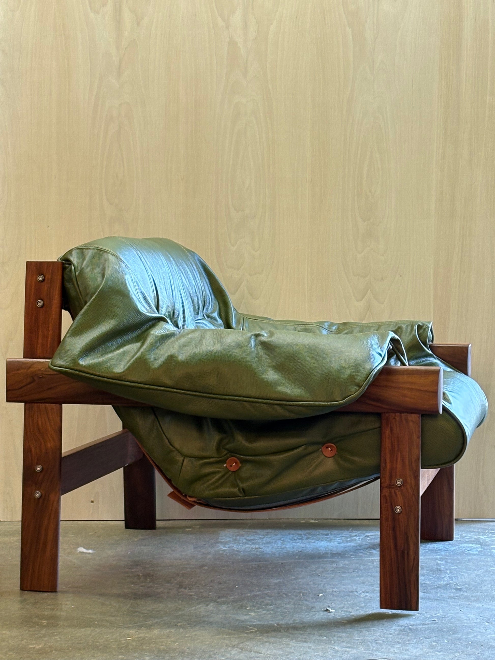 Designed by Percival Lafer and produced in Brazil during the 1960s, this MP-41 lounge chair embodies the warmth and ingenuity of mid-century Brazilian design. The sculptural frame is crafted from solid Jatobá wood, known for its rich tone and exceptional strength, supporting a deep sling seat suspended by new belt leather straps. The cushion has been completely rebuilt with new foam and upholstered in Traverso Safari leather by Cortina, a supple, full-grain hide that perfectly complements the chair’s organic form. Every detail—from the hand-stitched seams to the careful button tufting—has been restored by hand over countless hours, resulting in a finish that feels both authentic and luxurious. A true statement piece in impeccable condition, it captures Lafer’s signature balance of comfort, craftsmanship, and modernist spirit—inviting you to sink in and stay awhile.