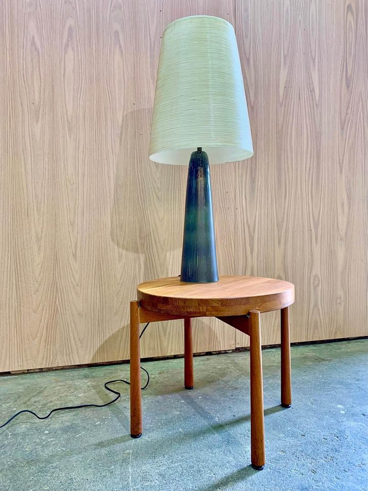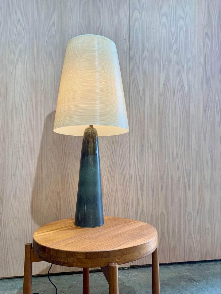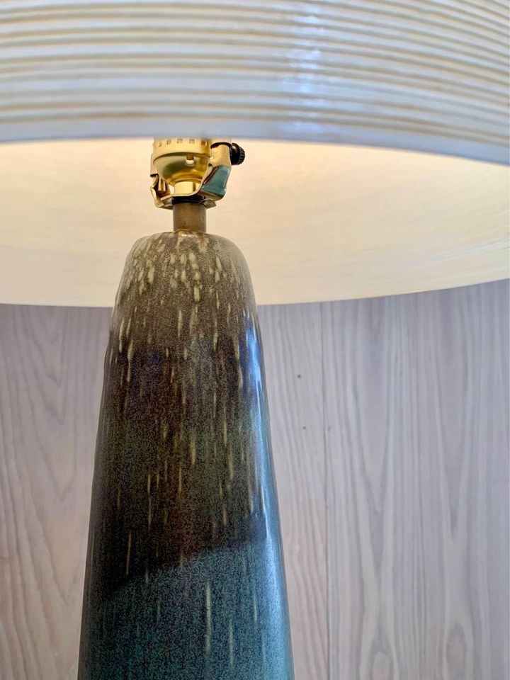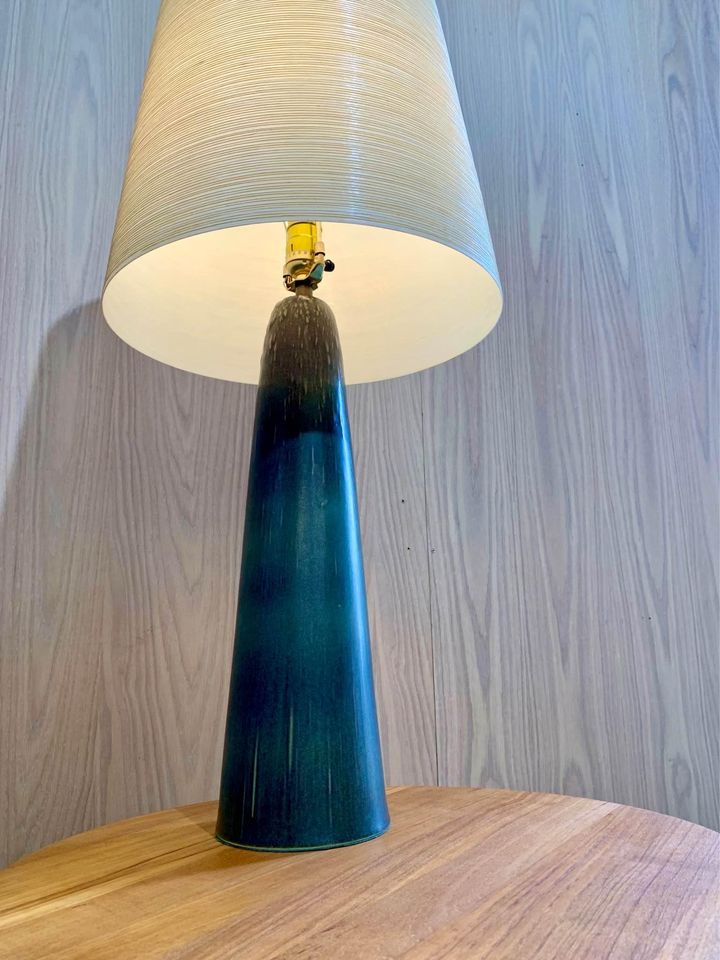 New to our collection is a rare and unique Lotte lamp, showcasing a captivating glaze unlike any we’ve seen before. Complete with its original shade and finial, this piece is truly one-of-a-kind. Be sure to take note of the signature on the base, adding to its distinctiveness.