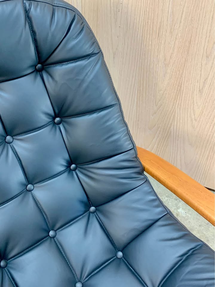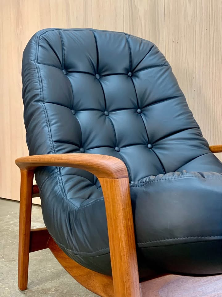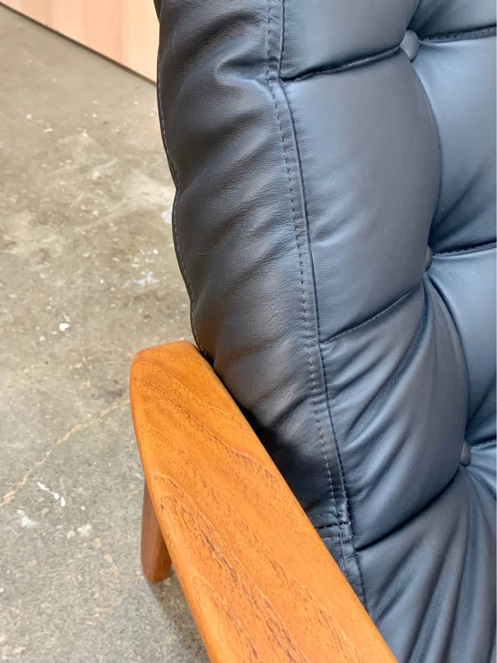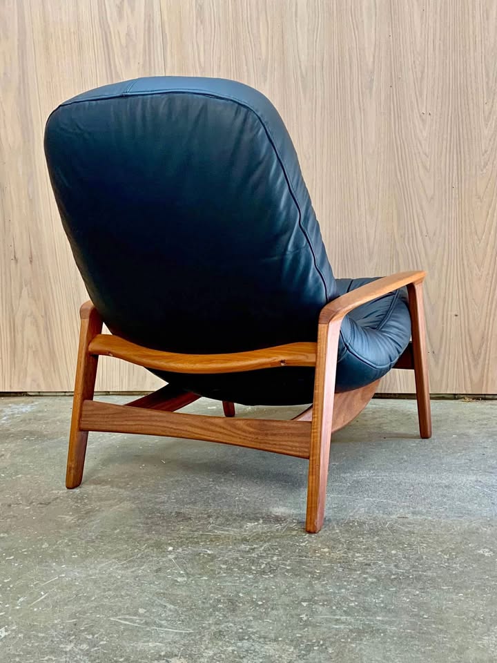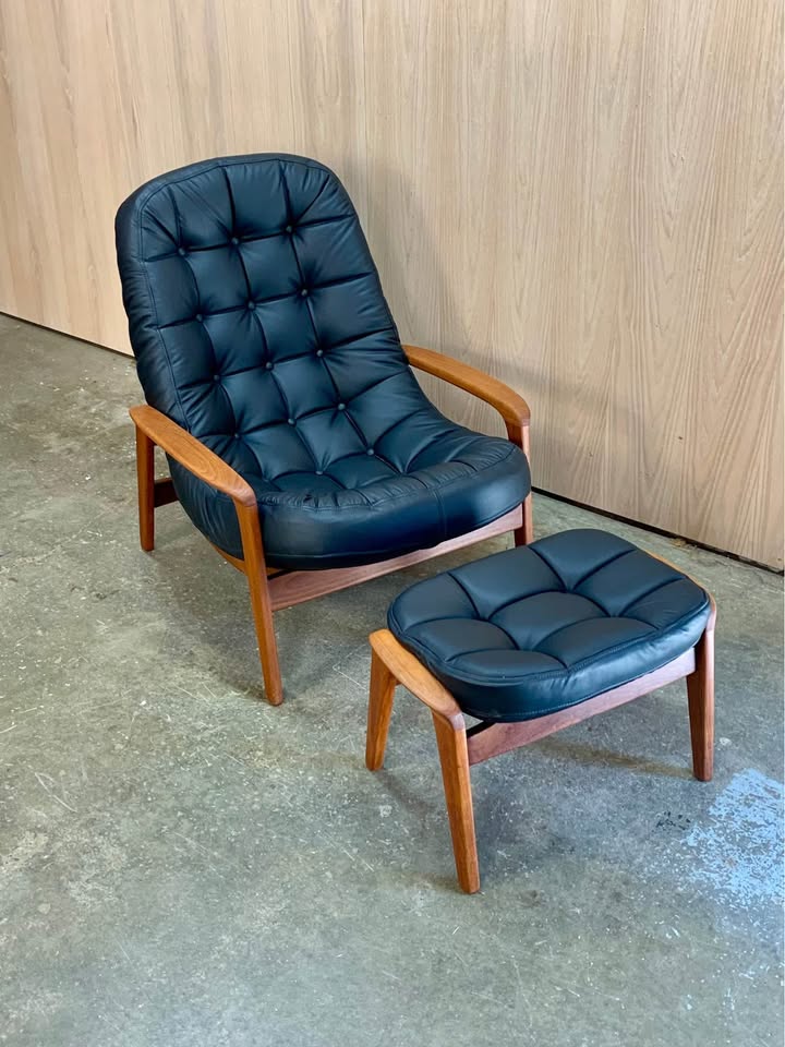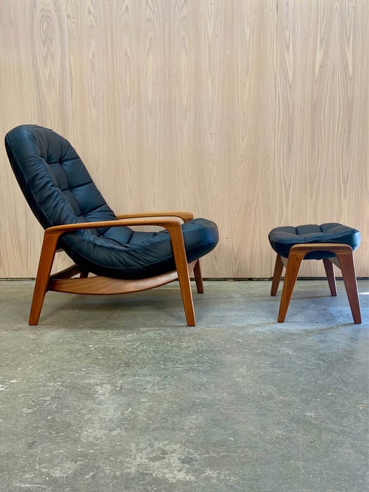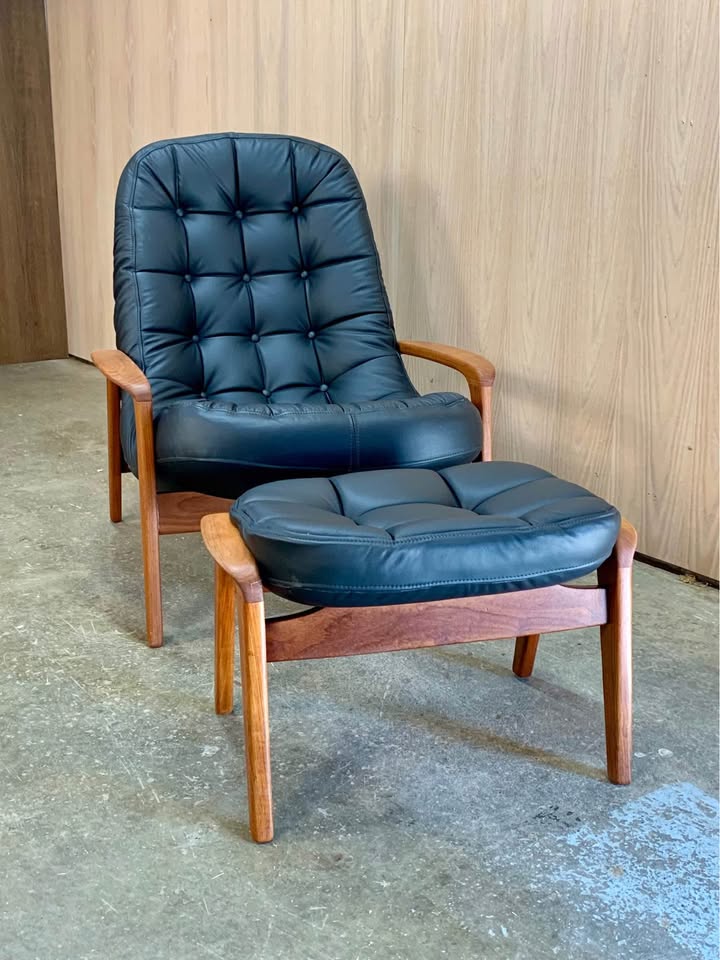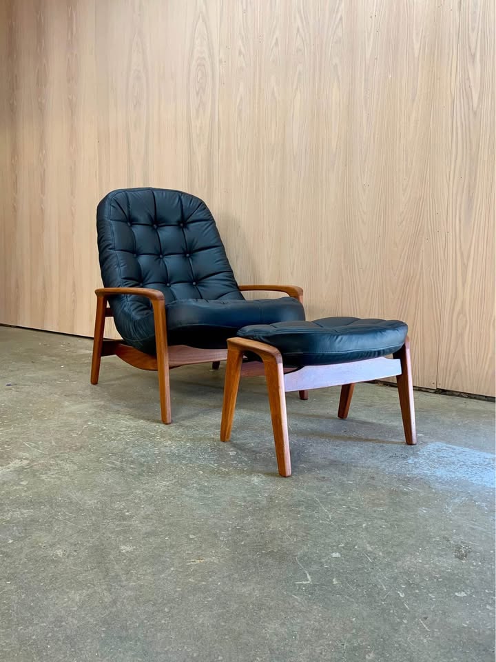 1960s Canadian Teak and Leather Scoop Lounge Chair and Ottoman