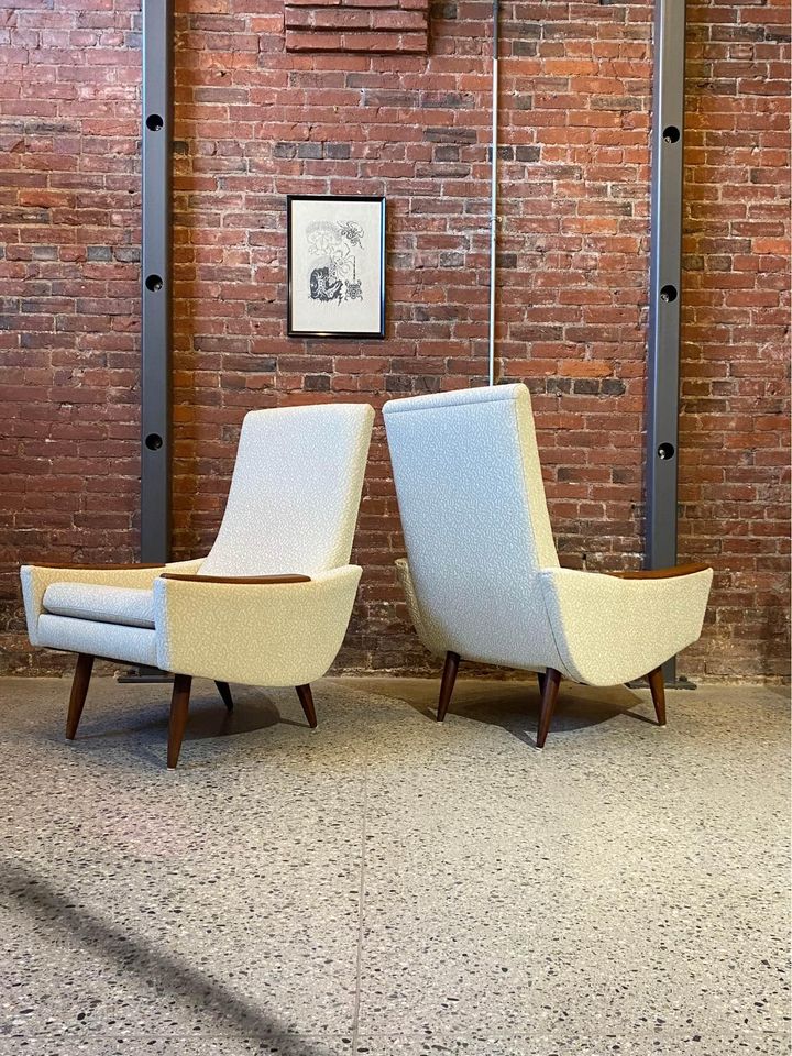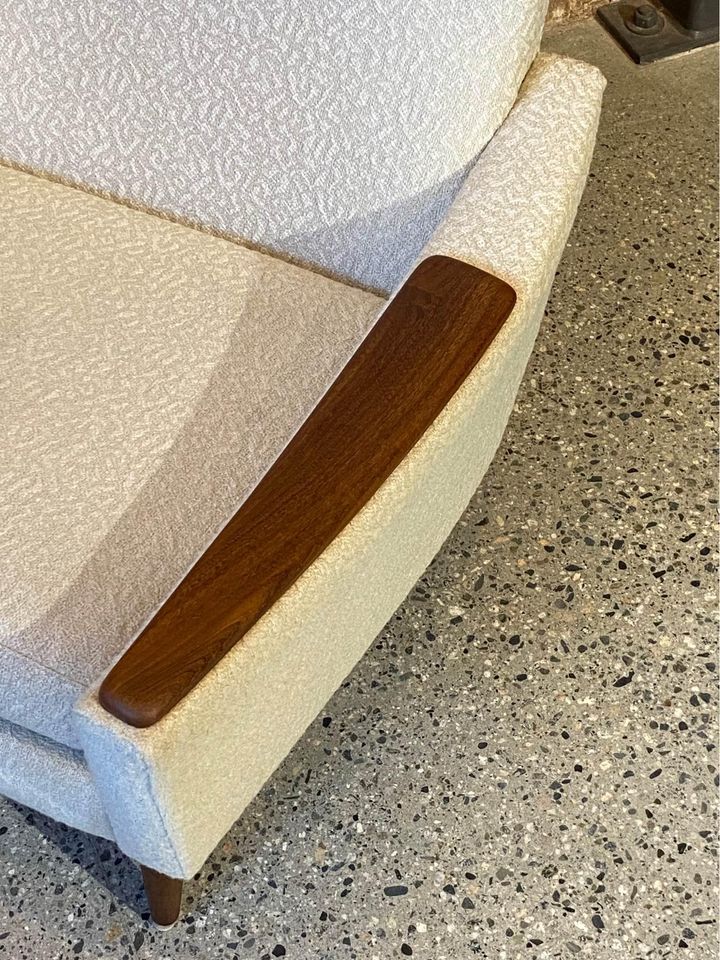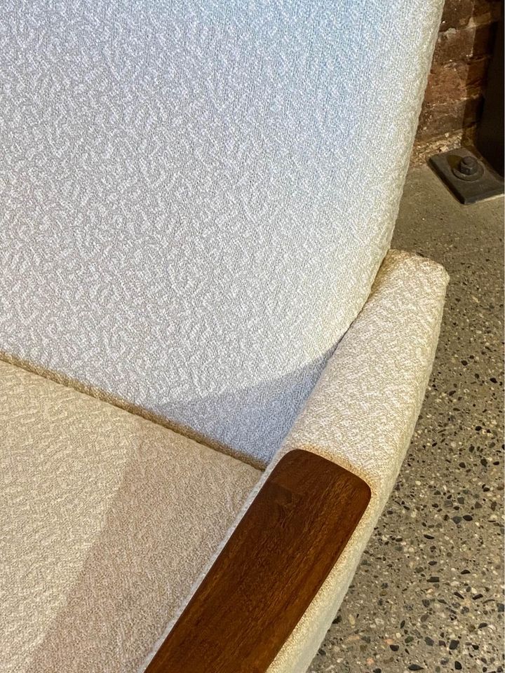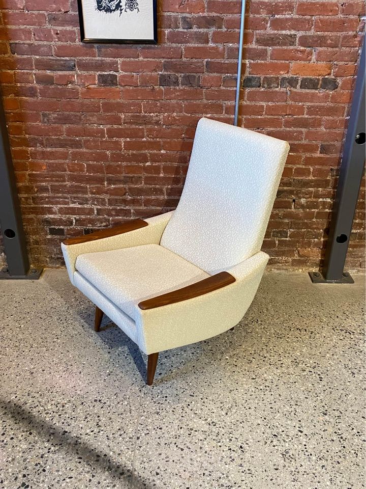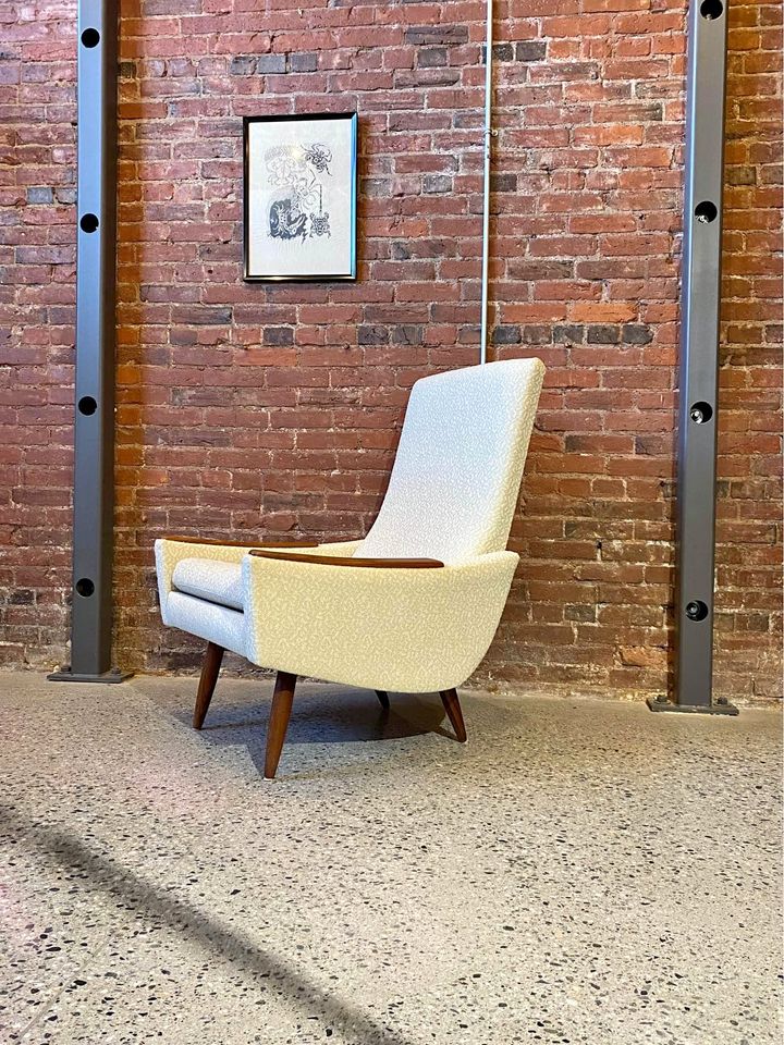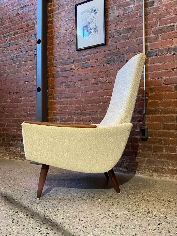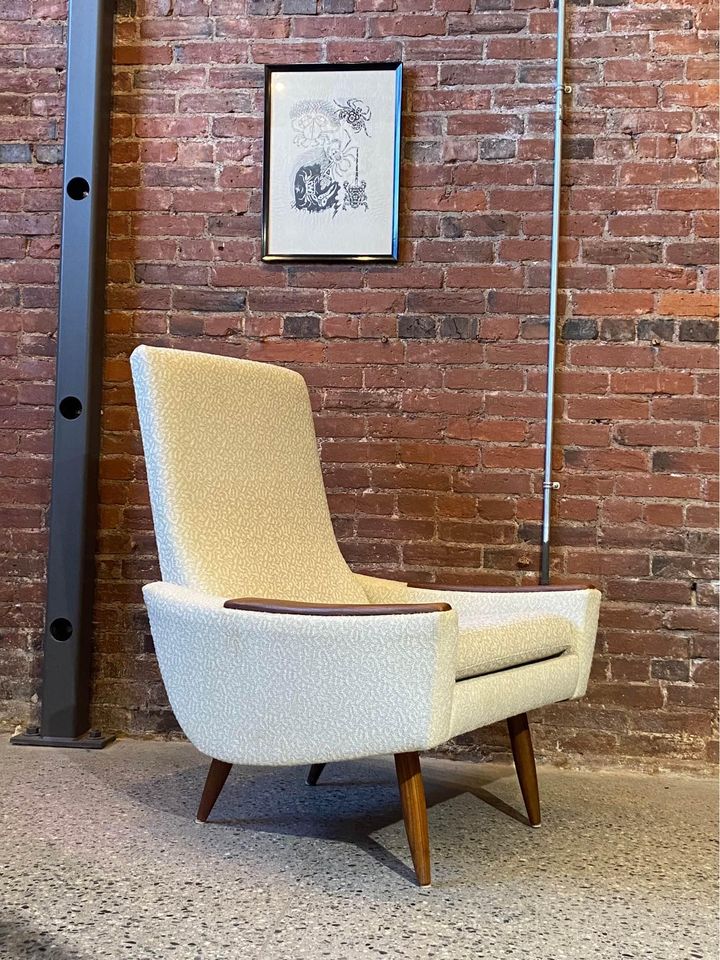 Discover this captivating high-back lounge chair, skillfully designed and crafted in Canada by R Huber & Co. Adorned with an elegant teak armrest, it boasts playful contours and offers unparalleled comfort with a higher seat than most mid century chairs. Meticulously restored by our expert team, this piece now stands in superb condition.