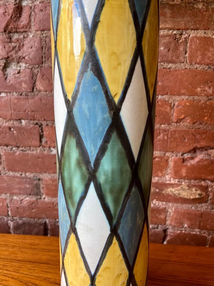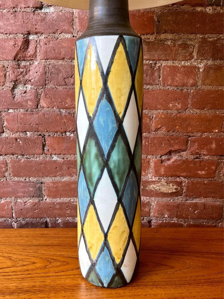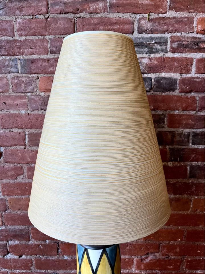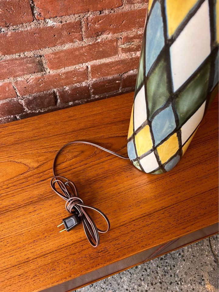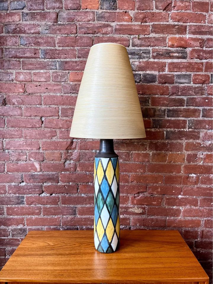 We are thrilled to offer this exquisite 1960s Handpainted Ceramic Table Lamp by Lotte and Gunnar Bustland. Adorned with an original fiberglass shade meticulously handpainted by the artists themselves, featuring a harmonious crisscross pattern in colors that blend seamlessly together, this lamp exudes timeless elegance and charm.