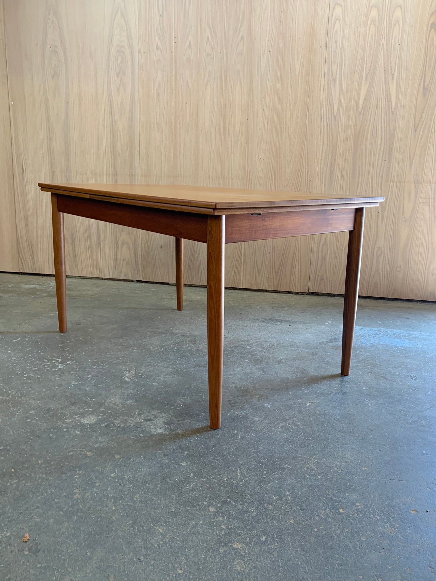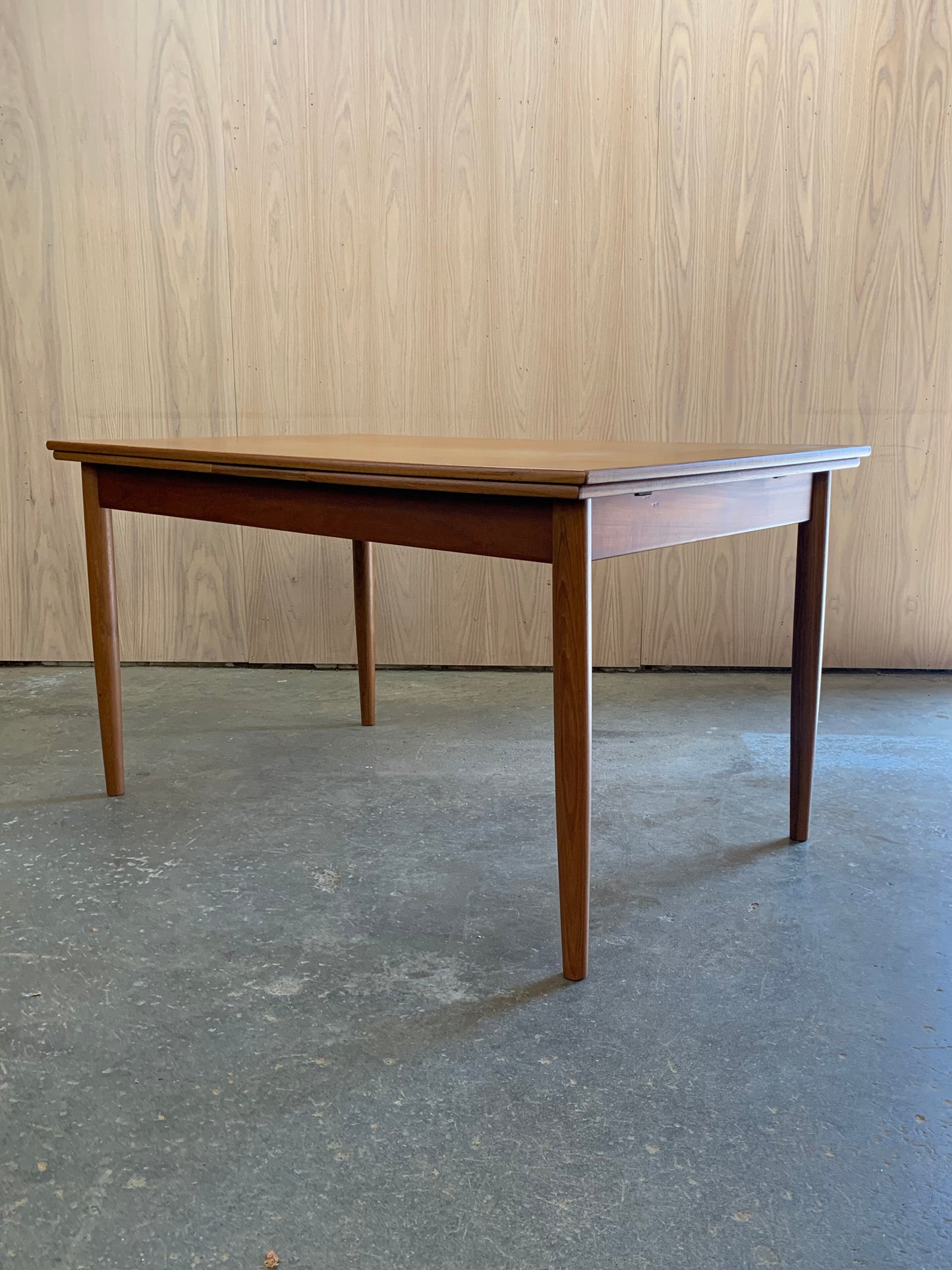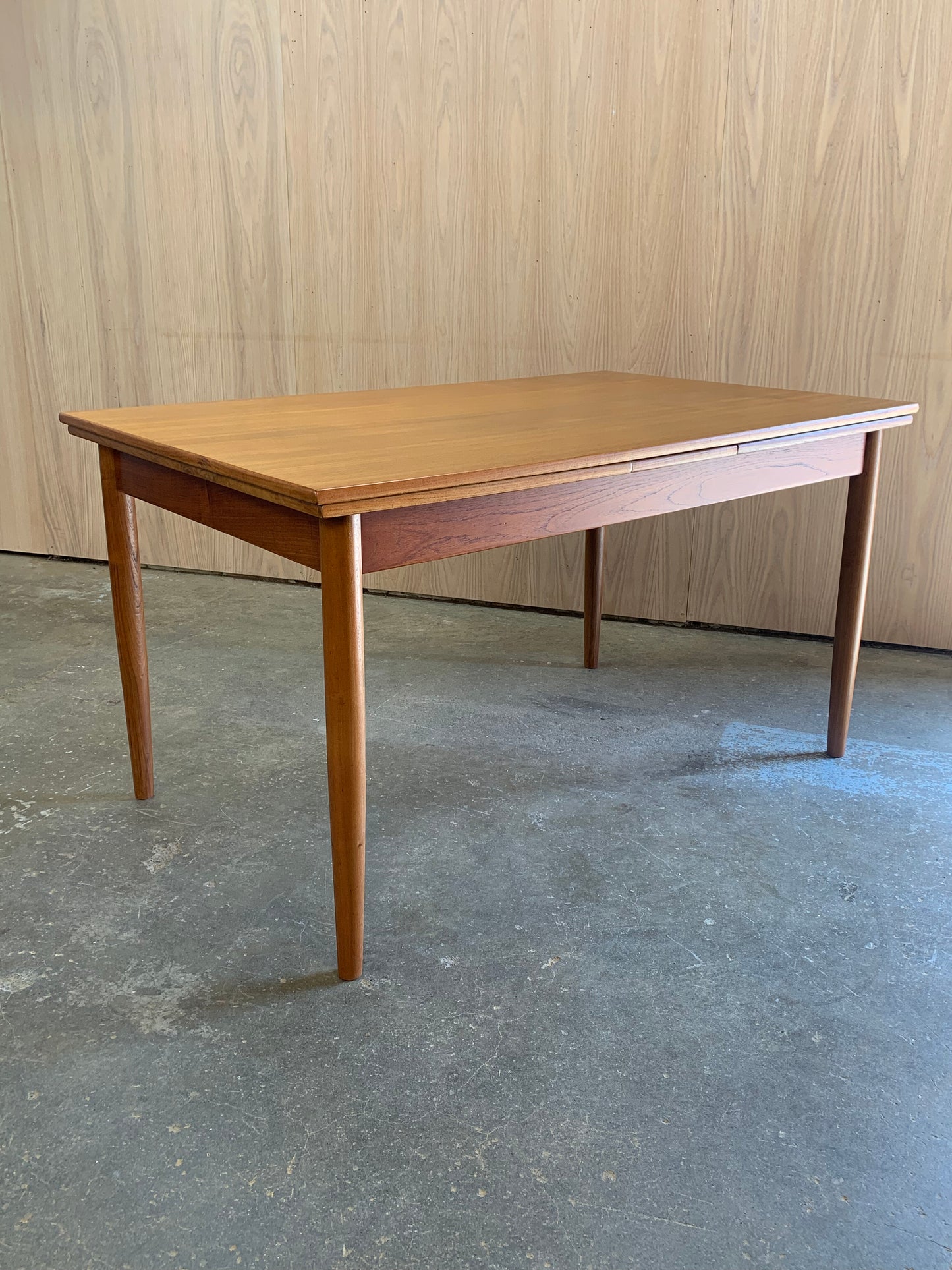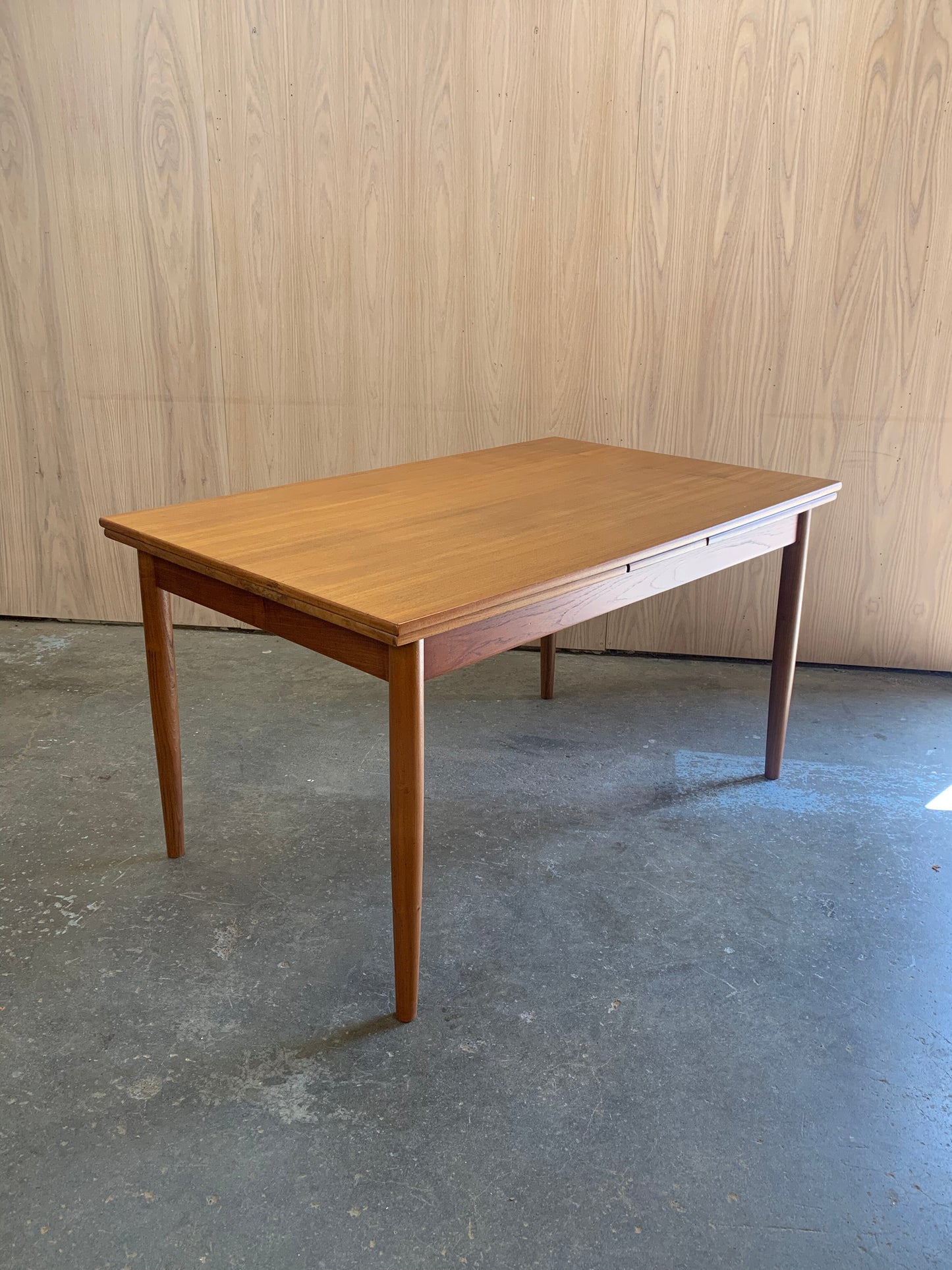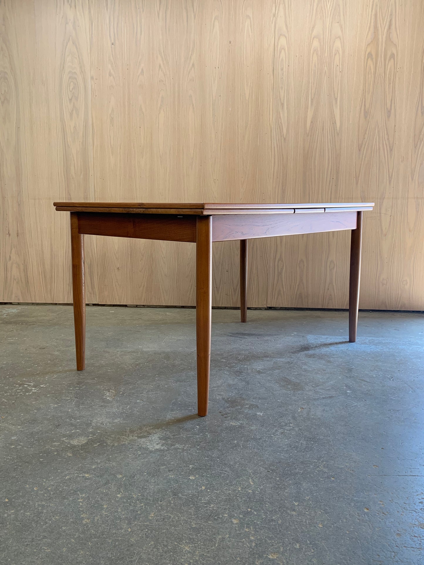 A beautifully balanced example of Danish modernism, this 1960s teak draw-leaf dining table features clean lines, thoughtful proportions, and excellent functionality. The slim profile and tapered legs lend a light, elegant presence, while the two self-storing extension leaves slide out effortlessly to accommodate larger gatherings.