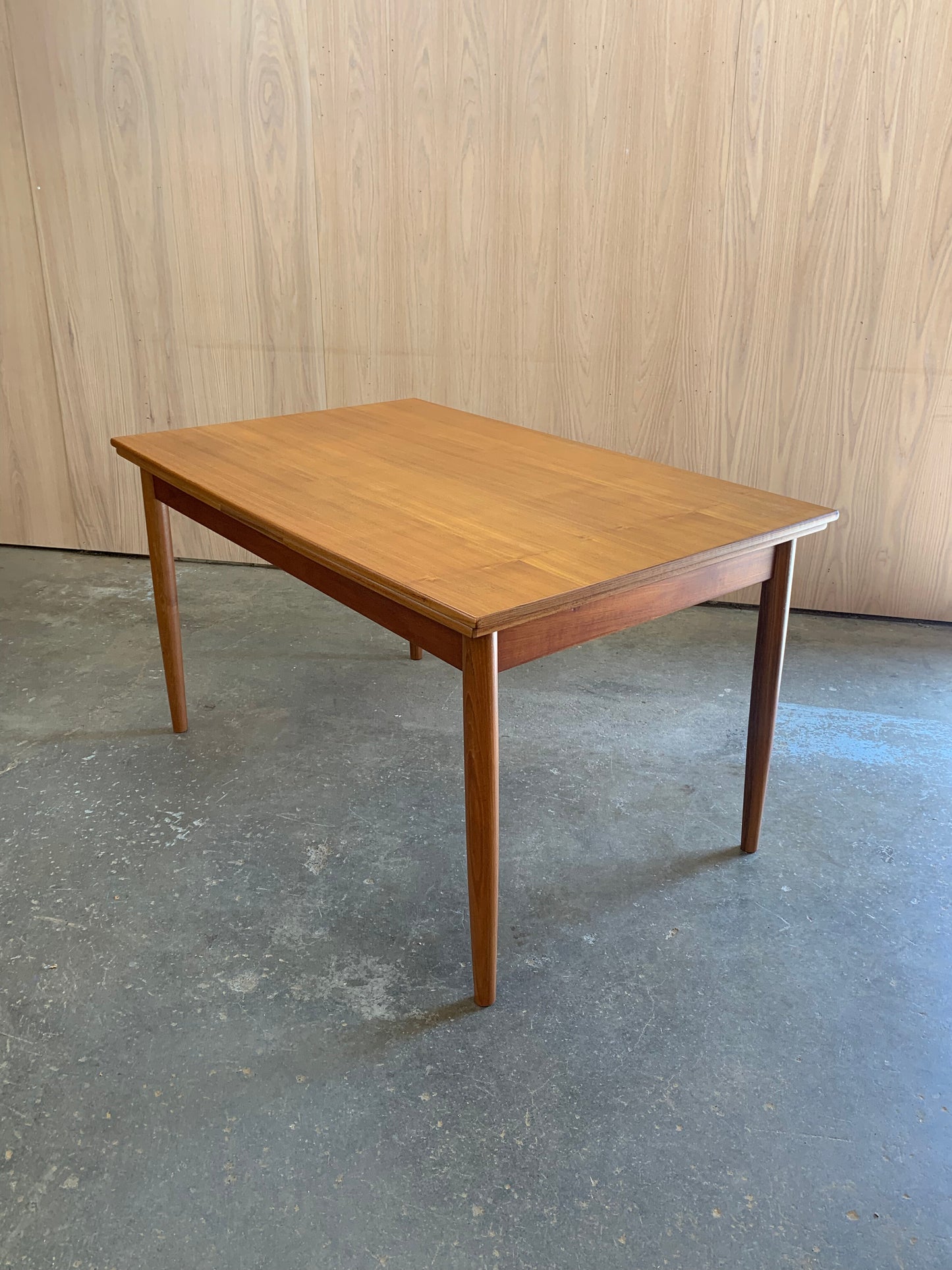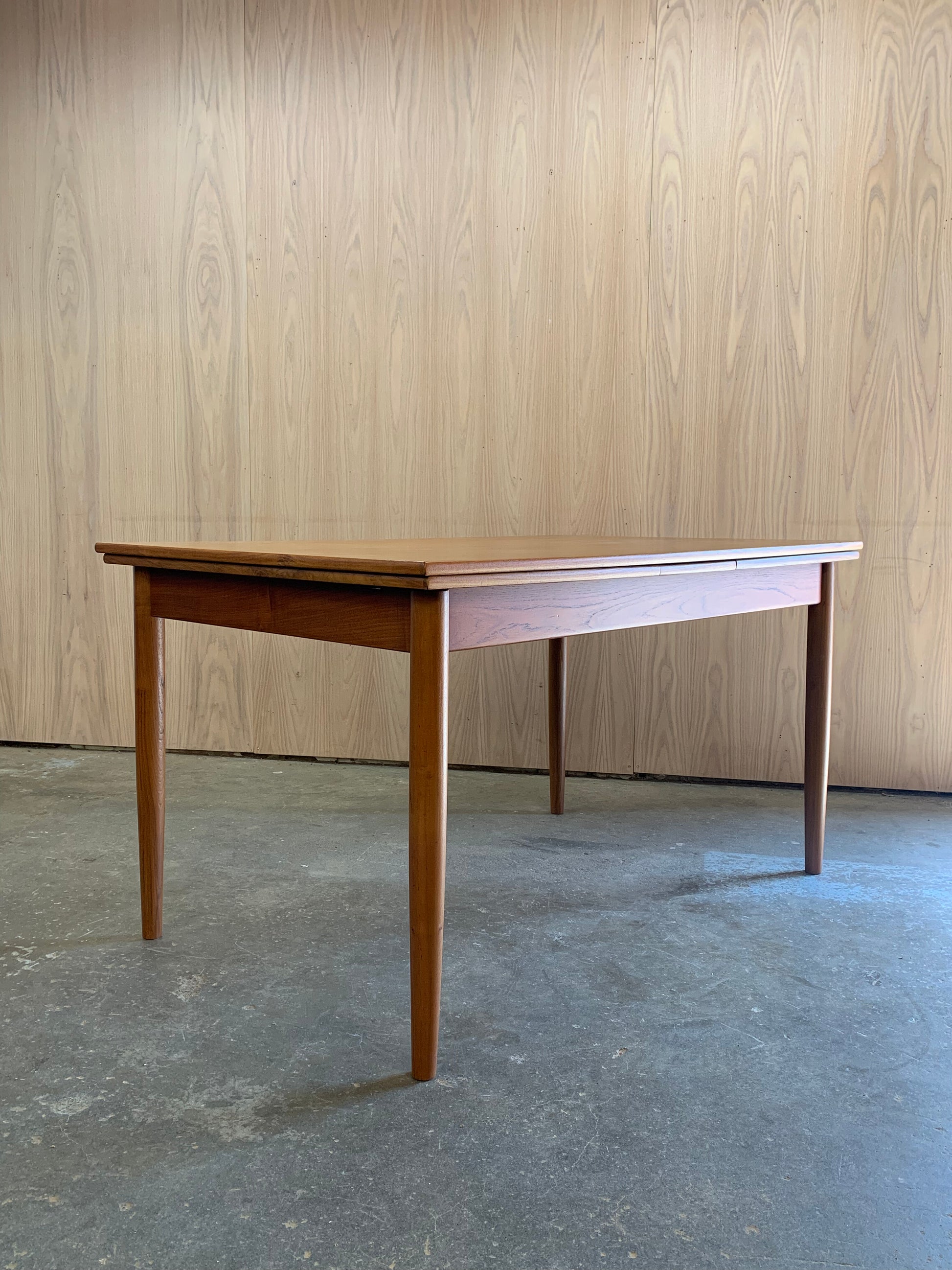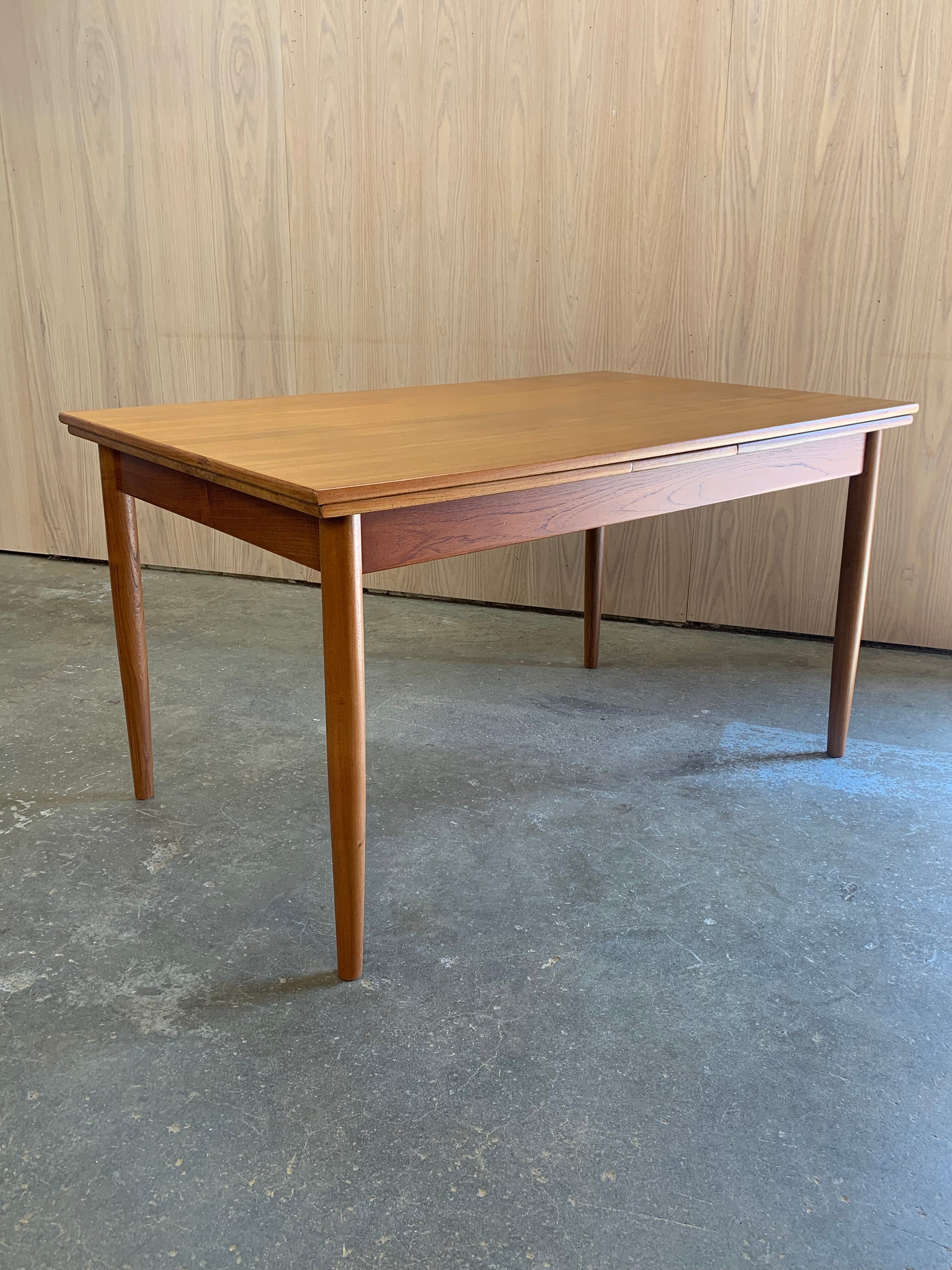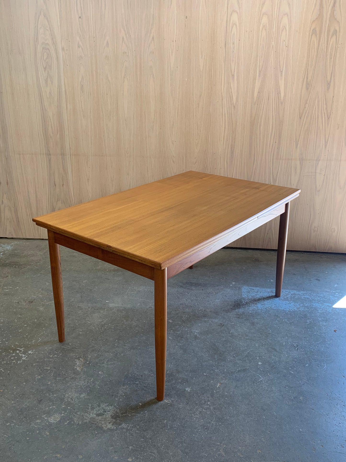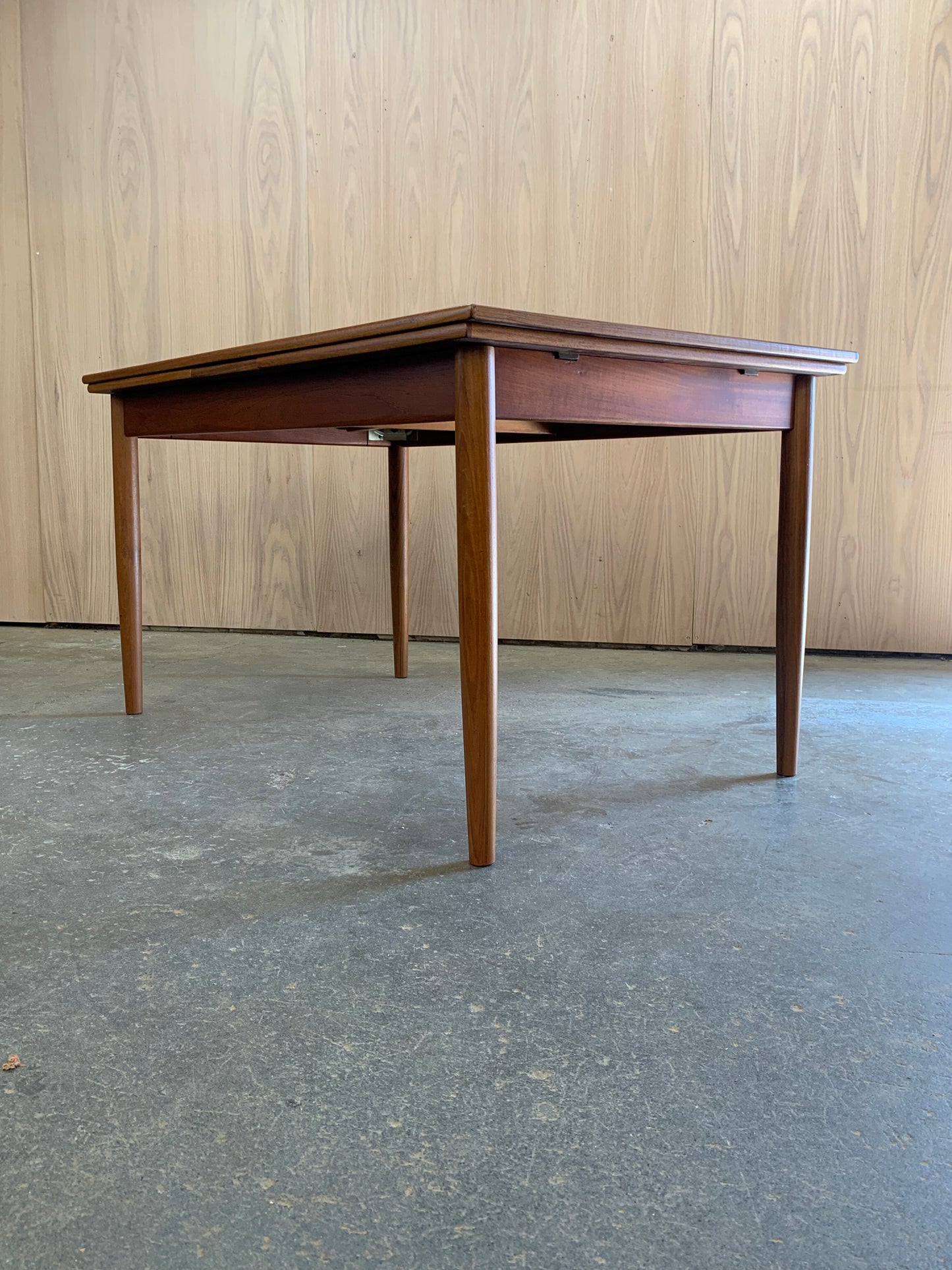 A beautifully balanced example of Danish modernism, this 1960s teak draw-leaf dining table features clean lines, thoughtful proportions, and excellent functionality. The slim profile and tapered legs lend a light, elegant presence, while the two self-storing extension leaves slide out effortlessly to accommodate larger gatherings.