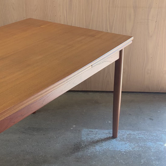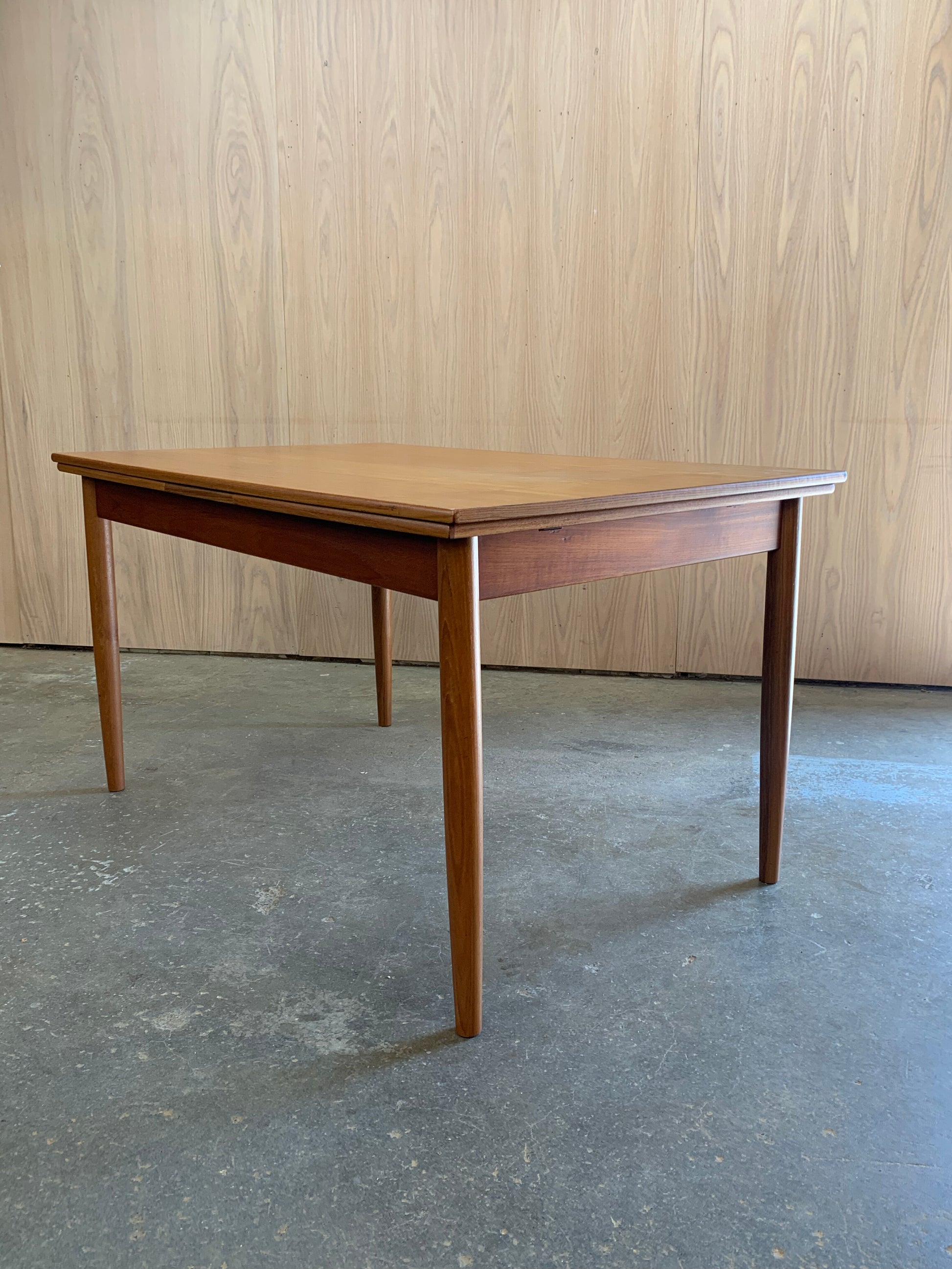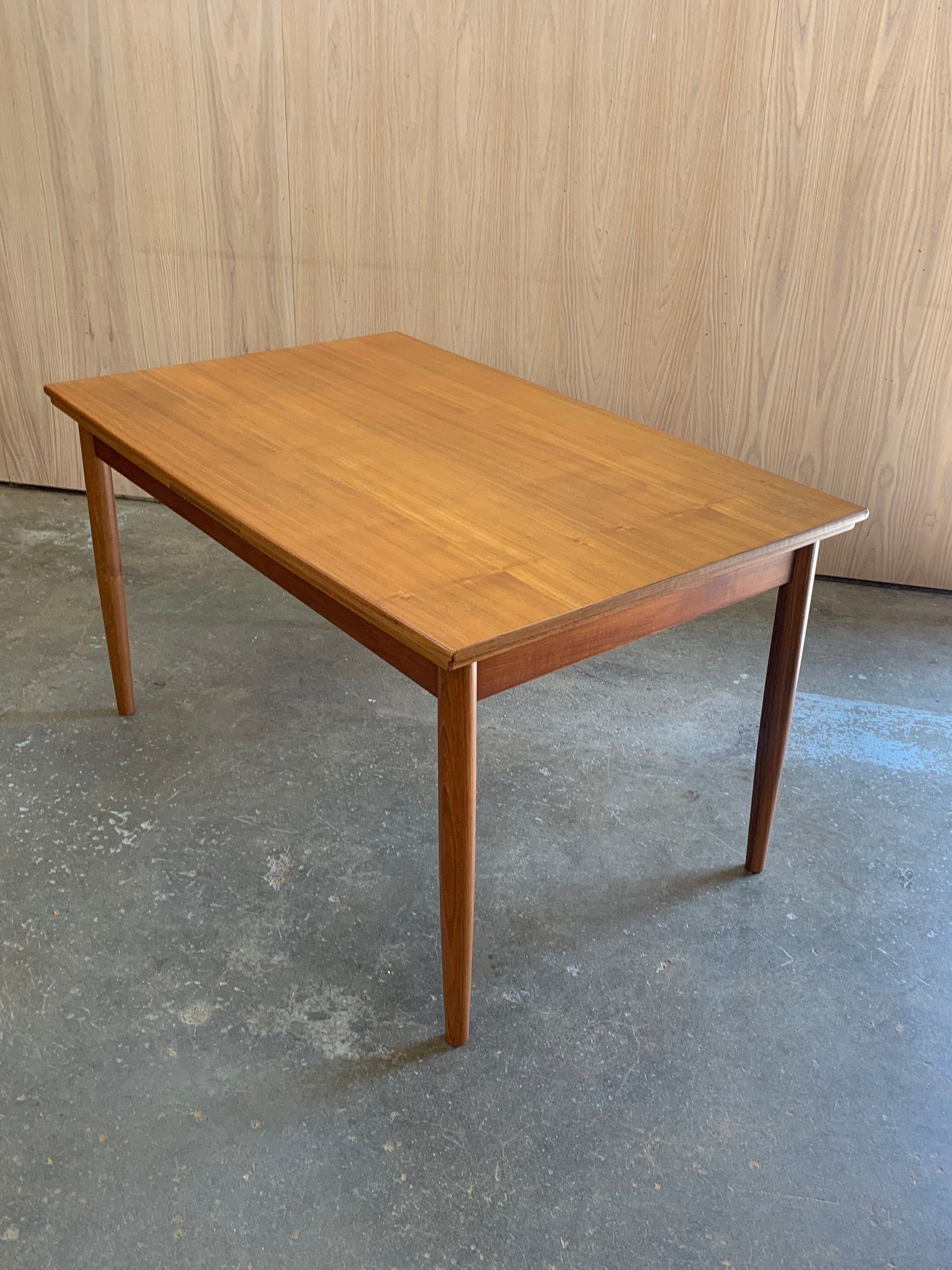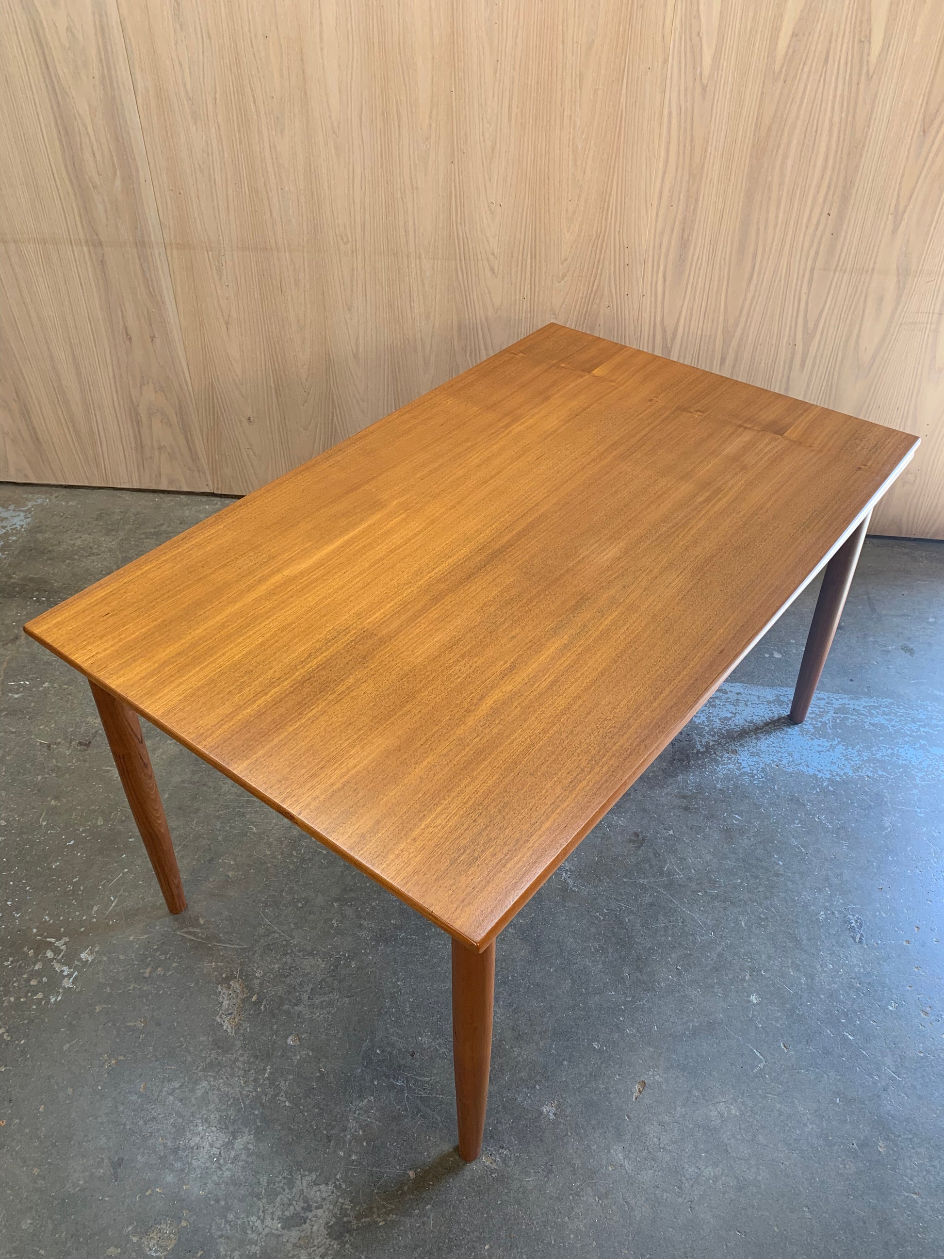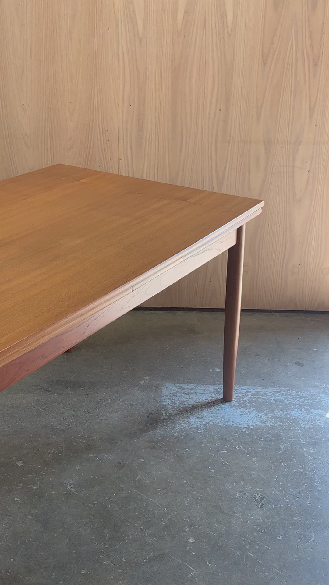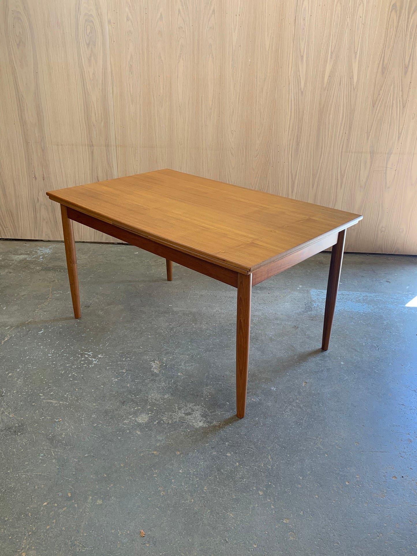 A beautifully balanced example of Danish modernism, this 1960s teak draw-leaf dining table features clean lines, thoughtful proportions, and excellent functionality. The slim profile and tapered legs lend a light, elegant presence, while the two self-storing extension leaves slide out effortlessly to accommodate larger gatherings.
