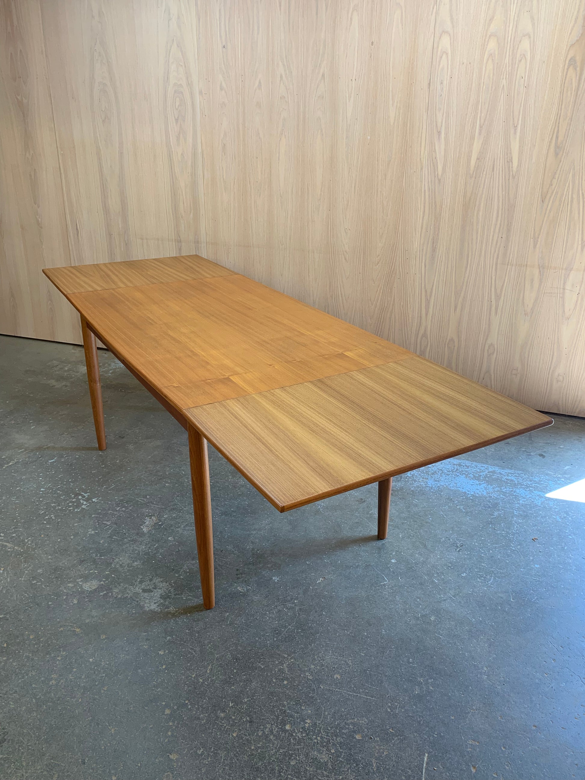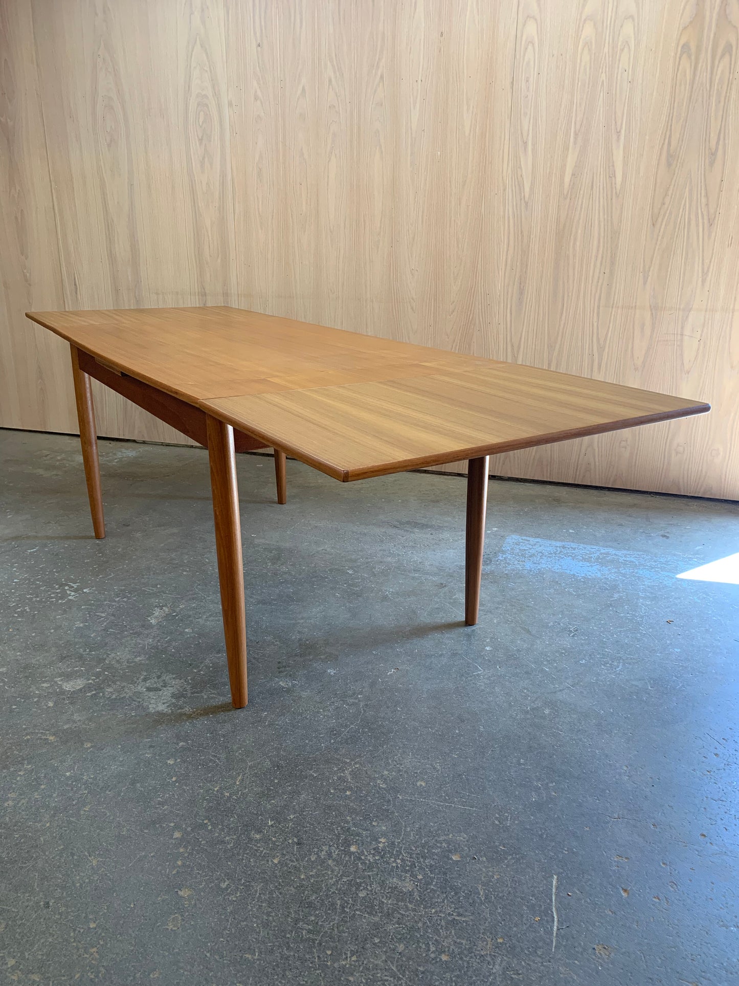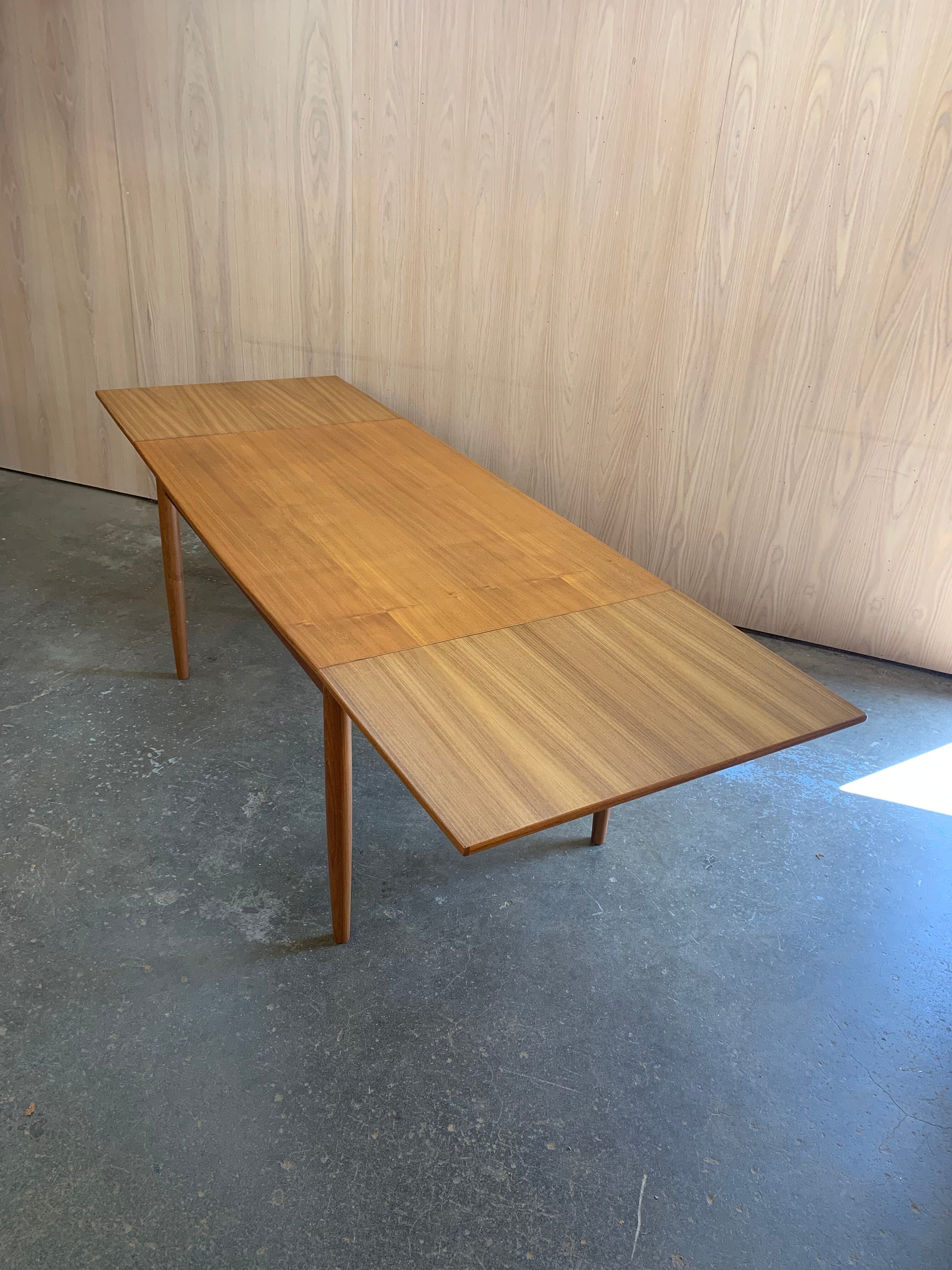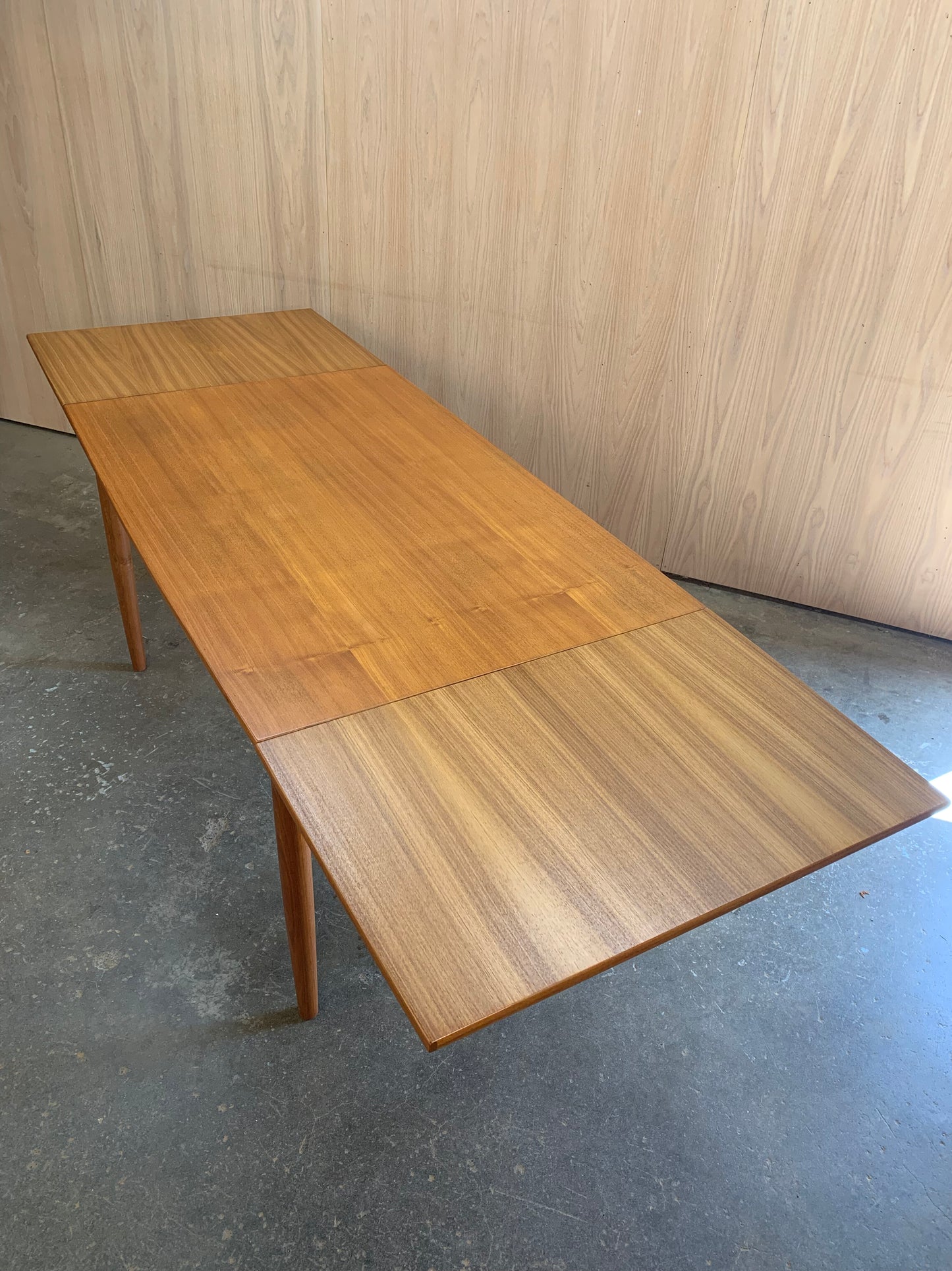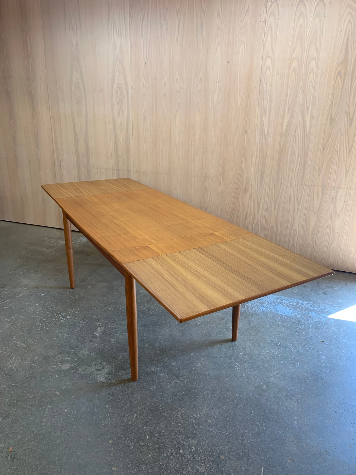 Crafted in richly grained teak and meticulously restored by our team, the table is in excellent condition throughout. The leaves tuck neatly beneath the main top, preserving its sleek silhouette when not in use.