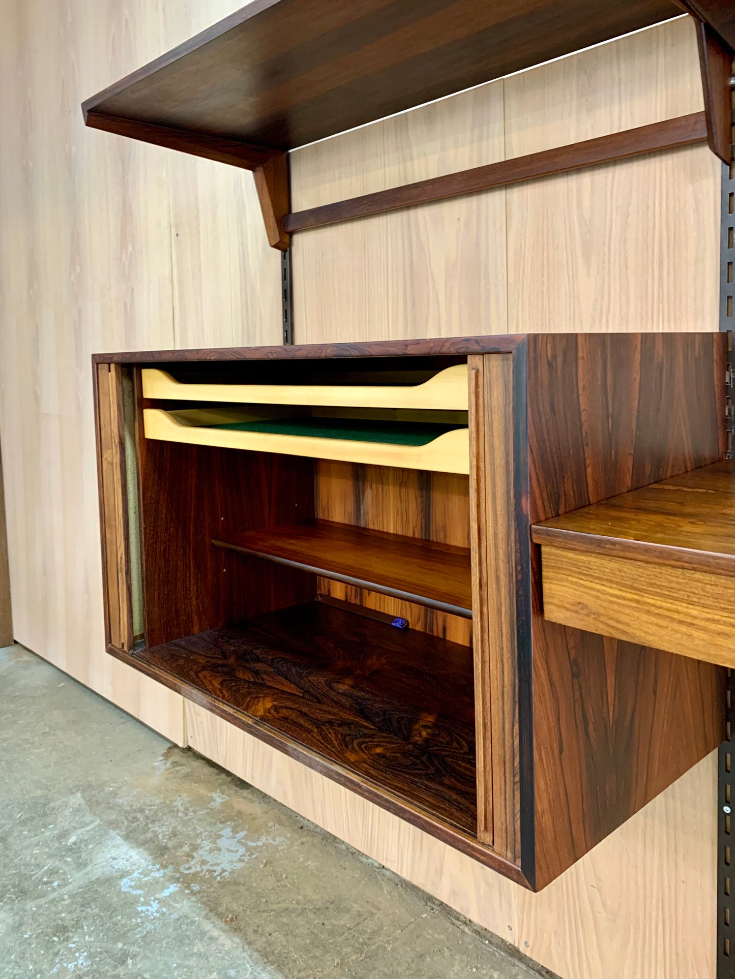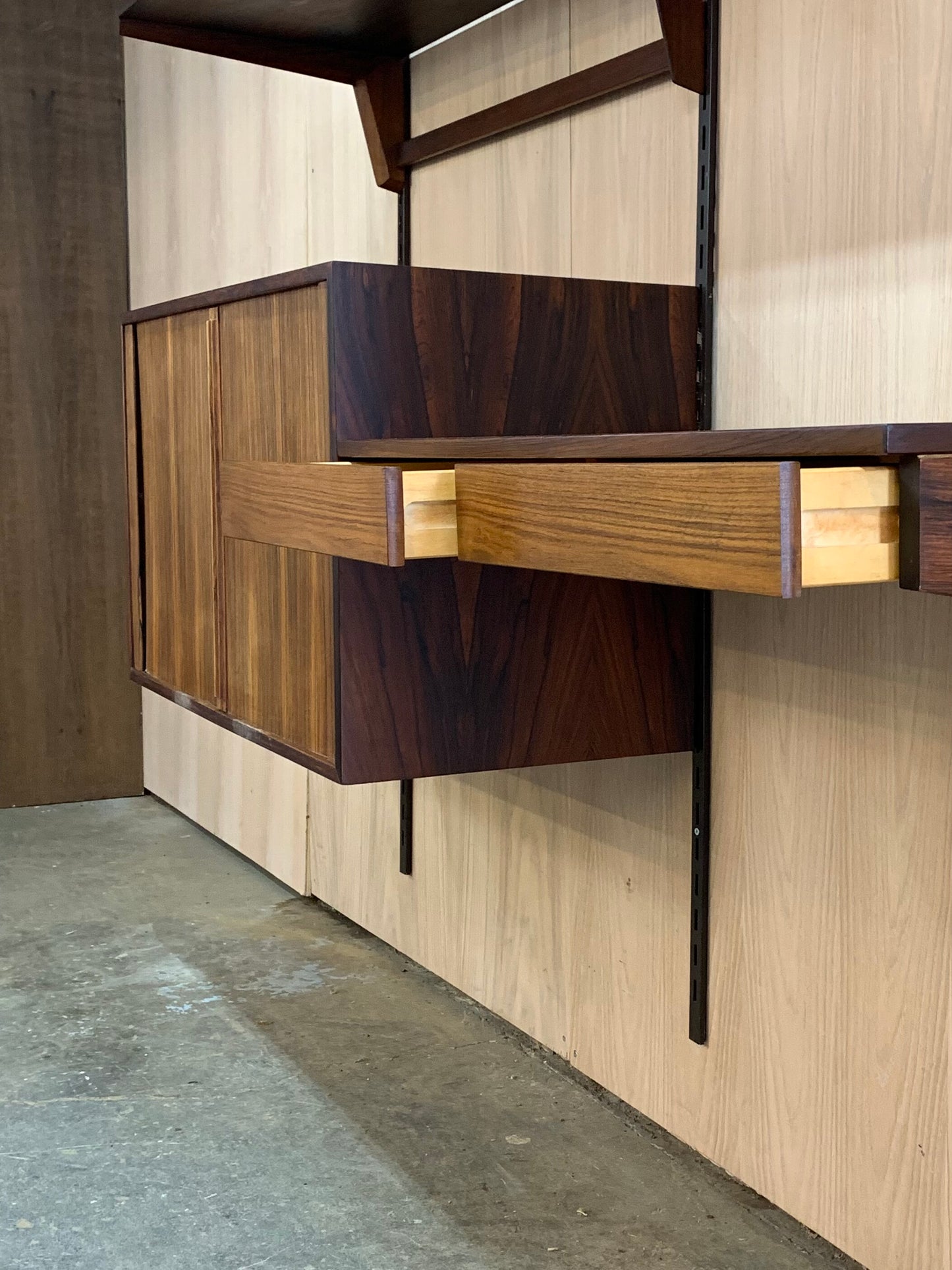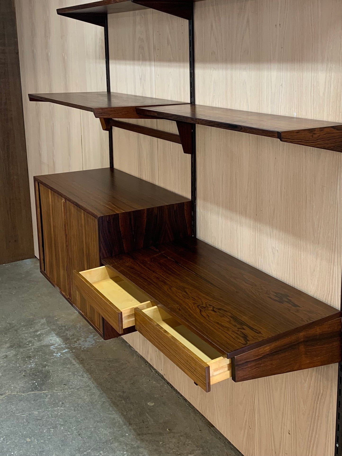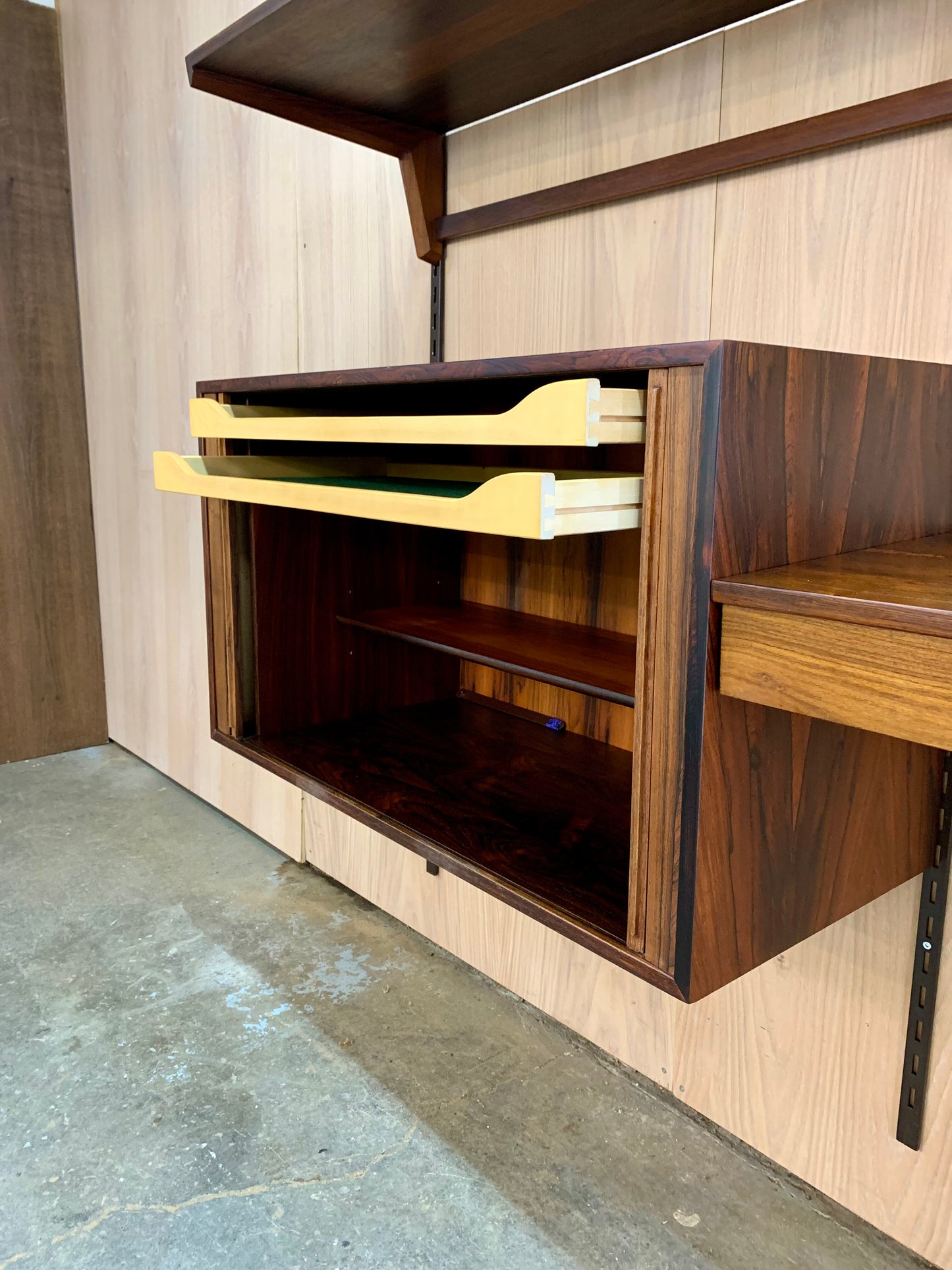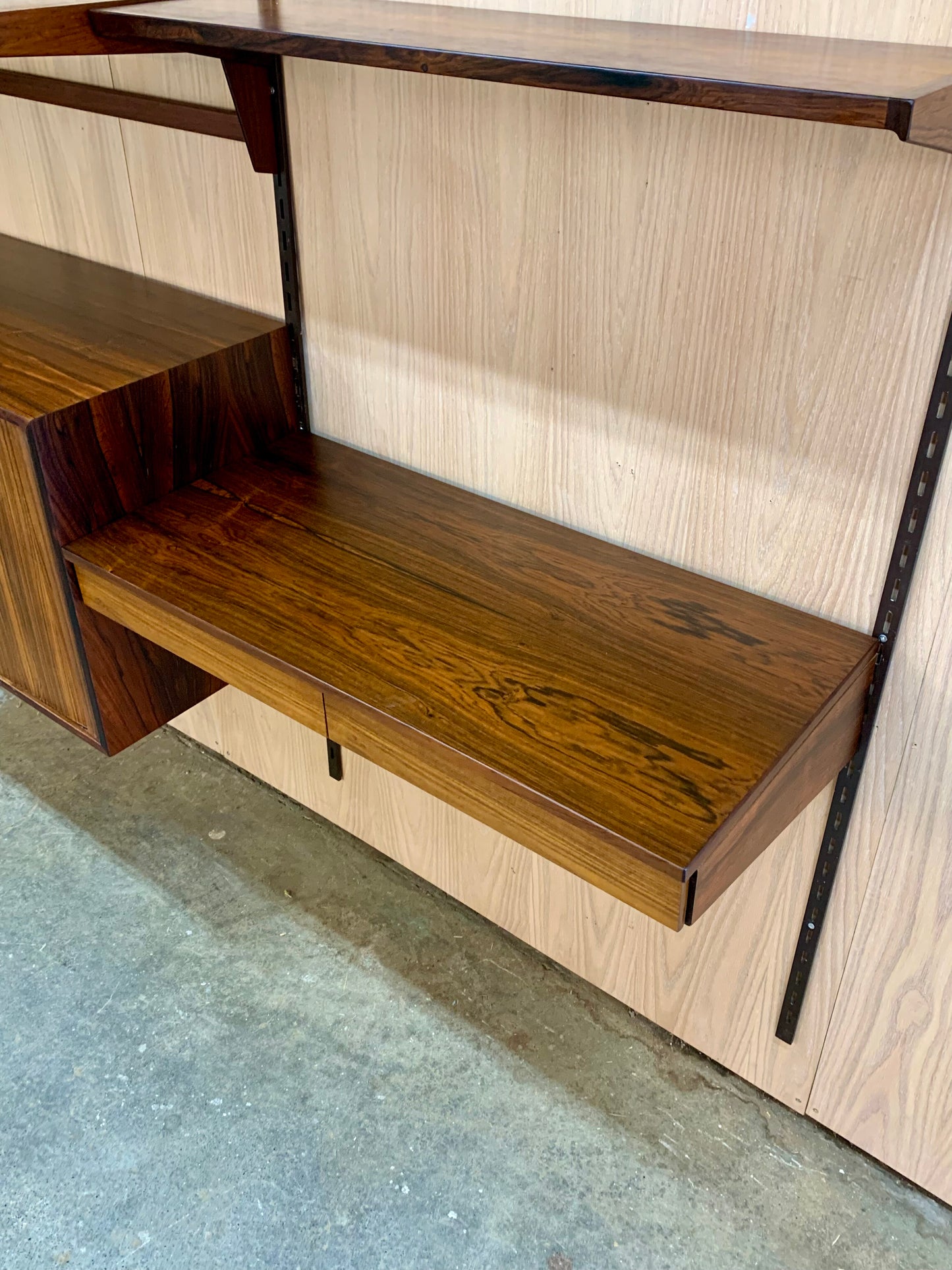 A stunning example of mid-century Danish design, this 1960s wall system by Kai Kristiansen for Feldballes Møbelfabrik is crafted from exceptionally rare Brazilian rosewood, known for its rich grain and deep, luxurious tone.