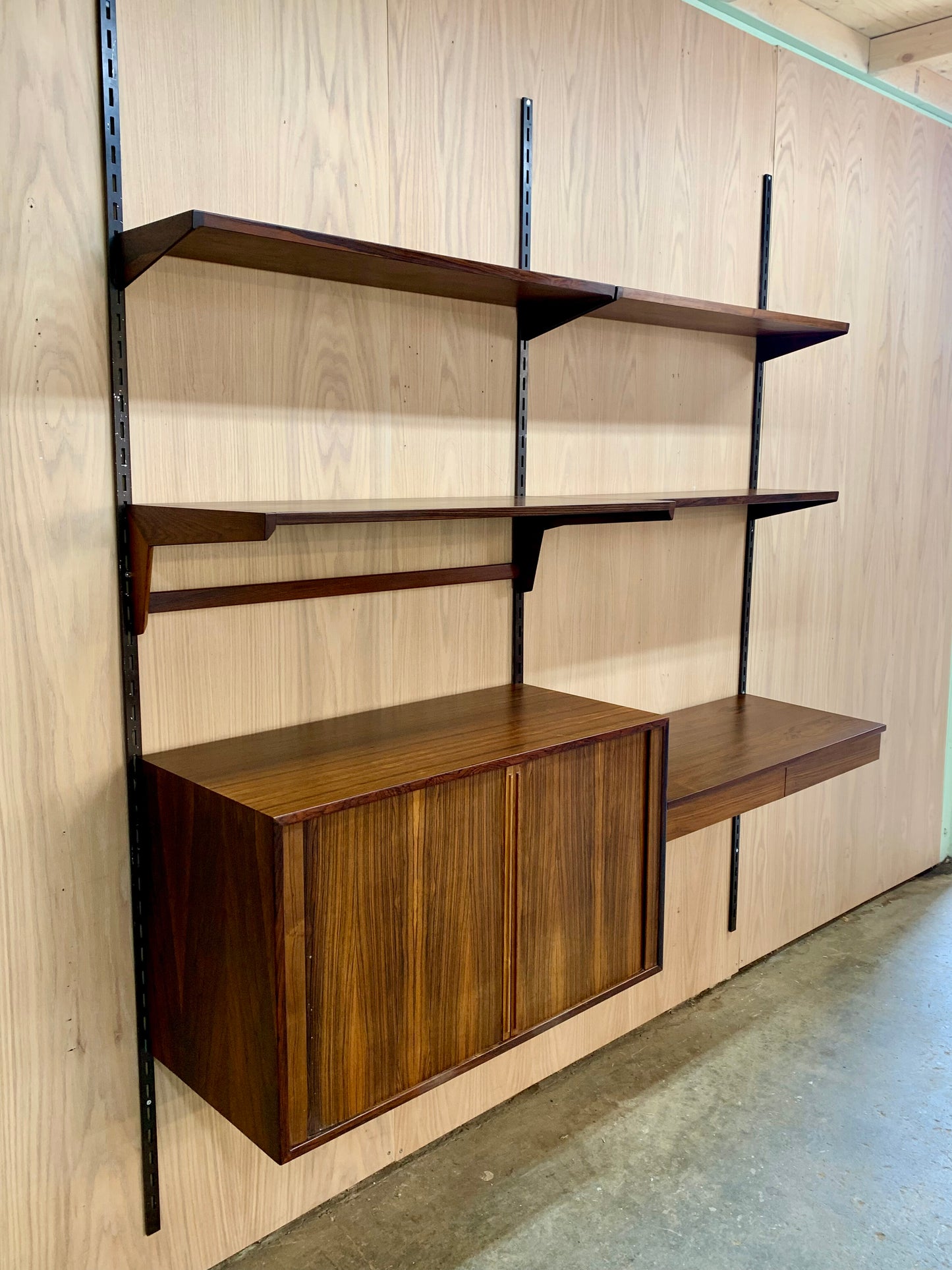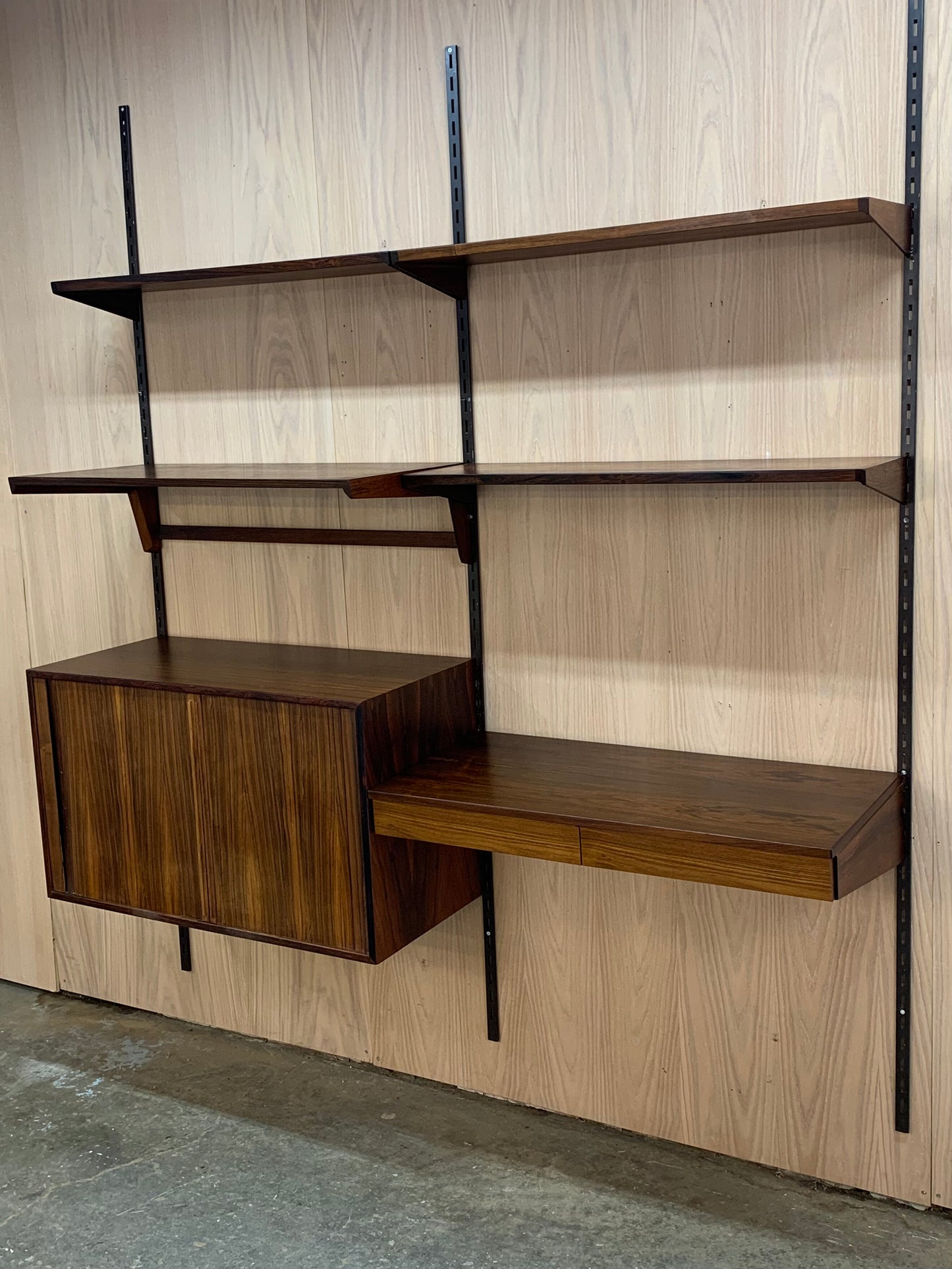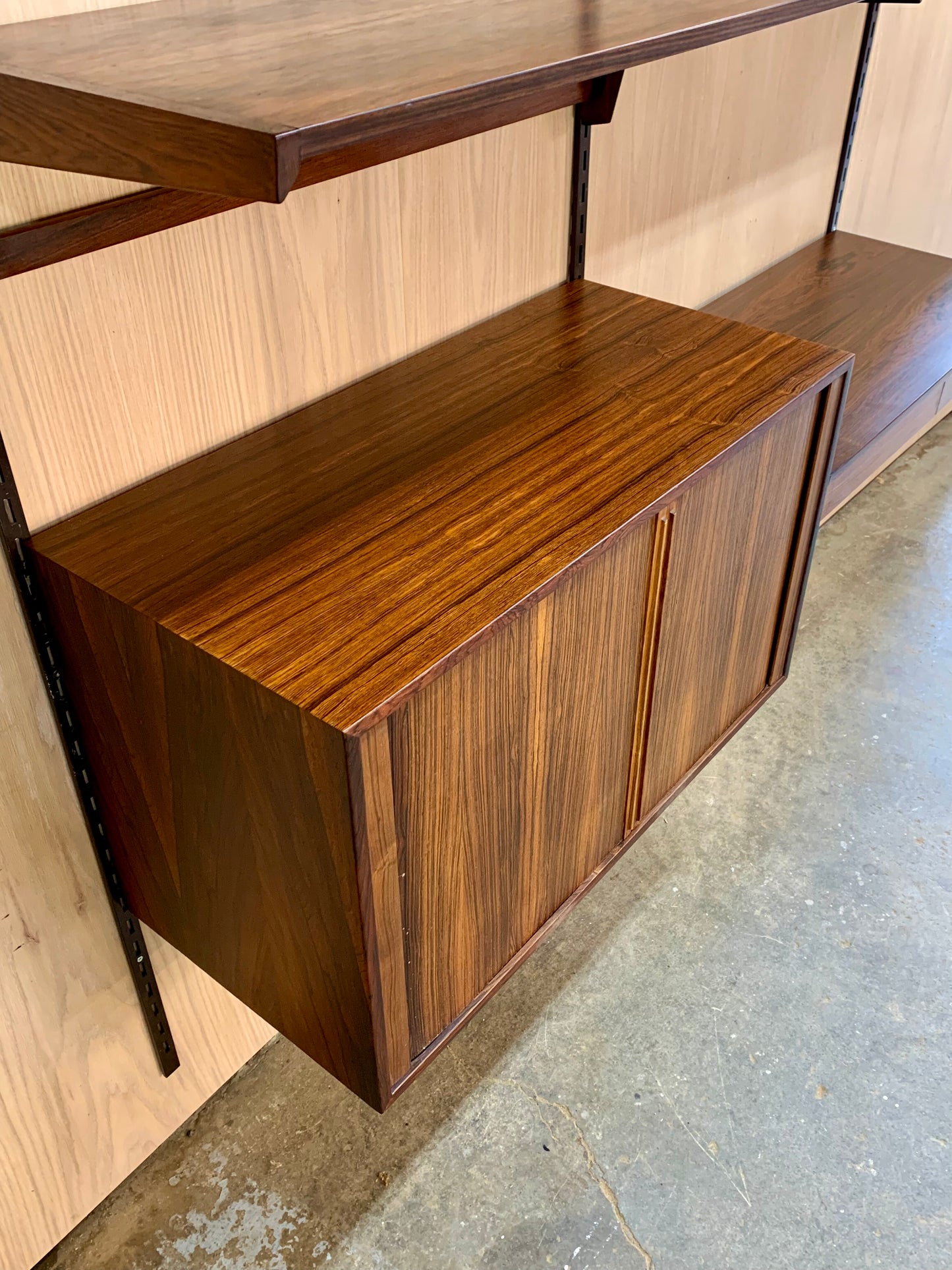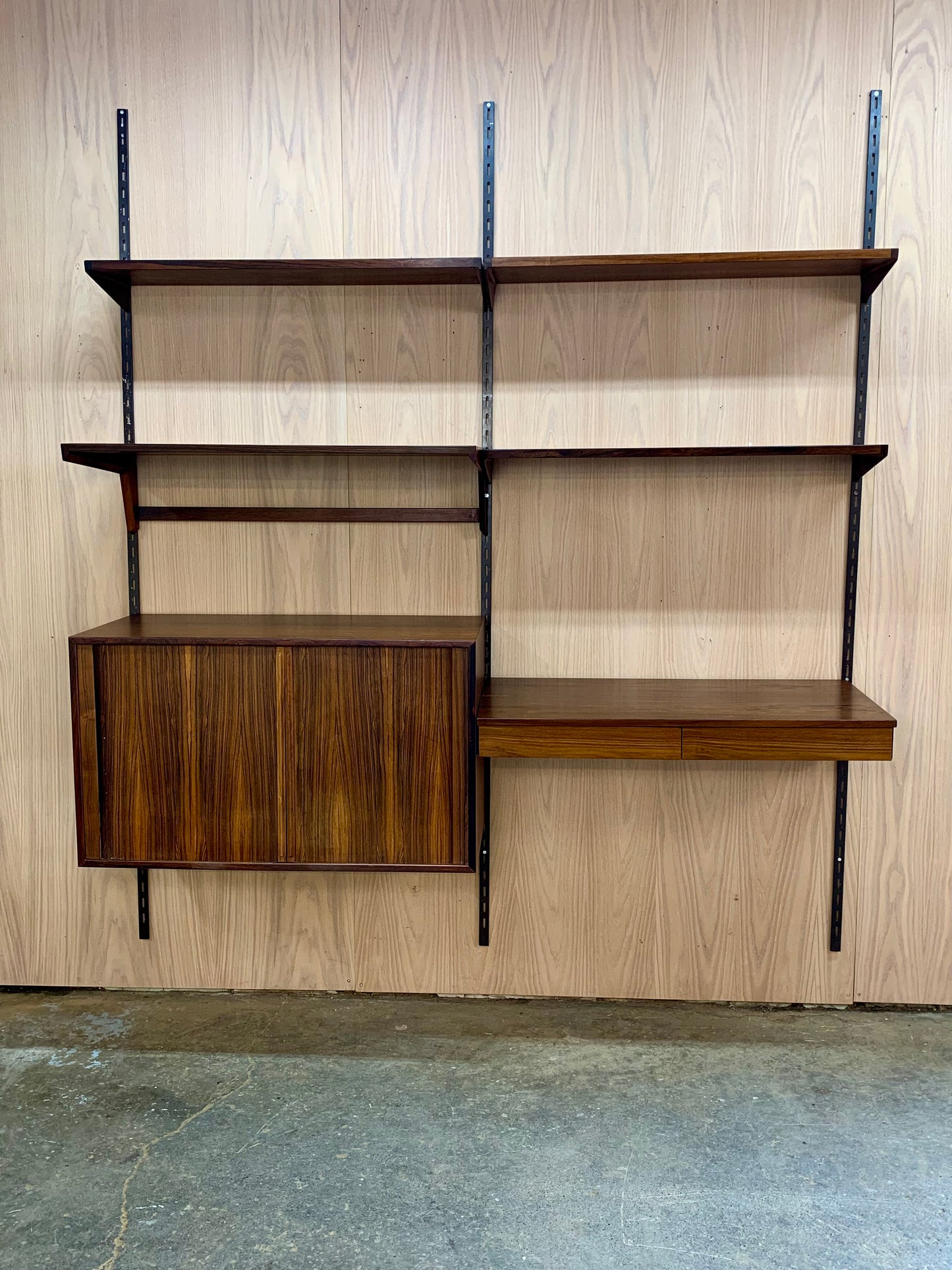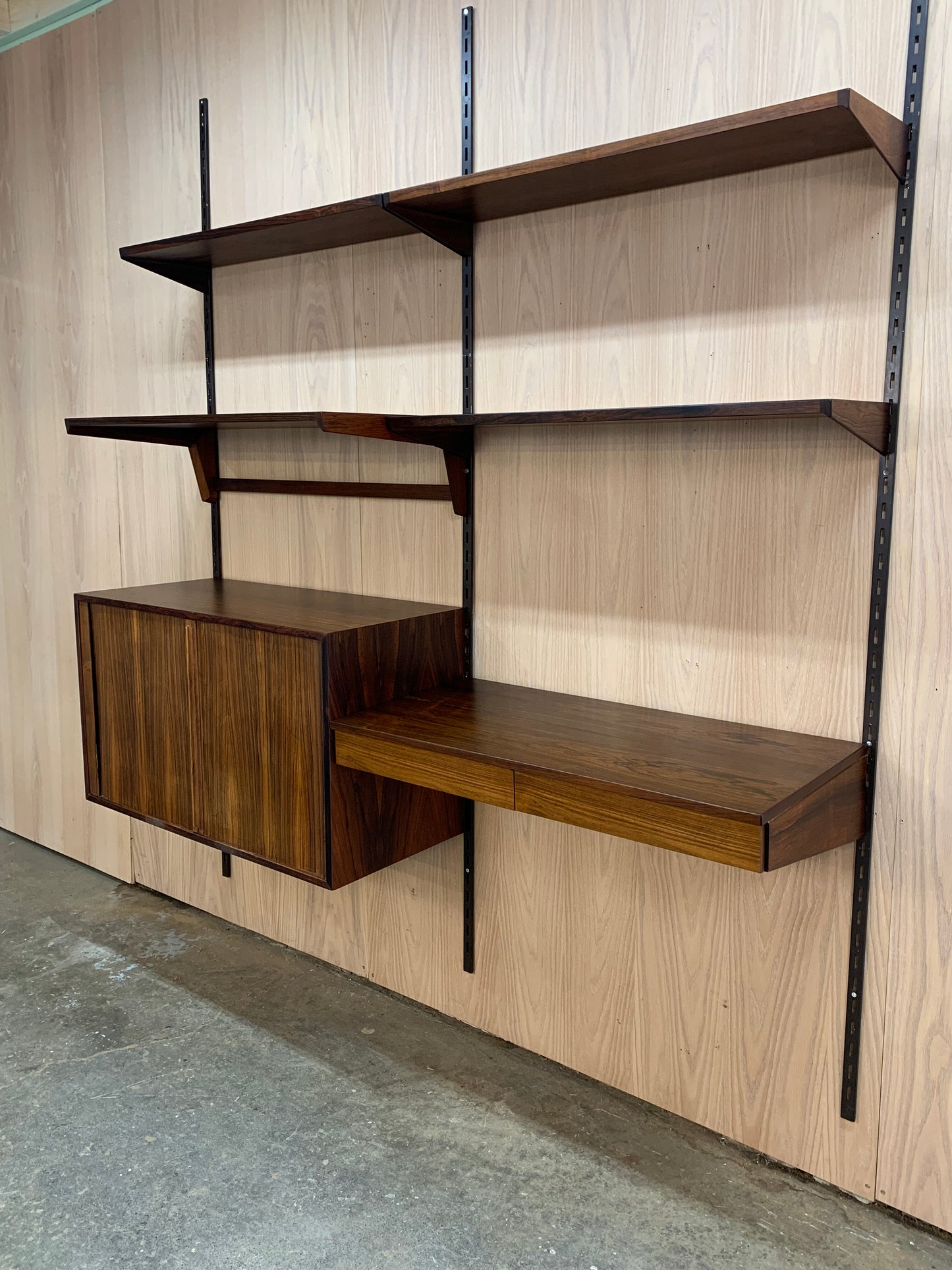A stunning example of mid-century Danish design, this 1960s wall system by Kai Kristiansen for Feldballes Møbelfabrik is crafted from exceptionally rare Brazilian rosewood, known for its rich grain and deep, luxurious tone.