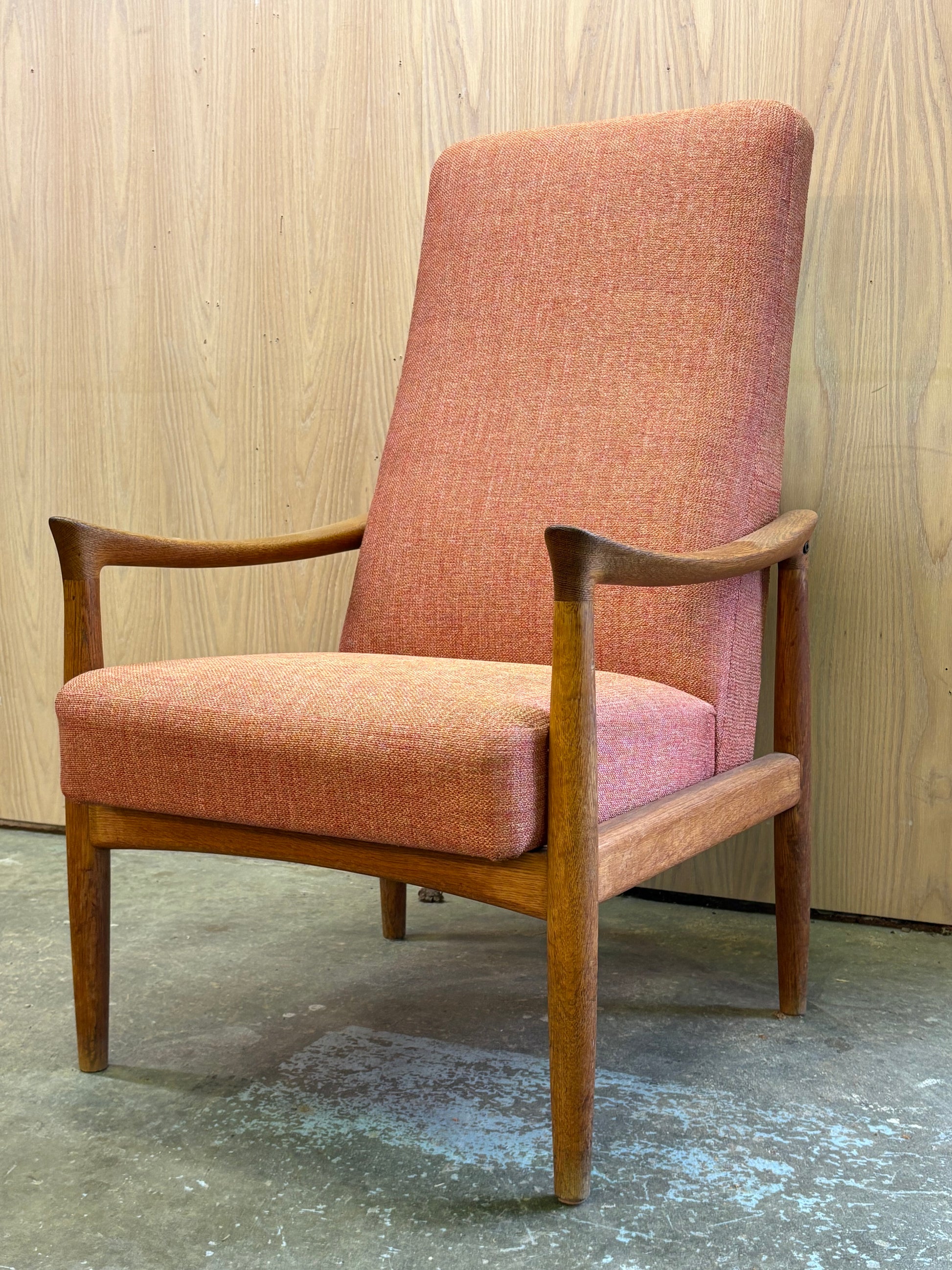 A beautifully crafted Danish high-back lounge chair by Fritz Hansen, made in solid oak with the clean, sculpted lines that define the period. Recently reupholstered in a warm textured fabric, it also includes a custom-made matching footrest that tucks neatly beneath the chair when not in use.