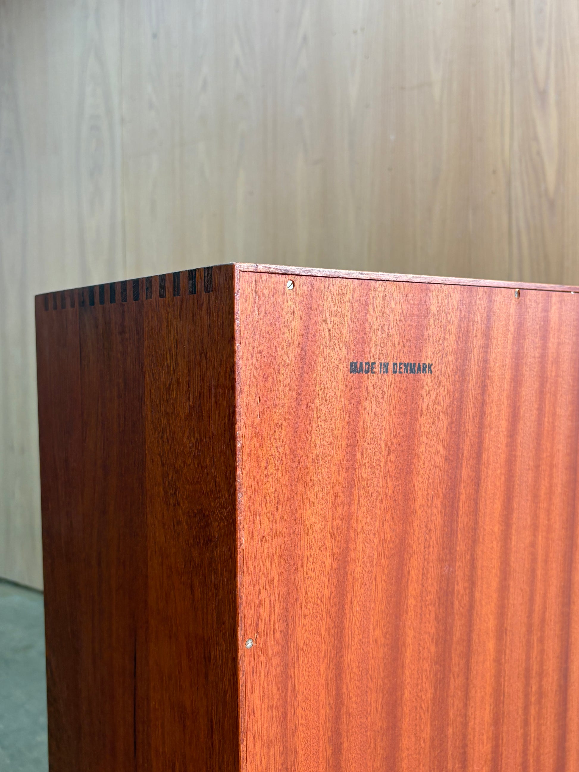 The details speak volumes: exposed finger joints at the corners, beautifully grained teak panels, and round, tapering legs that lift the case with a sense of lightness. Recently restored and glowing with a warm, even patina, it is as functional as it is sculptural. A true collector’s piece, it embodies the uncompromising quality and timeless elegance that have made Hvidt and Søborg Møbelfabrik enduring names in mid-century design.