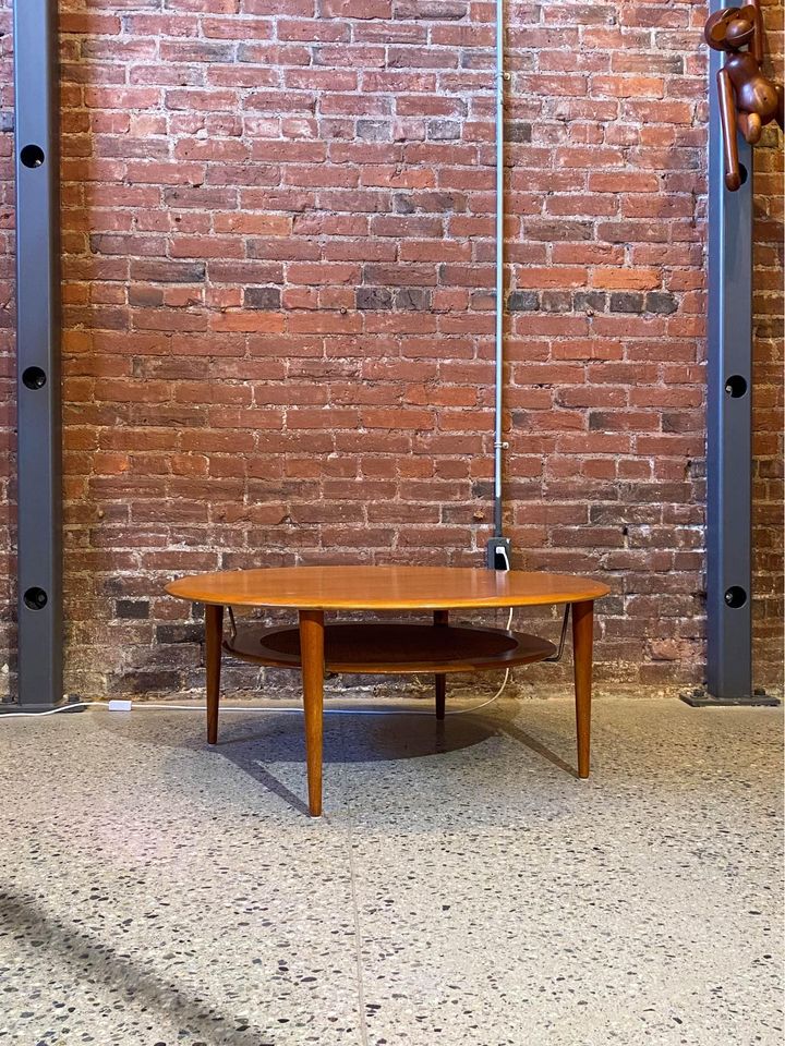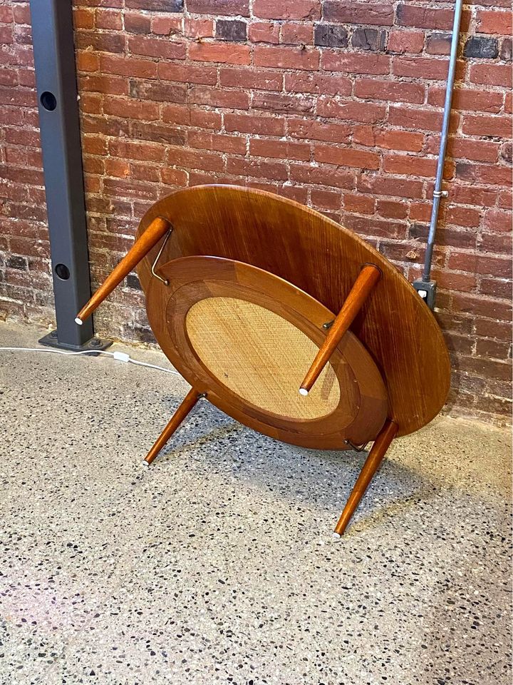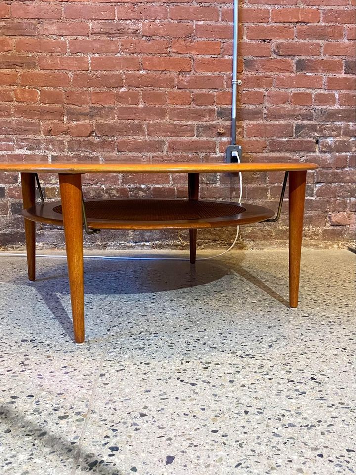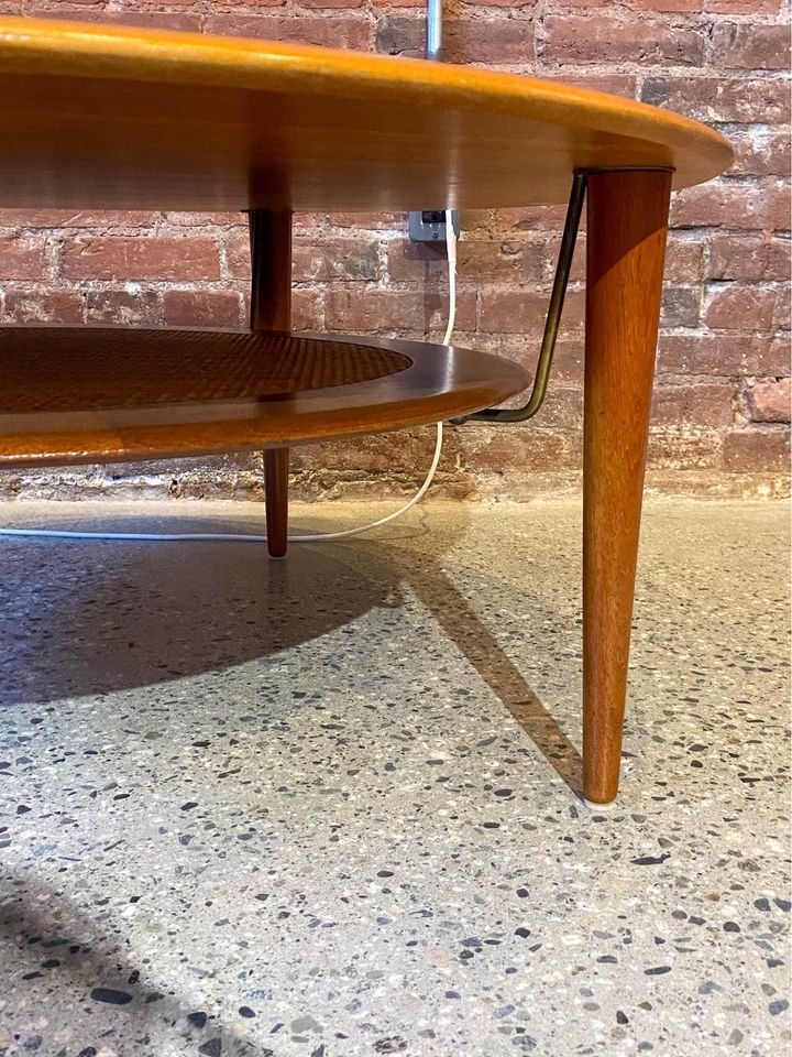We are delighted to unveil this captivating coffee table, a creation by the renowned designer Peter Hvidt for France & Son, dating back to the 1960s. The surface of this masterpiece is elegantly fashioned from stunning old-growth solid teak, exuding timeless beauty. Adding to its allure, the lower tier boasts a skillfully woven pleated rattan center, ingeniously adorned with brass hardware that lends an enchanting illusion of the lower tier "floating" effortlessly. Meticulously preserved, the overall condition of this coffee table is truly excellent, showcasing its enduring charm and appeal.