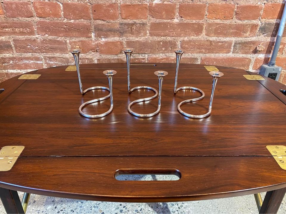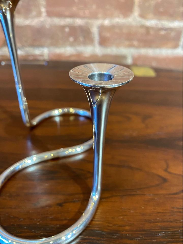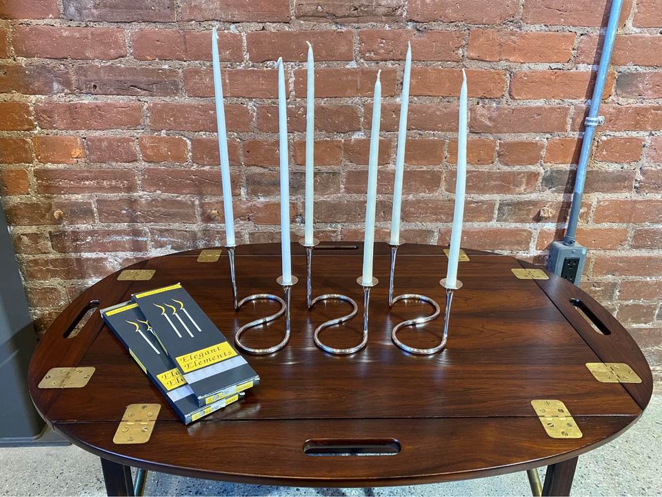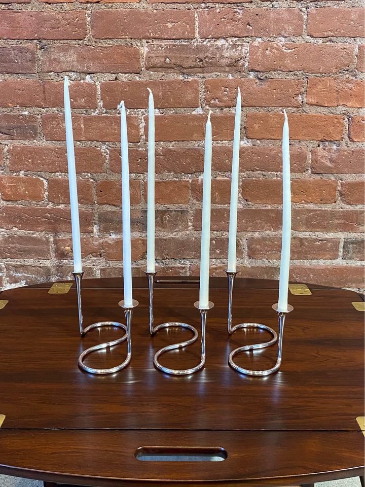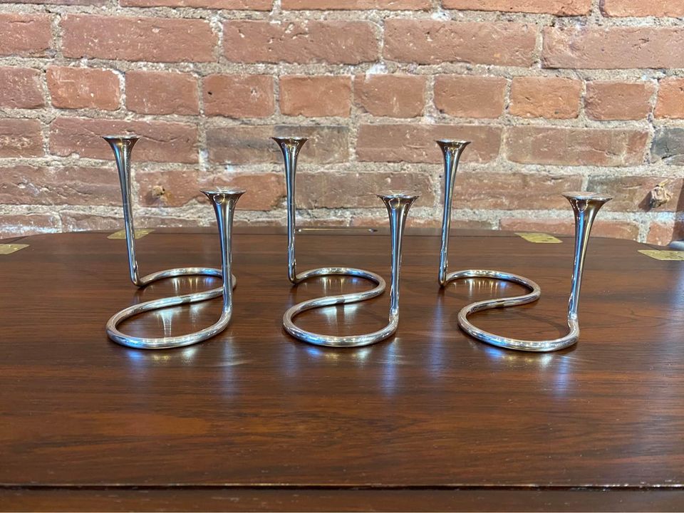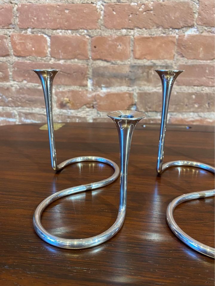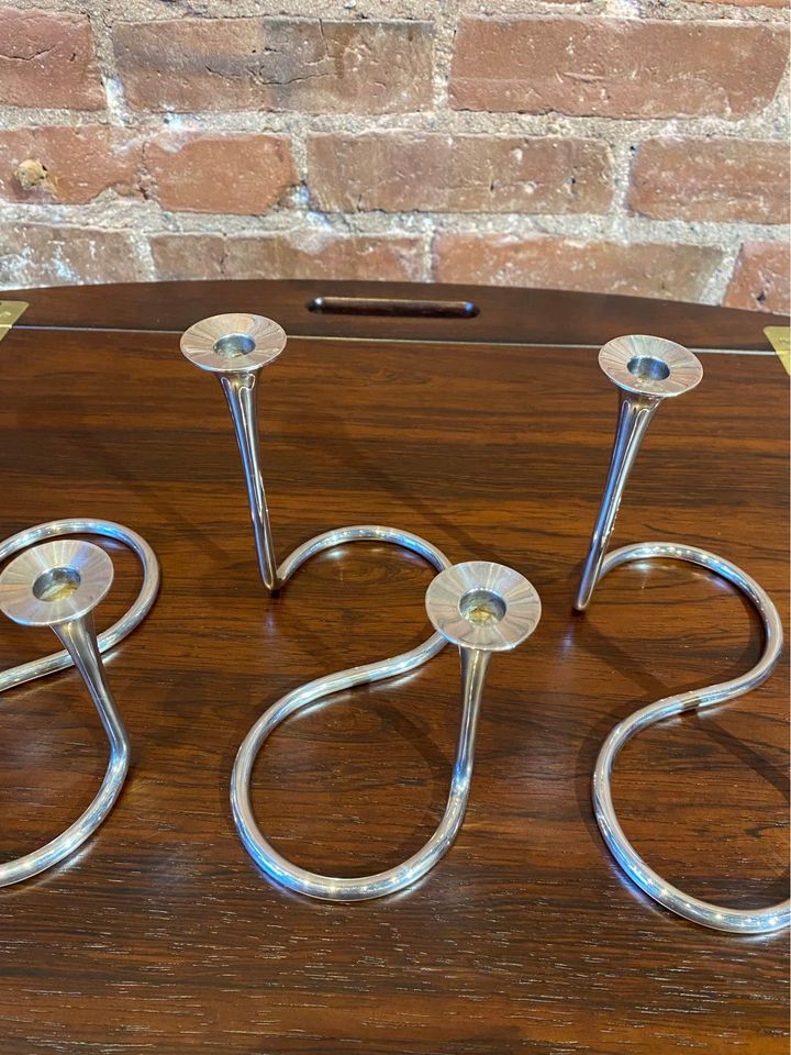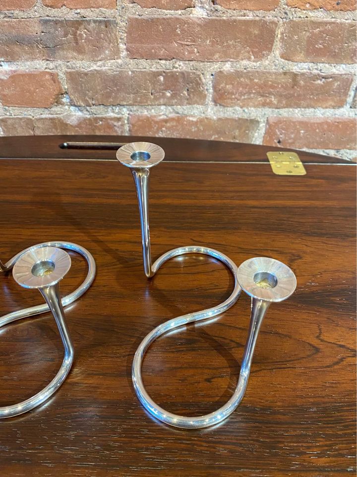 Exquisite 1960s sterling silver candlestick holders designed by Eigil Jensen for Anton Michelsen, Copenhagen. Impressed with all of the associated markings as well as the designer’s initials. Excellent original condition includes a complete set of candles.