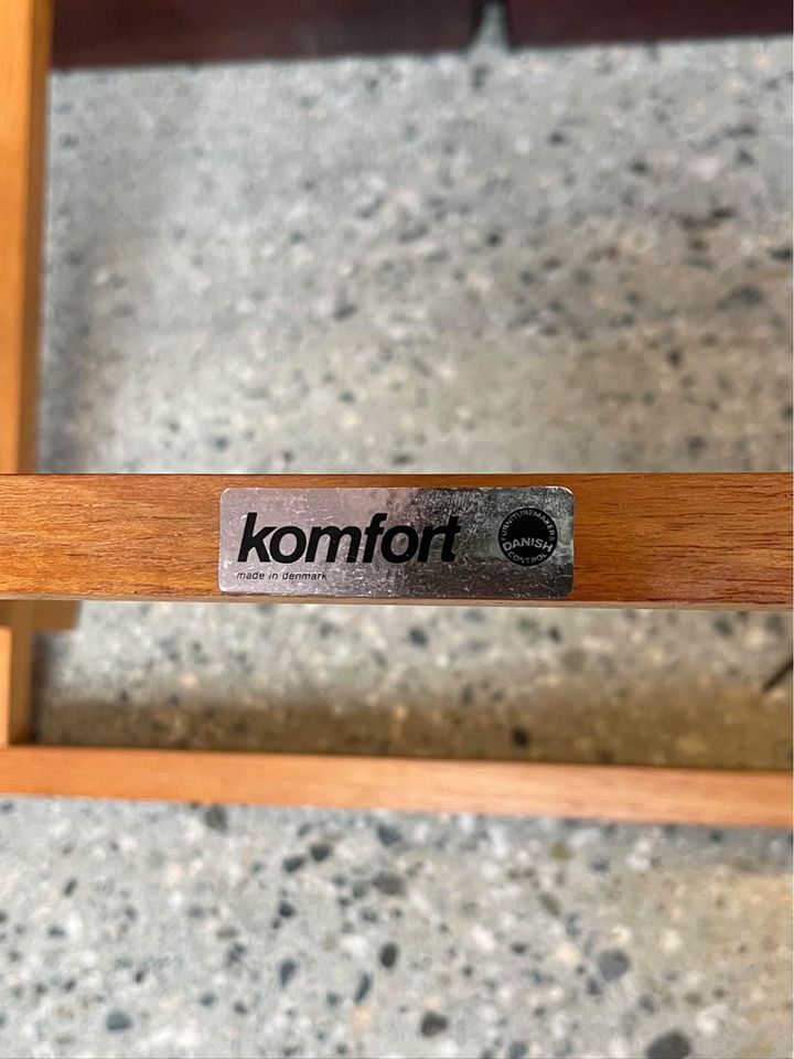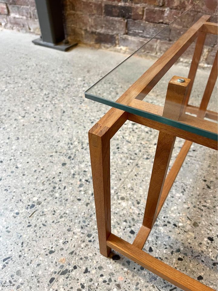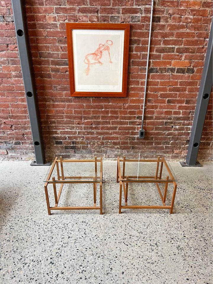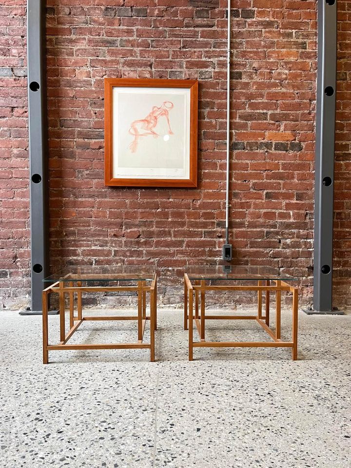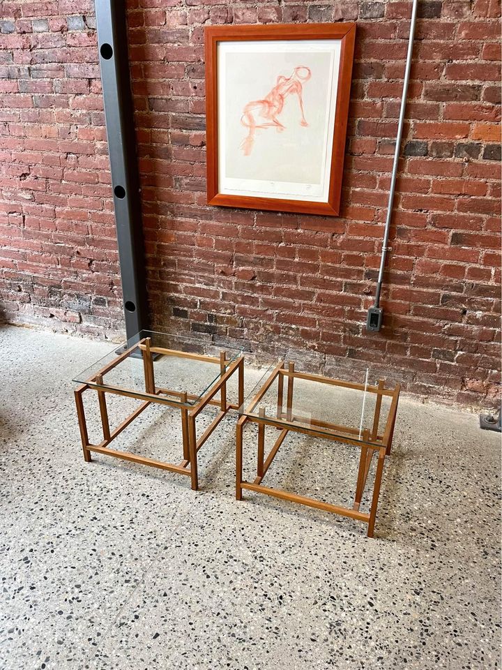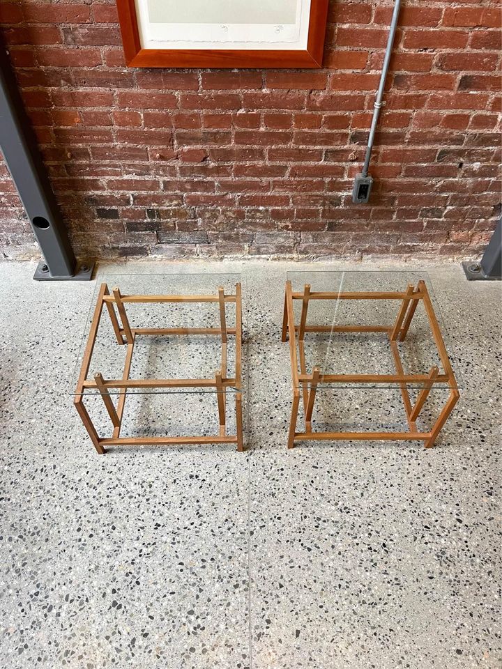Introducing a sleekly architectural pair of Scandinavian Modern Danish side tables crafted in solid teak with a glass top by Henning Norgaard for Komfort. The minimalist geometric teak base showcases exceptional craftsmanship, featuring both mortise-and-tenon and finger joinery. Aside from the original glass exhibiting a chip on one of the tables, the bases are in excellent original condition.