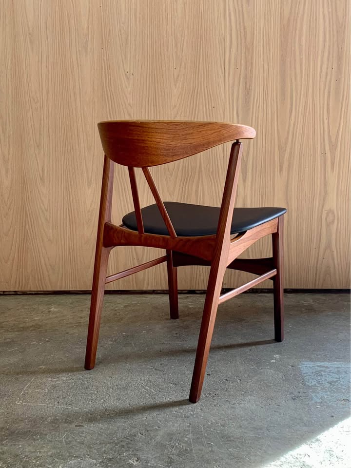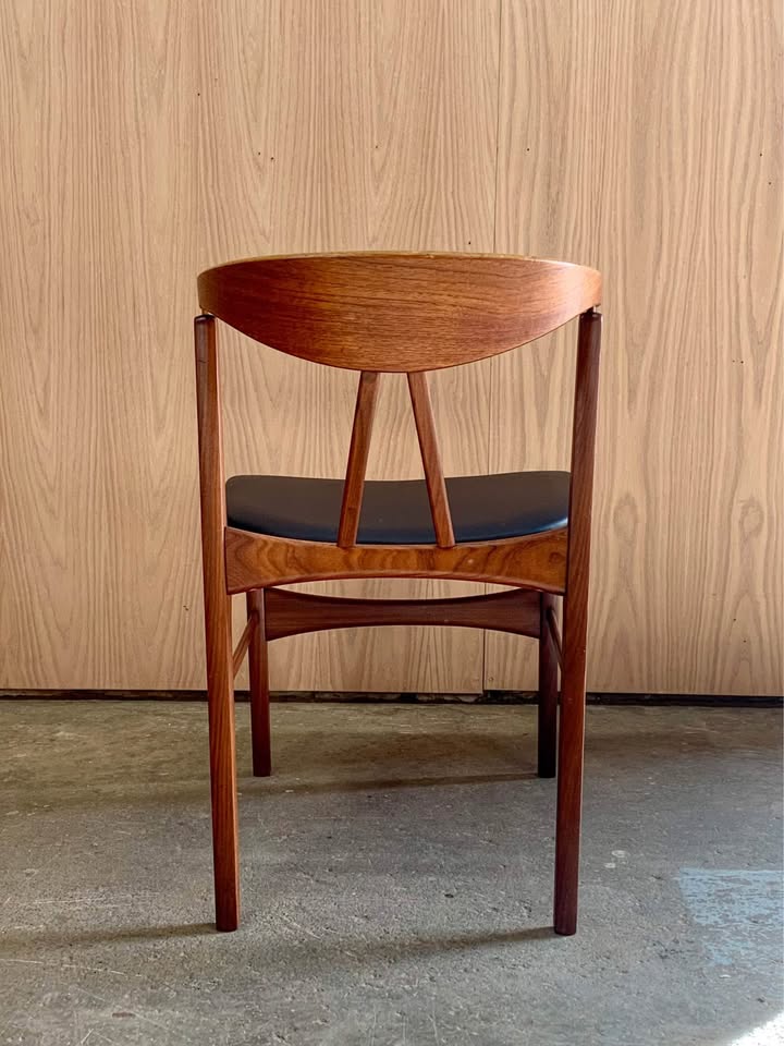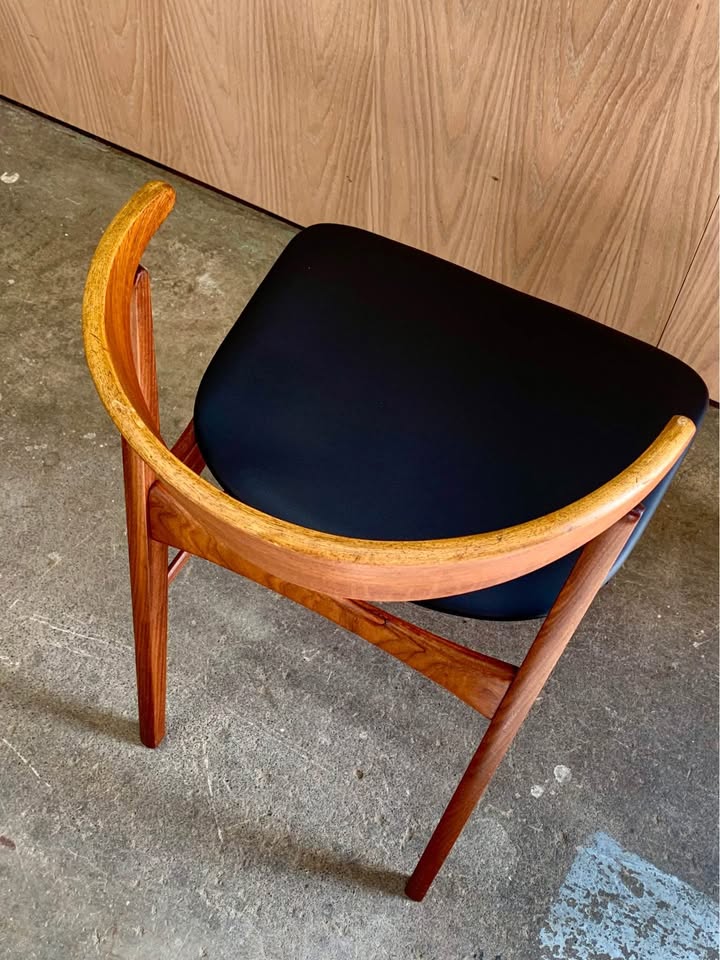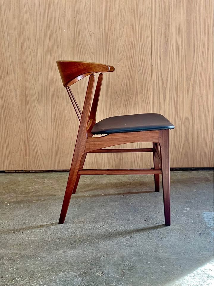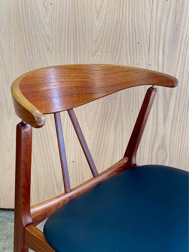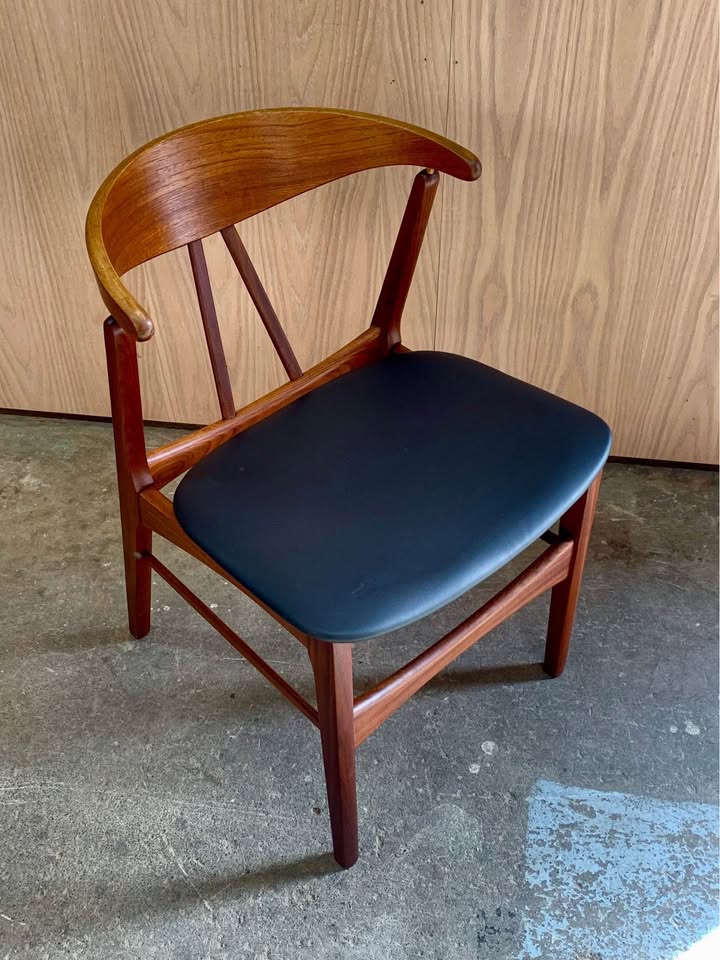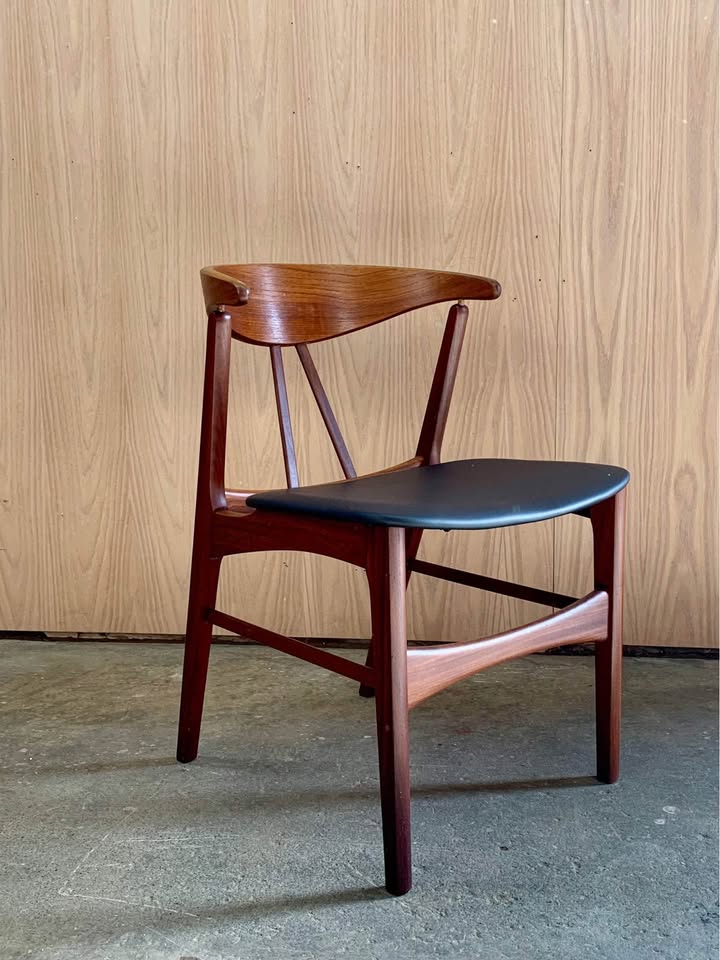 Fresh from restoration, we’re excited to offer this stunning teak dining chair, crafted in Denmark during the 1960s. Designed with a gracefully curved backrest that doubles as a comfortable armrest, this chair perfectly balance form and function. Expertly restored and reupholstered in premium leather, it’s in outstanding condition and ready to shine in any dining space.