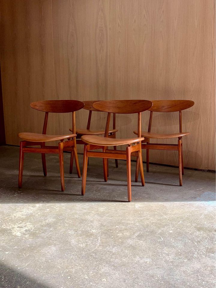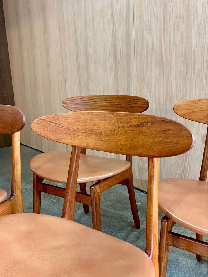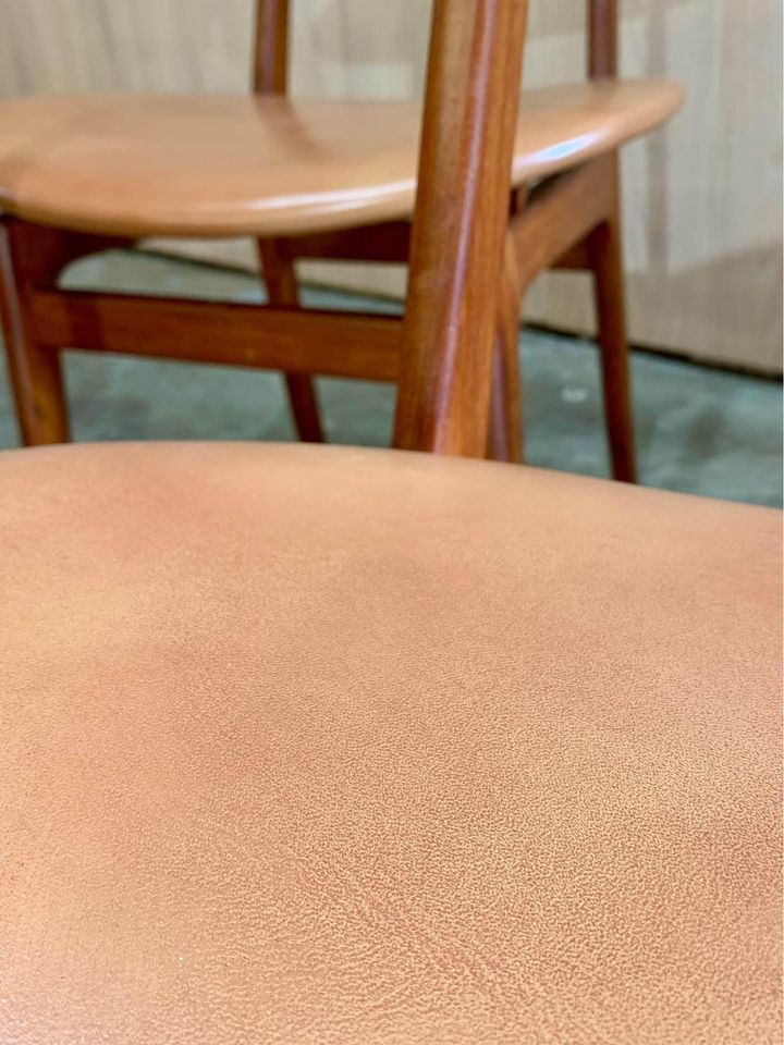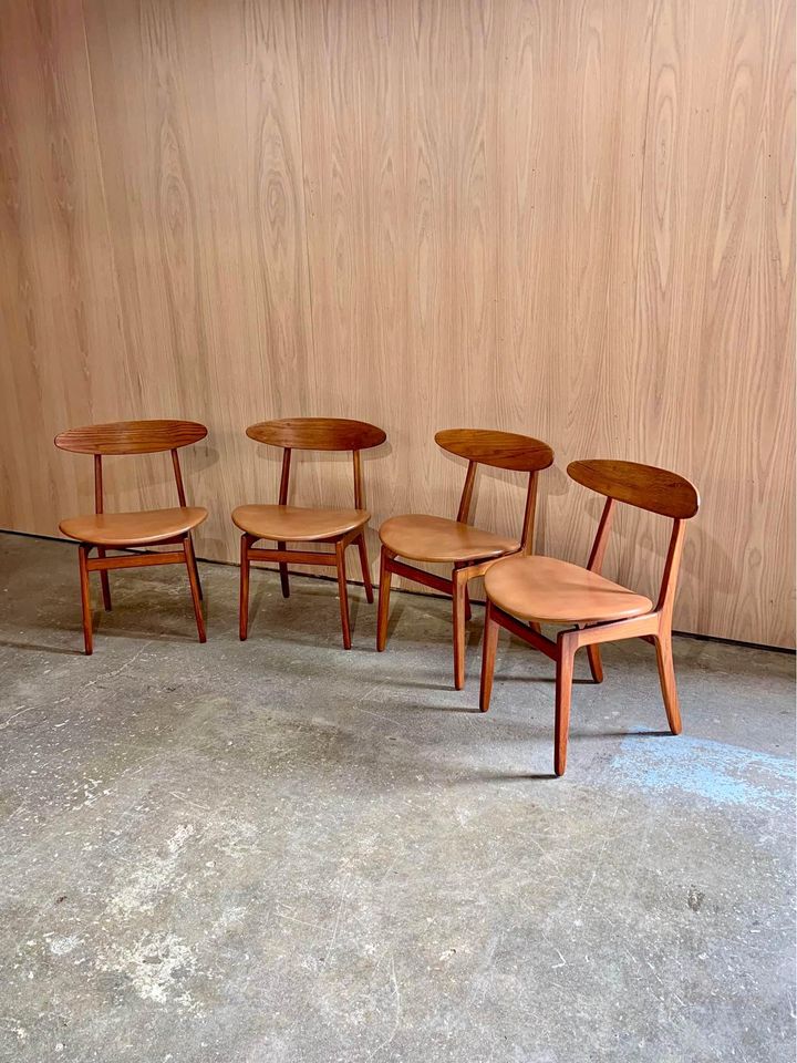 Newly restored and ready for your home, we are pleased to offer this set of four Danish teak dining chairs from the 1960s. Designed by Wilhelm Wohlert for Søborg Møbelfabrik, these chairs showcase exceptional craftsmanship with high-quality joinery and a distinctive floating seat design. Expertly restored by our team, the chairs are upholstered in premium leather and are in superb condition.
