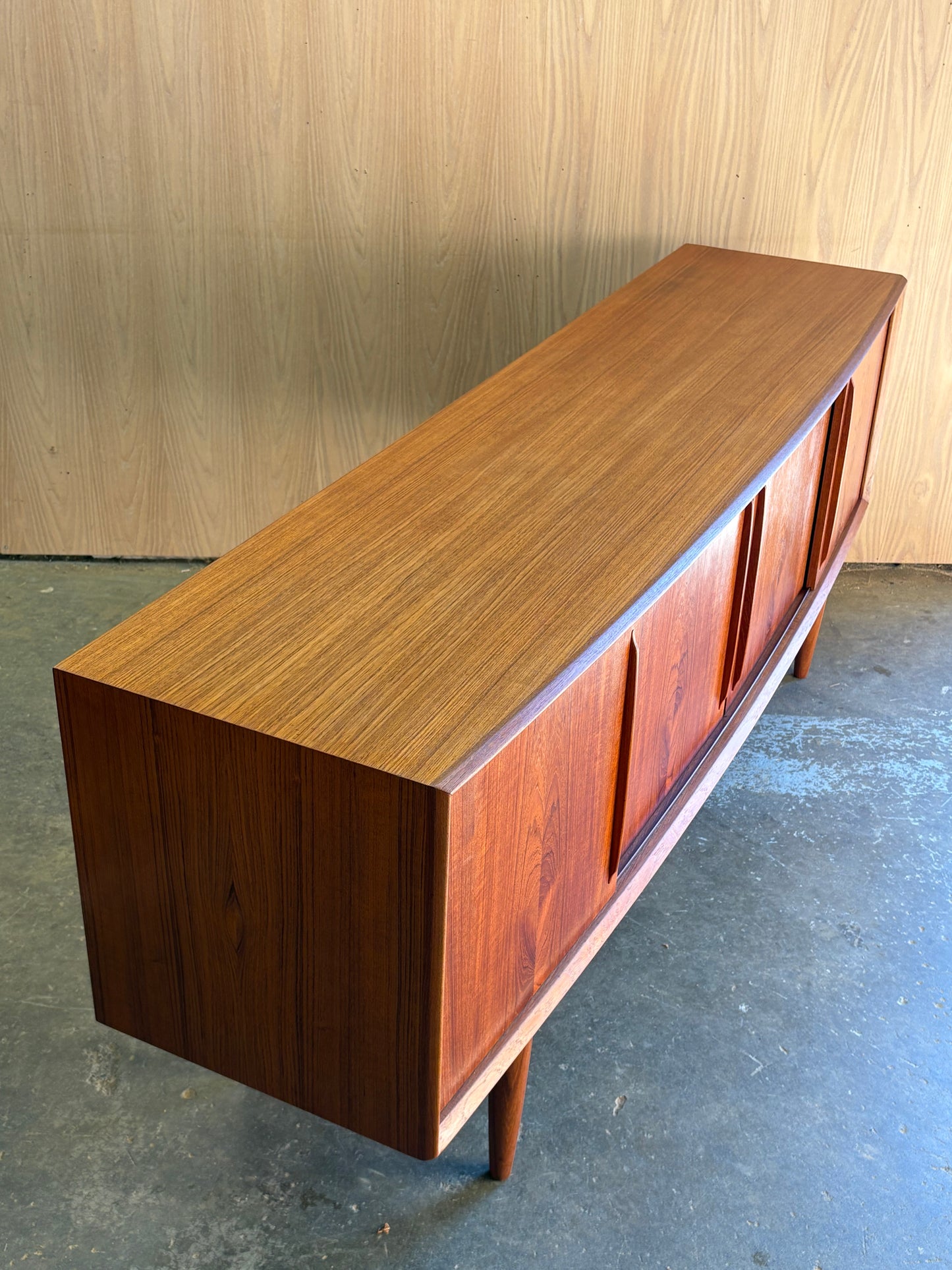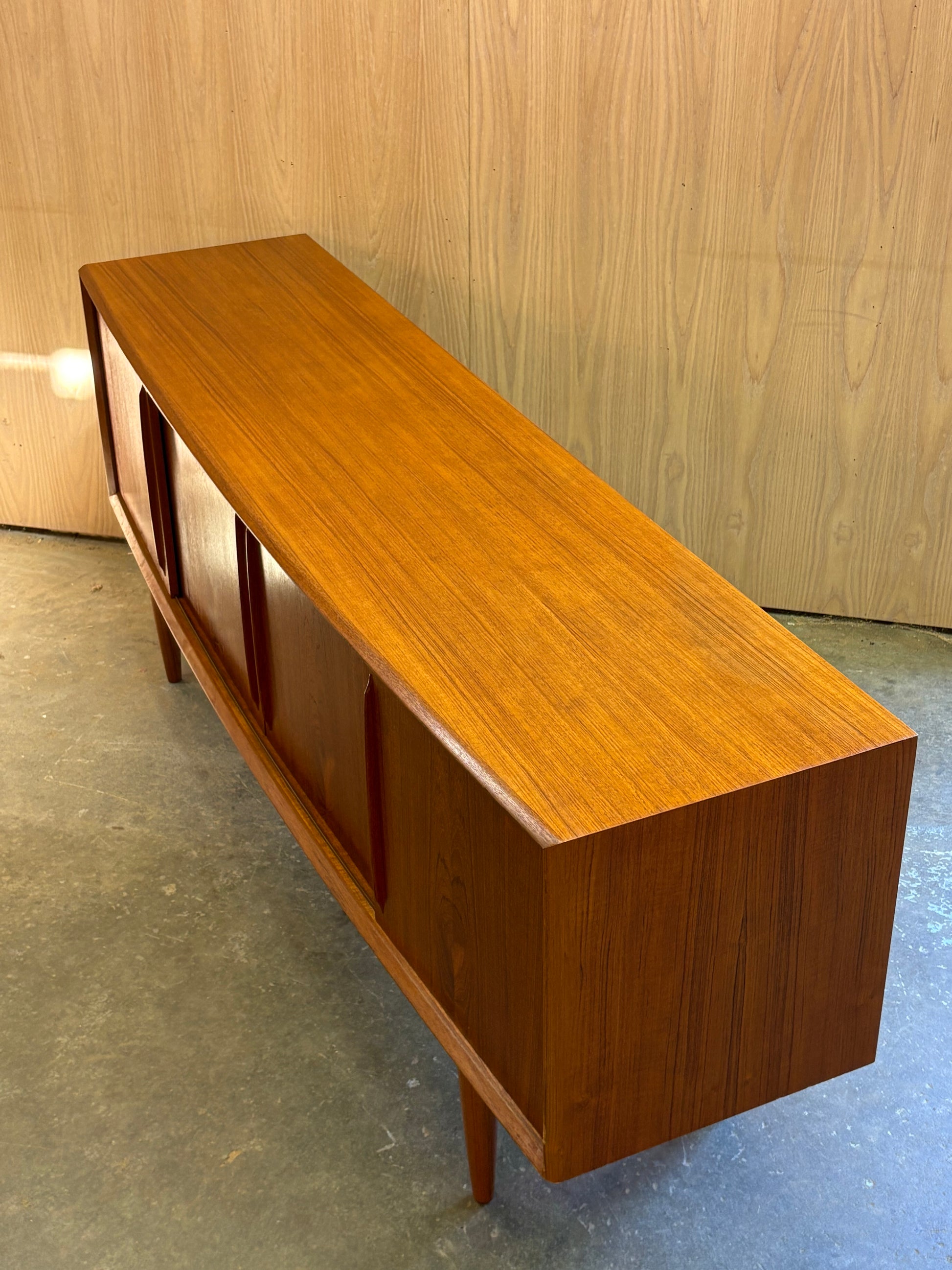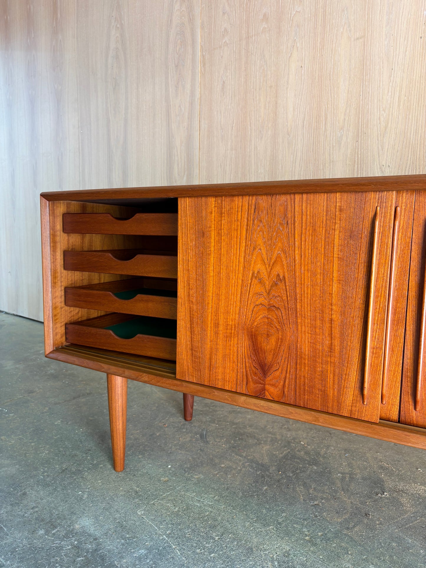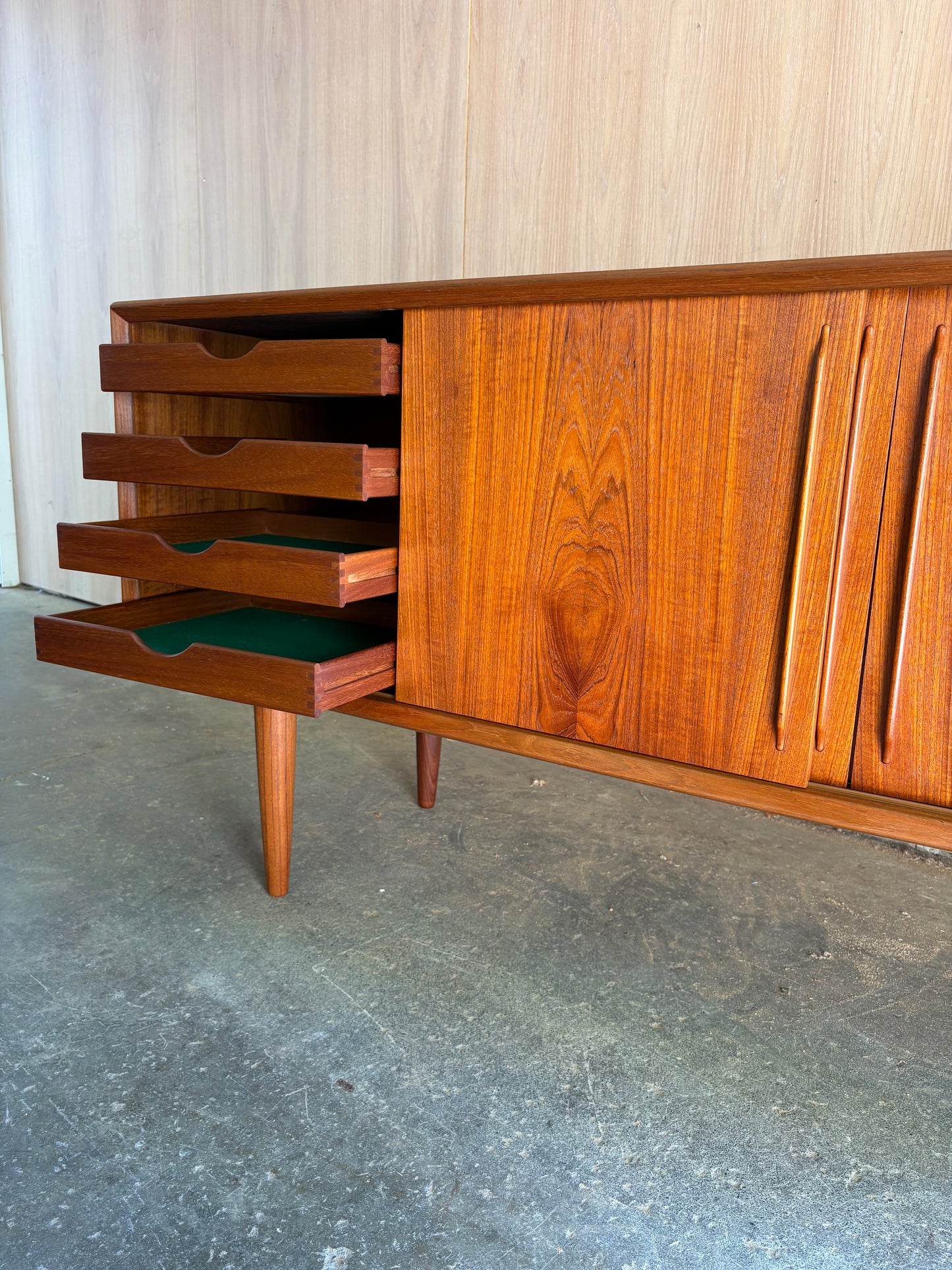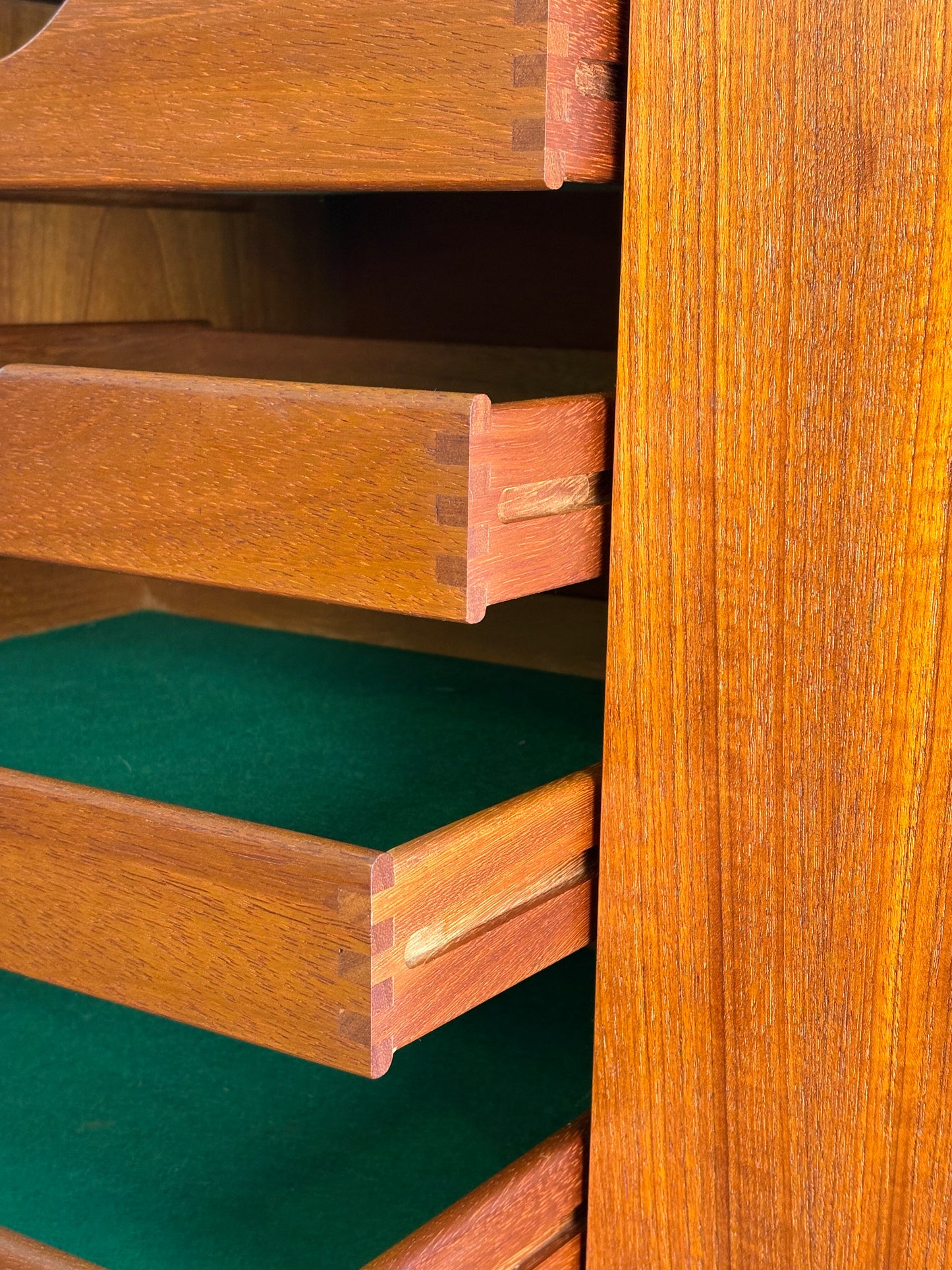 An exceptional 1960s Danish teak credenza by Svend Madsen, showcasing his signature sculptural touch with a subtly curved front edge and beautifully sculpted solid teak handles. Behind its four doors lies a thoughtfully organized interior featuring a large central cabinet with adjustable shelving and a left-side bank of finger-jointed drawers lined in original green felt—ideal for storing cutlery, linens, or valuables with style.