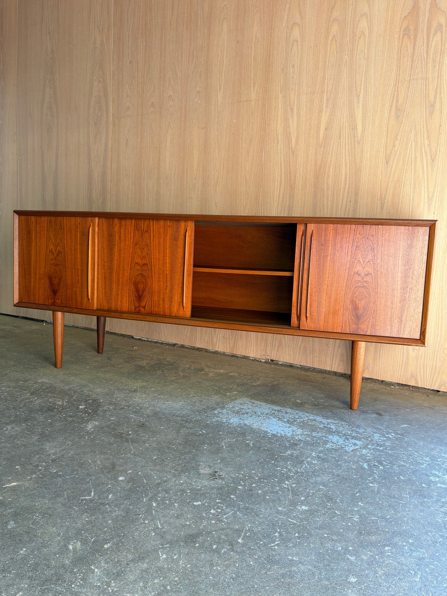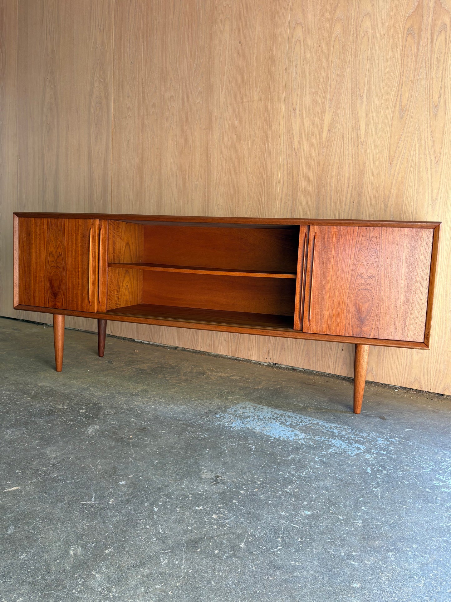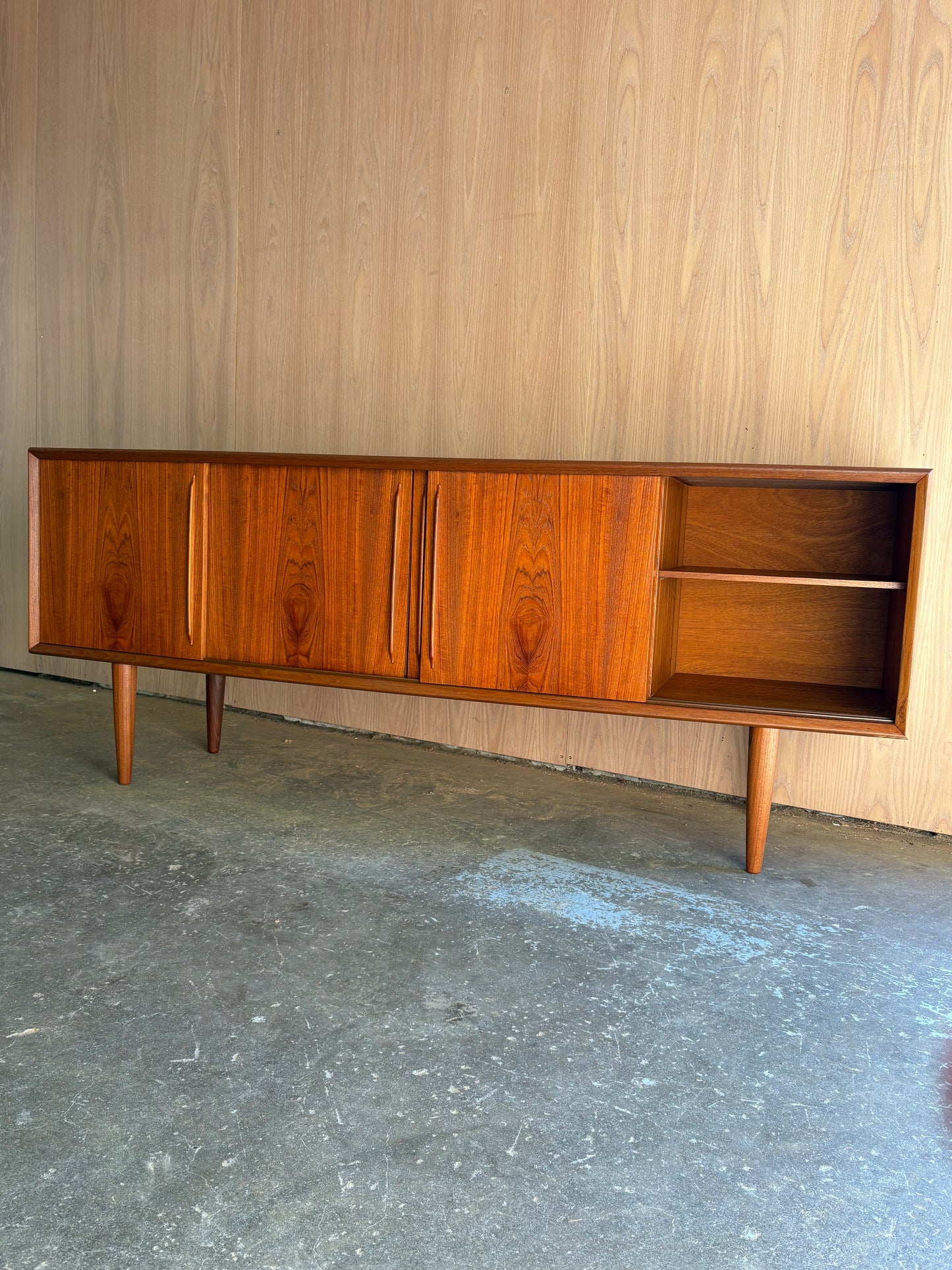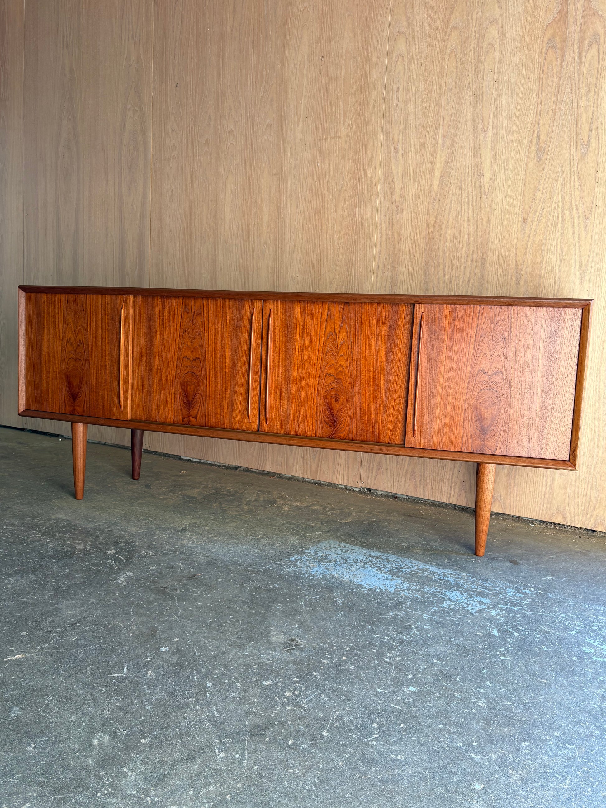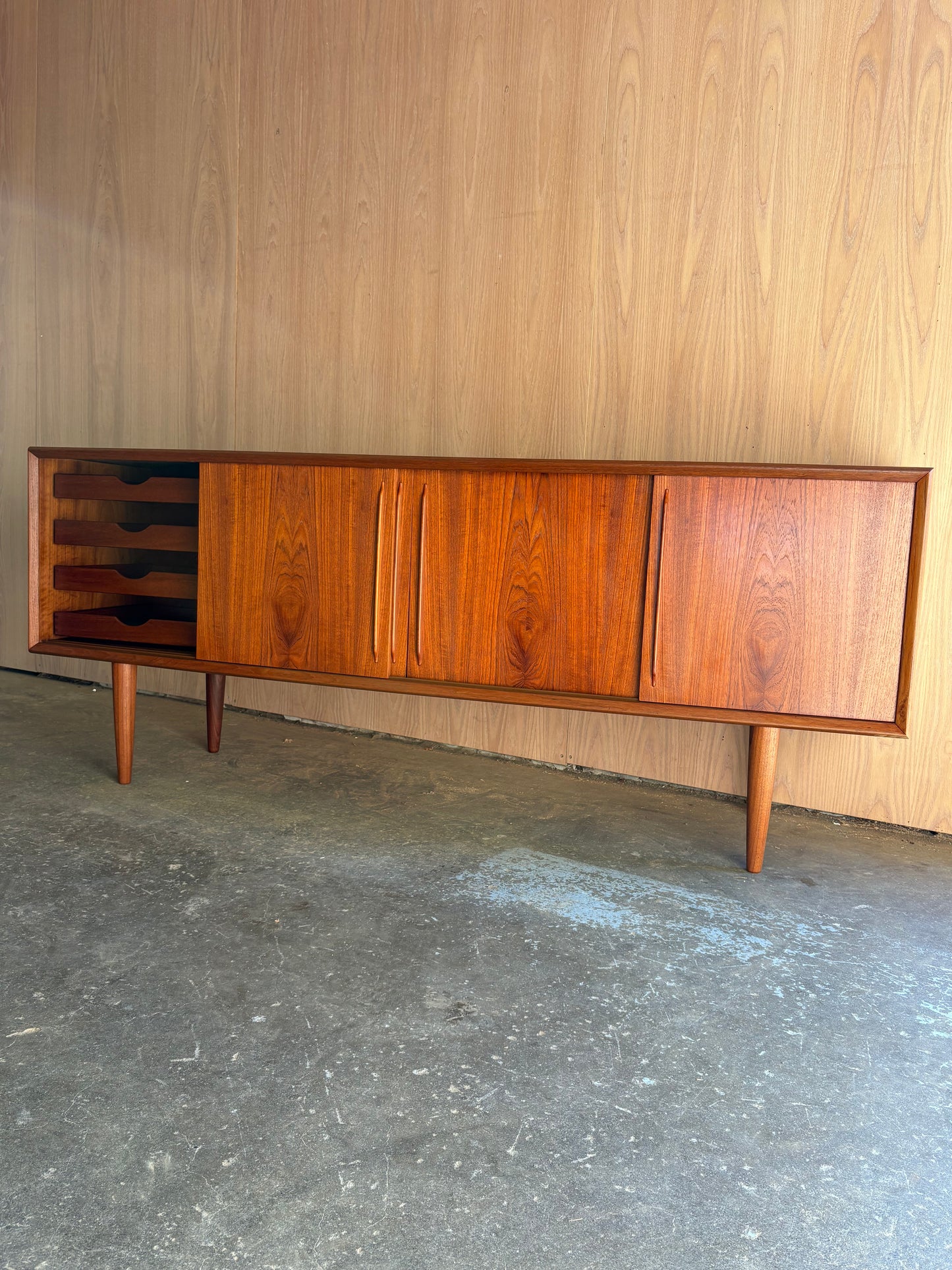 An exceptional 1960s Danish teak credenza by Svend Madsen, showcasing his signature sculptural touch with a subtly curved front edge and beautifully sculpted solid teak handles. Behind its four doors lies a thoughtfully organized interior featuring a large central cabinet with adjustable shelving and a left-side bank of finger-jointed drawers lined in original green felt—ideal for storing cutlery, linens, or valuables with style.