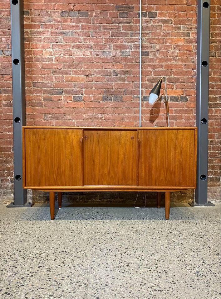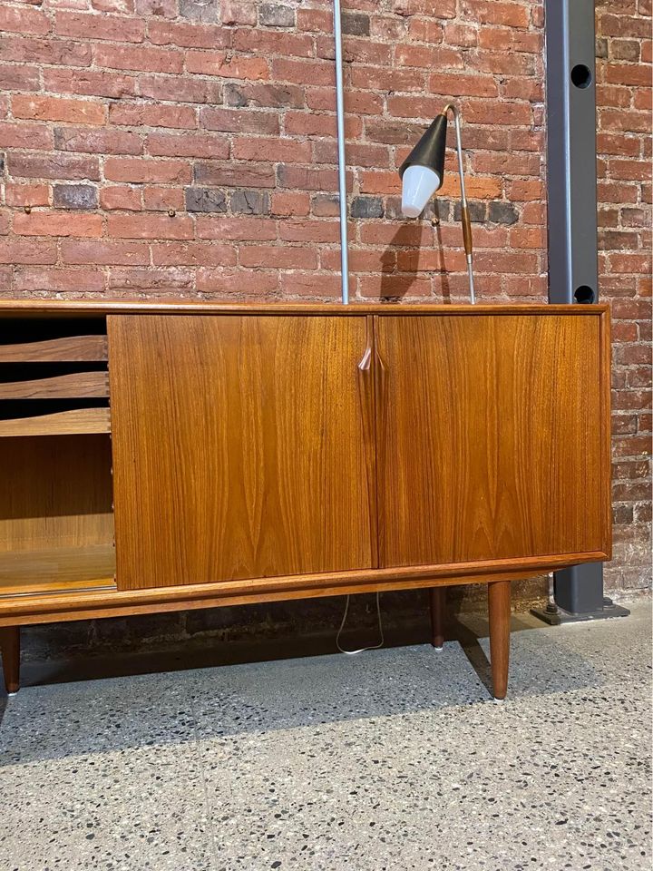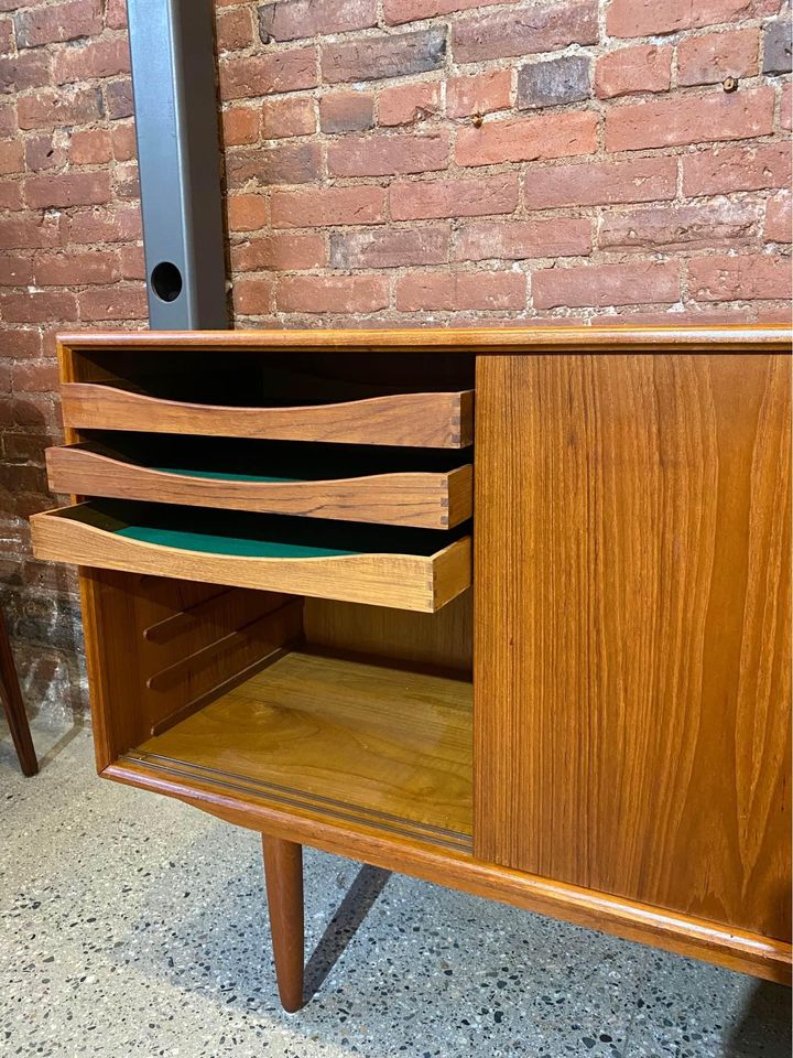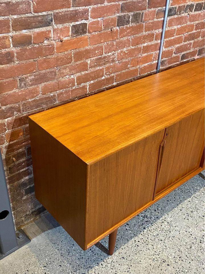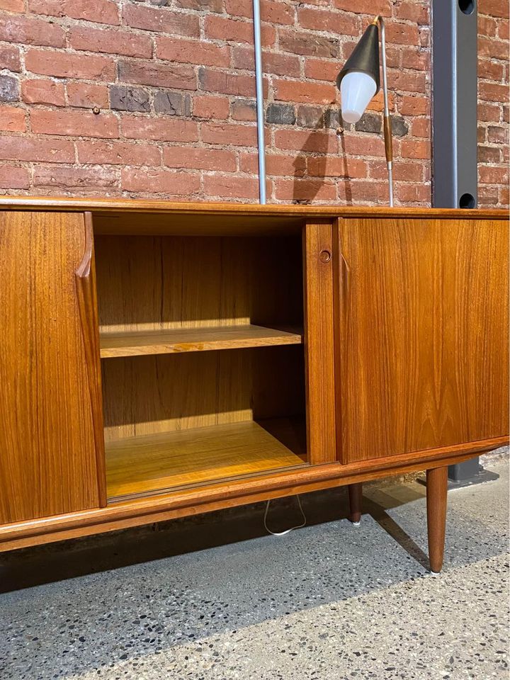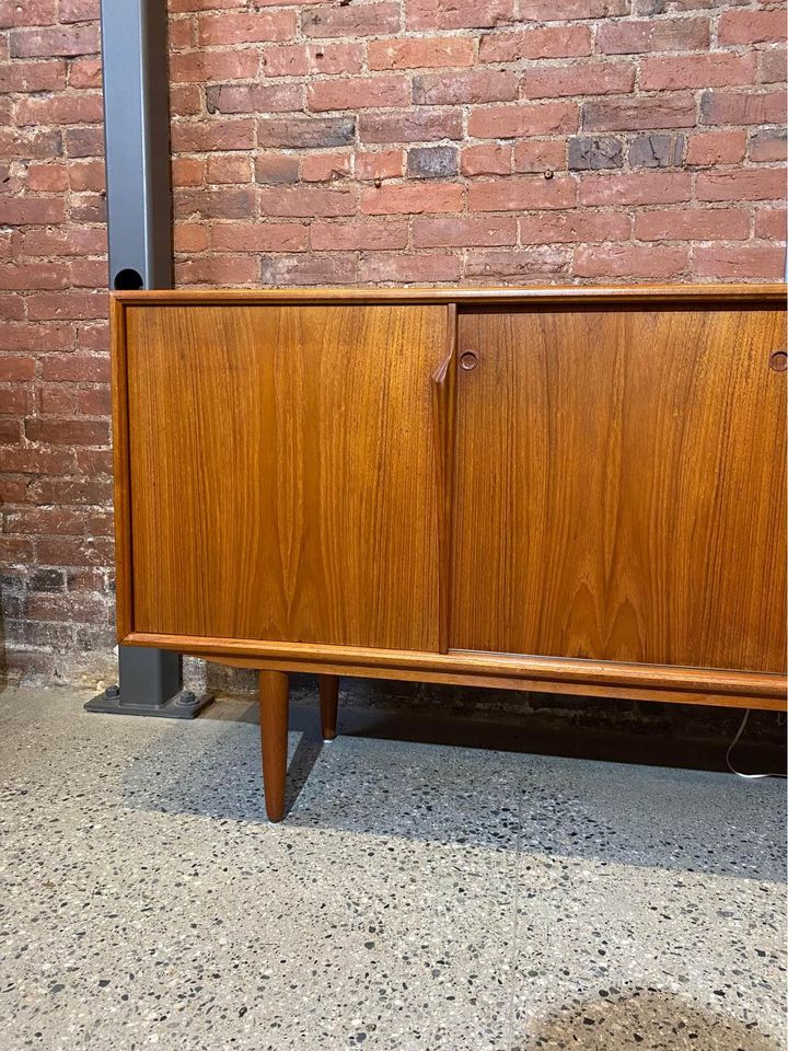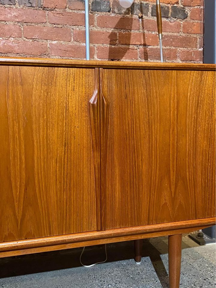 Timeless 1960s Danish teak credenza with sculptural pulls, tapered legs, and high quality construction. This piece is freshly restored and in excellent condition. A few faint marks on top.