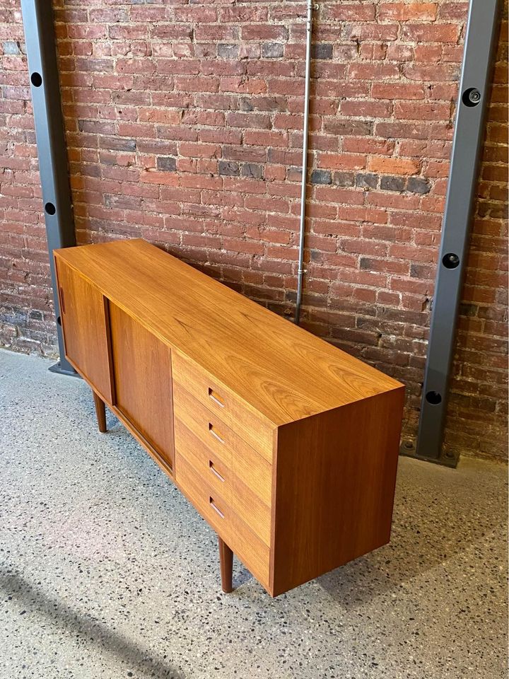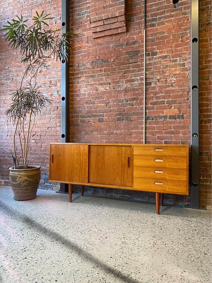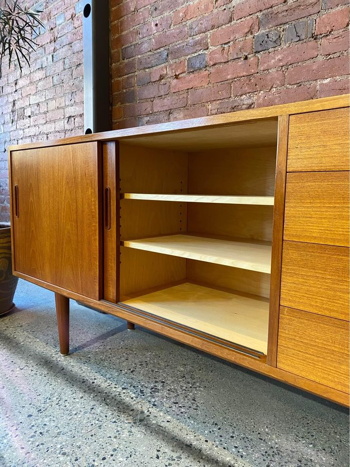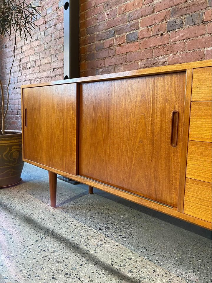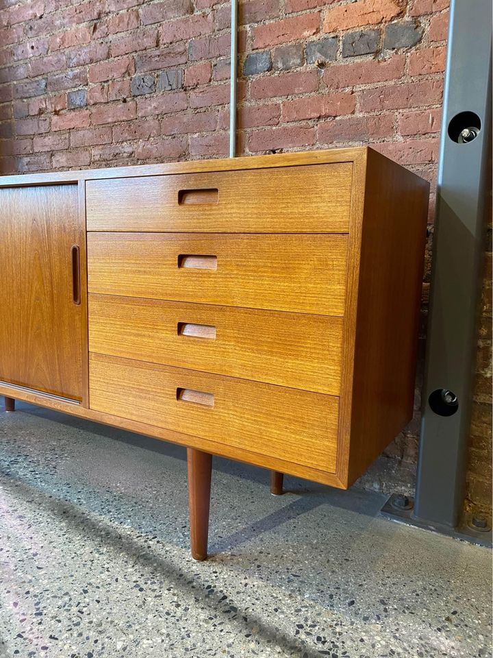 This exceptional Danish teak credenza from the 1960s is a true testament to mid-century design excellence. Crafted with precision, it features sliding doors that effortlessly glide open to reveal ample storage space. The solid wood dovetailed drawer fronts not only enhance its durability but also exude a sense of timeless elegance. With a fully finished back, this credenza is versatile and can be placed anywhere in a room. Meticulously preserved in exceptional condition, it stands as a stunning example of Danish craftsmanship that will elevate any interior setting.