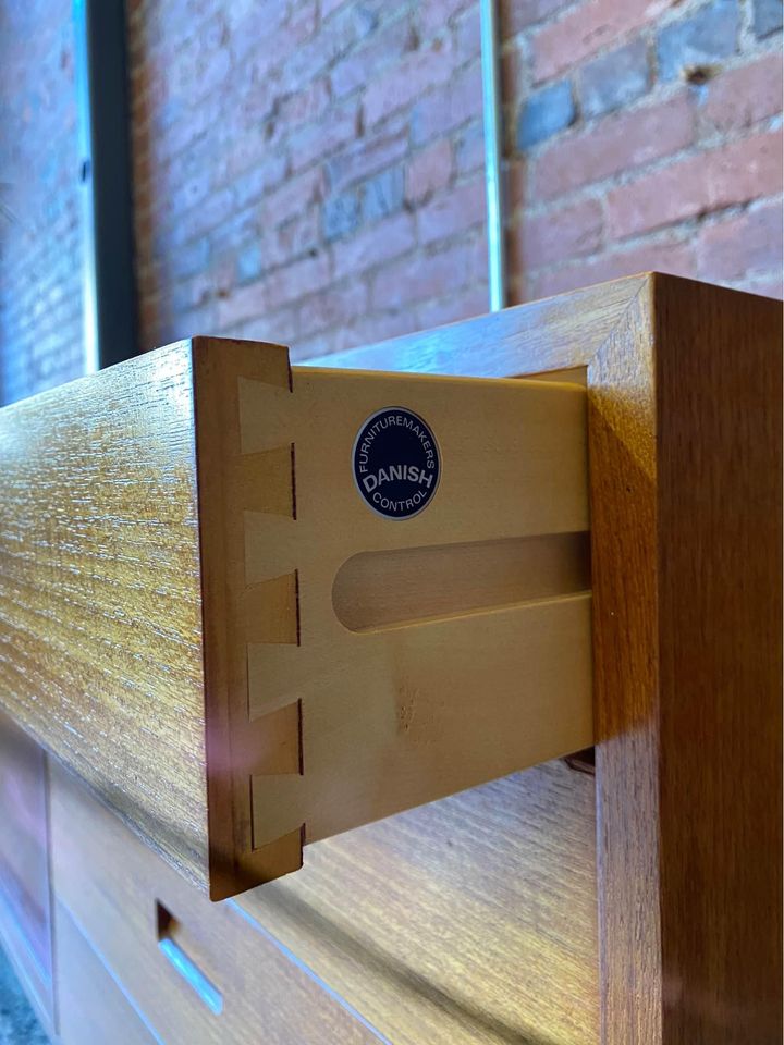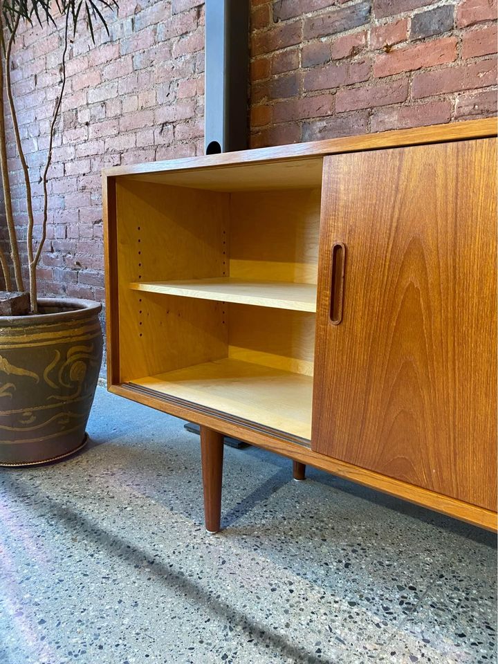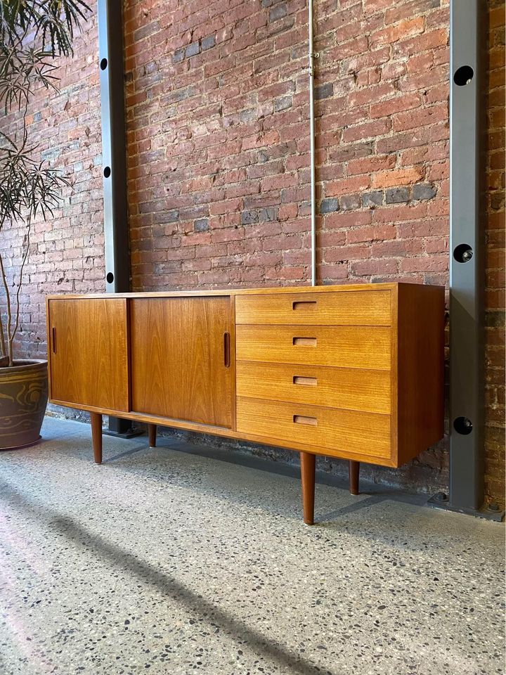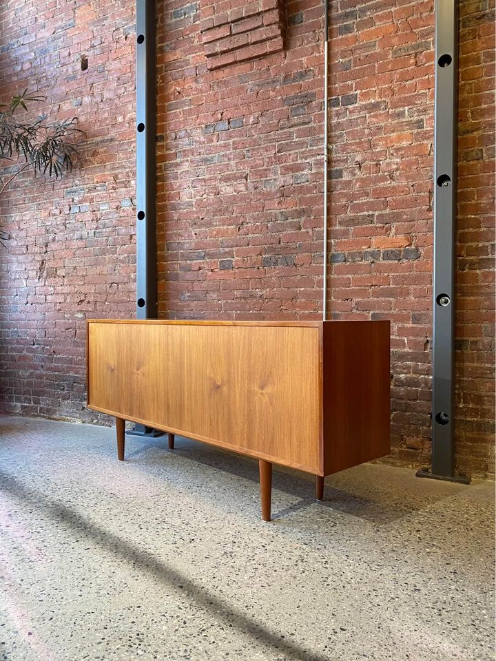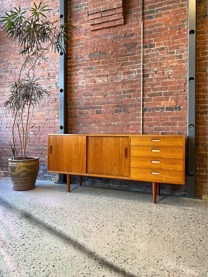 This exceptional Danish teak credenza from the 1960s is a true testament to mid-century design excellence. Crafted with precision, it features sliding doors that effortlessly glide open to reveal ample storage space. The solid wood dovetailed drawer fronts not only enhance its durability but also exude a sense of timeless elegance. With a fully finished back, this credenza is versatile and can be placed anywhere in a room. Meticulously preserved in exceptional condition, it stands as a stunning example of Danish craftsmanship that will elevate any interior setting.