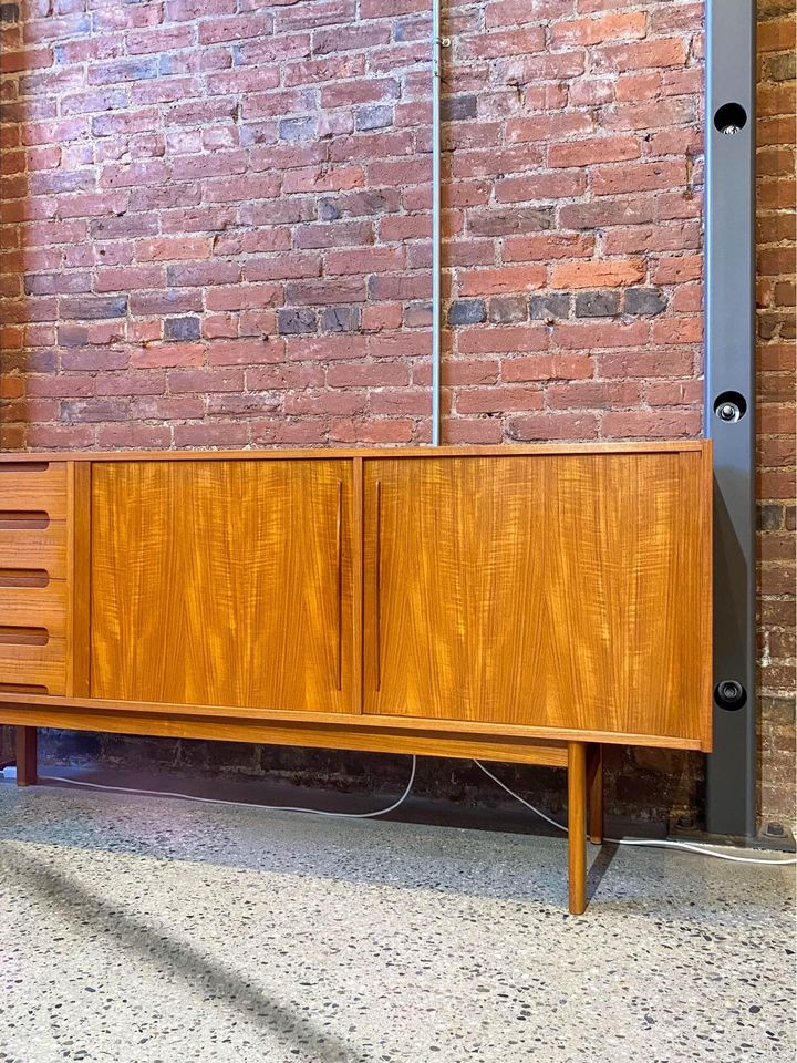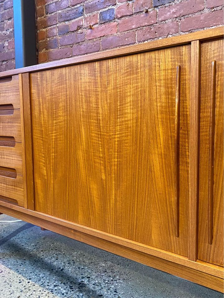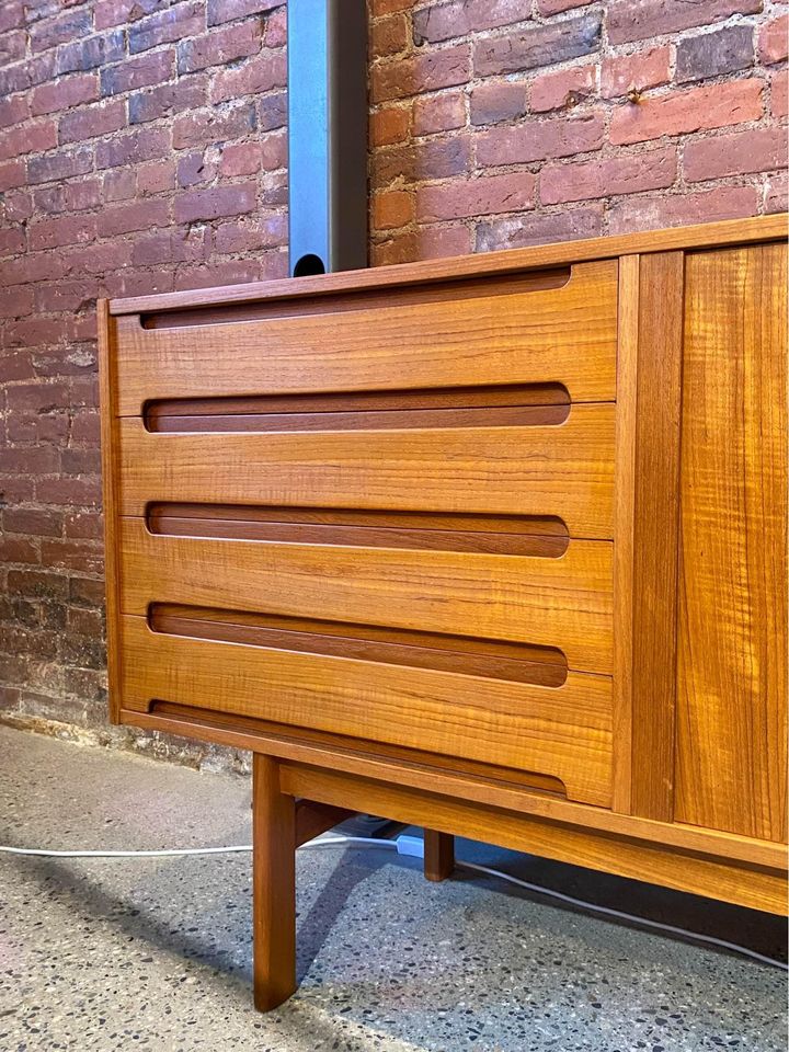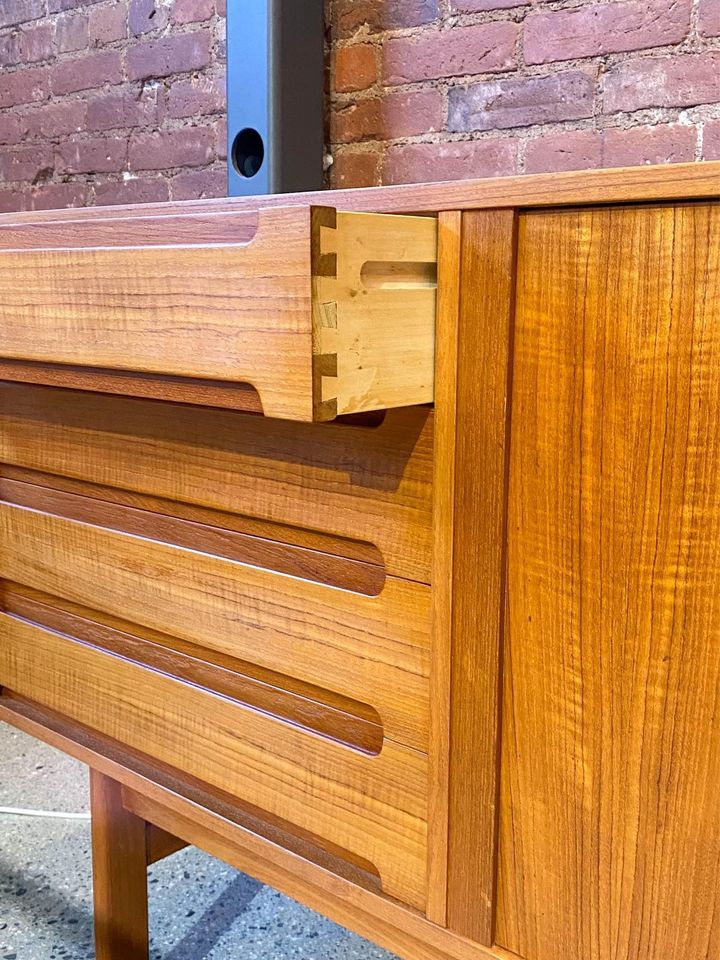 A Danish teak credenza from the 1960s, showcasing exquisite graining and exceptional condition. This piece boasts a generous bank of dovetailed drawers crafted from solid wood, accompanied by a skillfully constructed base. Additionally, it incorporates a pair of cupboard-style doors, housing adjustable shelving within.