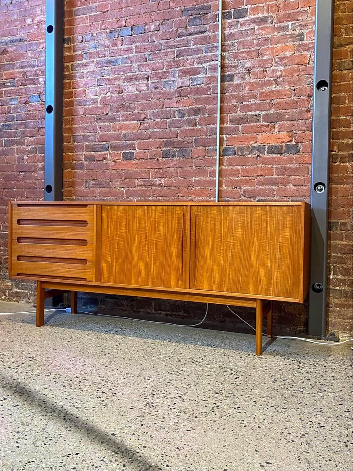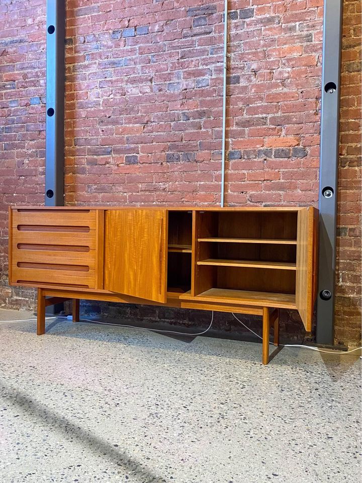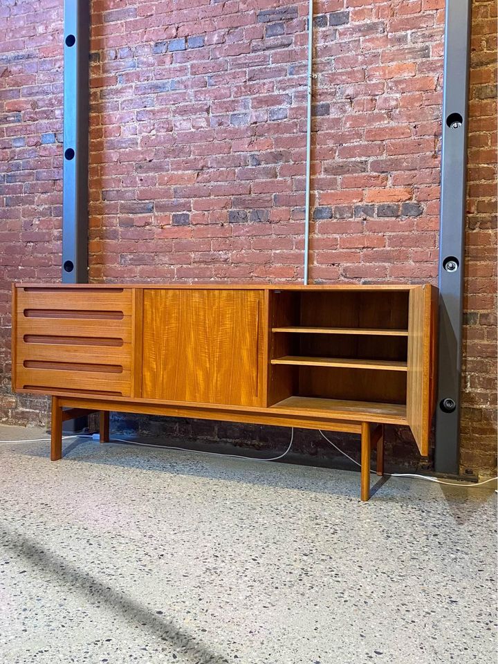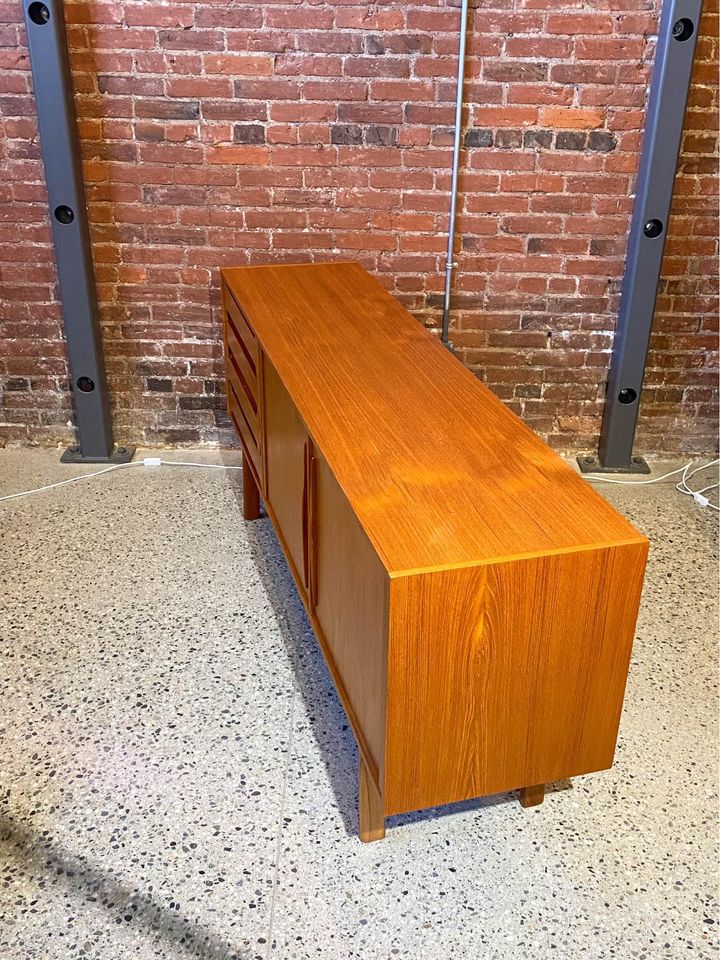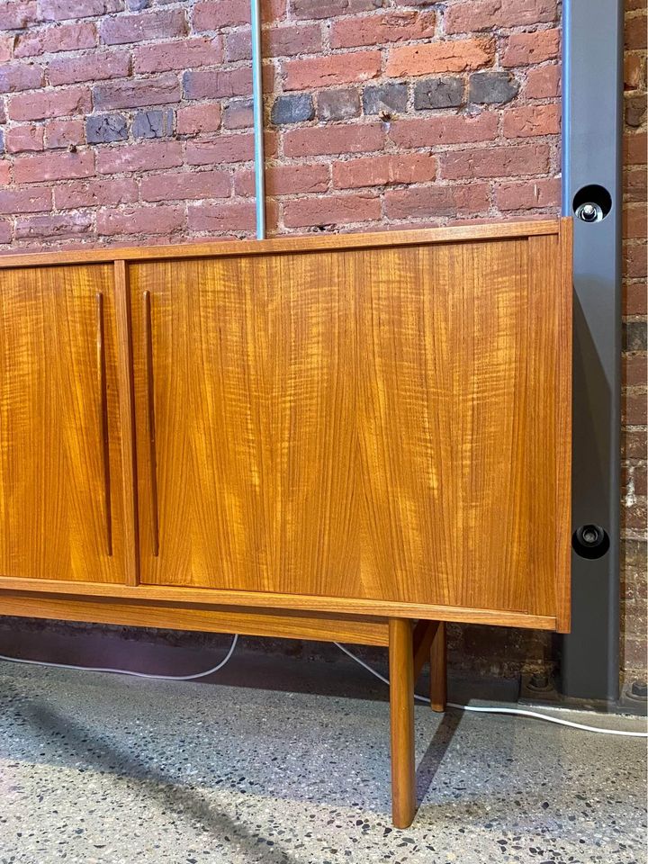 A Danish teak credenza from the 1960s, showcasing exquisite graining and exceptional condition. This piece boasts a generous bank of dovetailed drawers crafted from solid wood, accompanied by a skillfully constructed base. Additionally, it incorporates a pair of cupboard-style doors, housing adjustable shelving within.