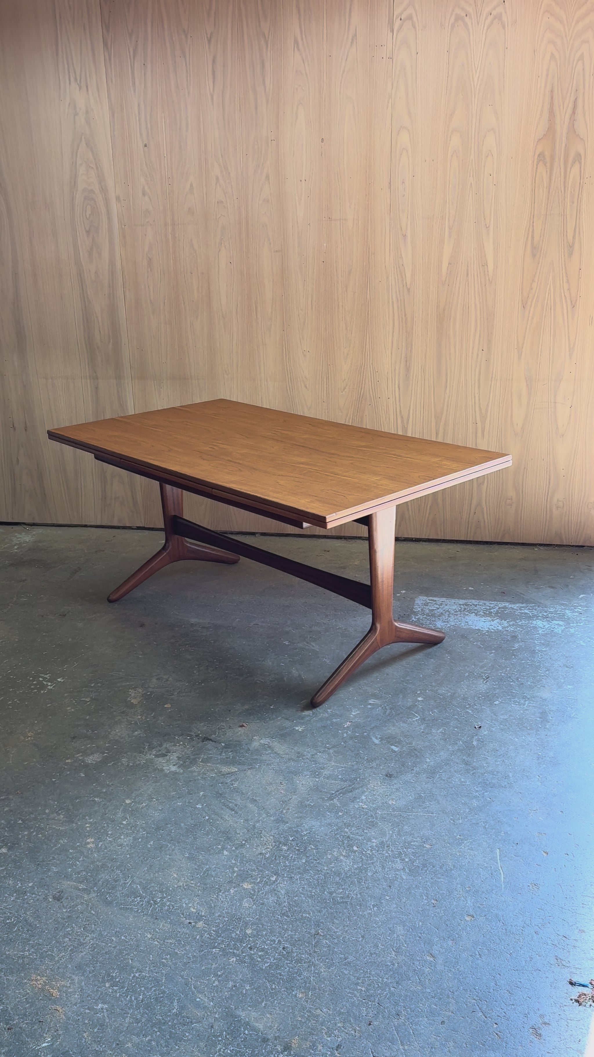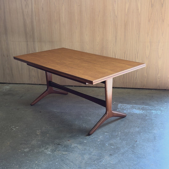 Meticulously restored by our team, the table showcases Hovmand-Olsen’s signature blend of elegance and craftsmanship. The solid teak base features beautifully contoured Y-shaped legs, exposed brass hardware, and an architectural stretcher that adds both strength and presence. The teak top reveals two seamless draw-leaf extensions that glide out smoothly, allowing you to expand the table from everyday use to full entertaining mode in seconds.